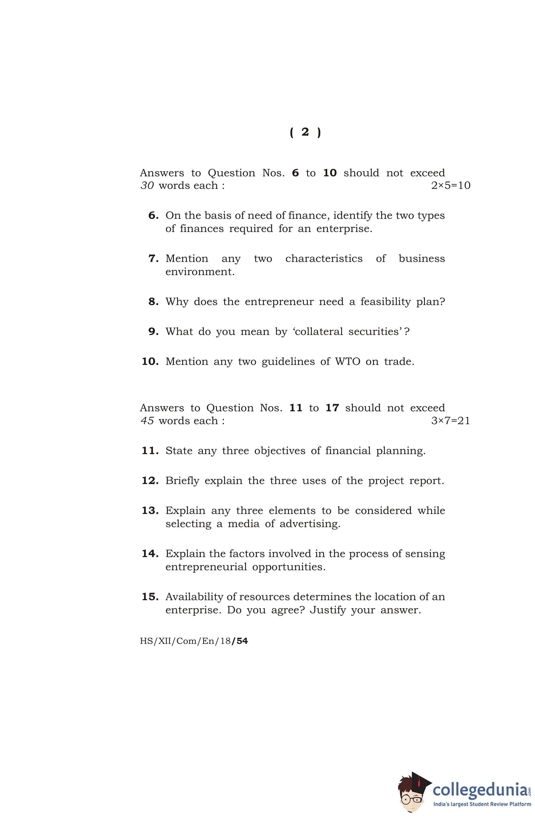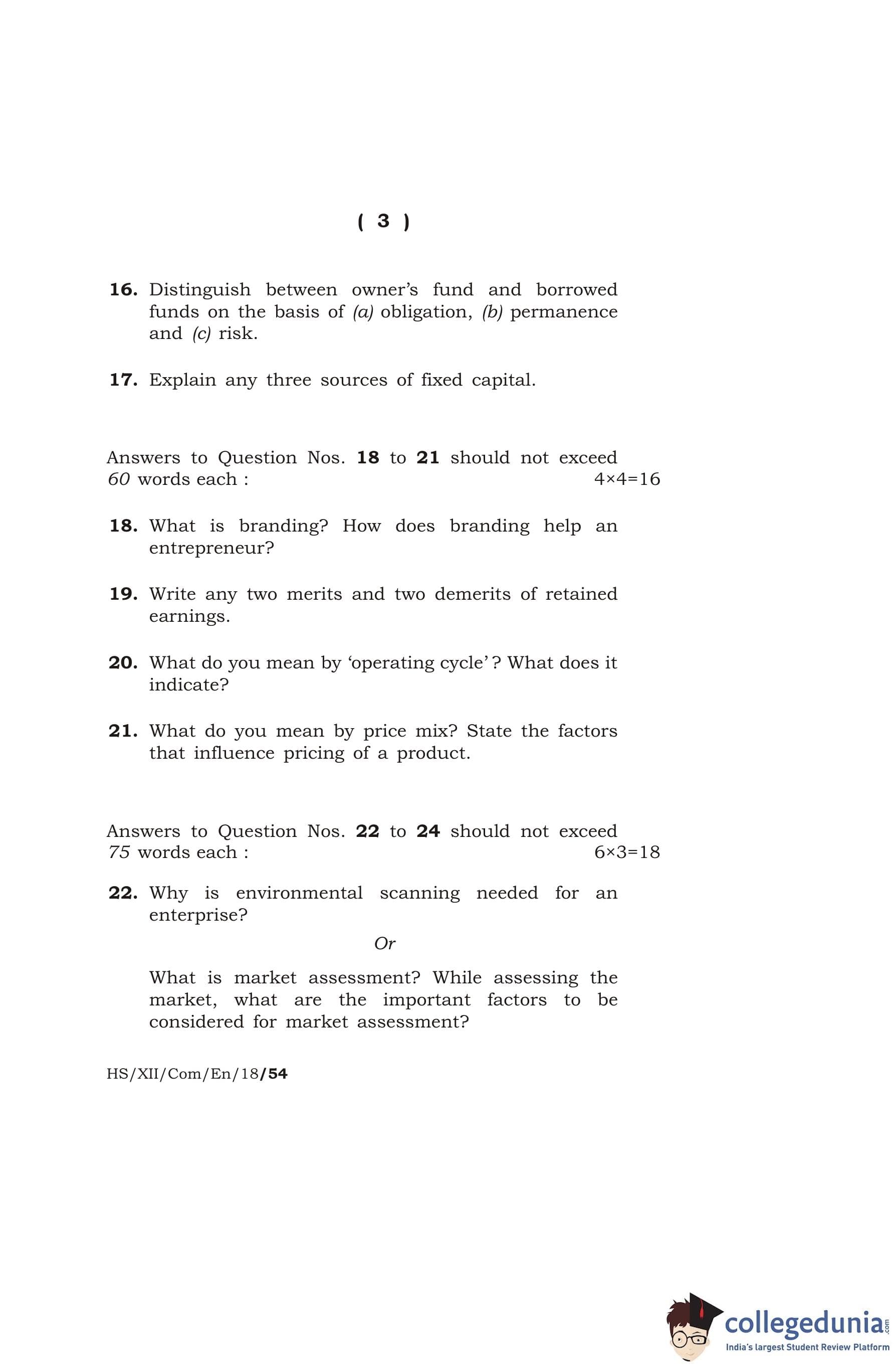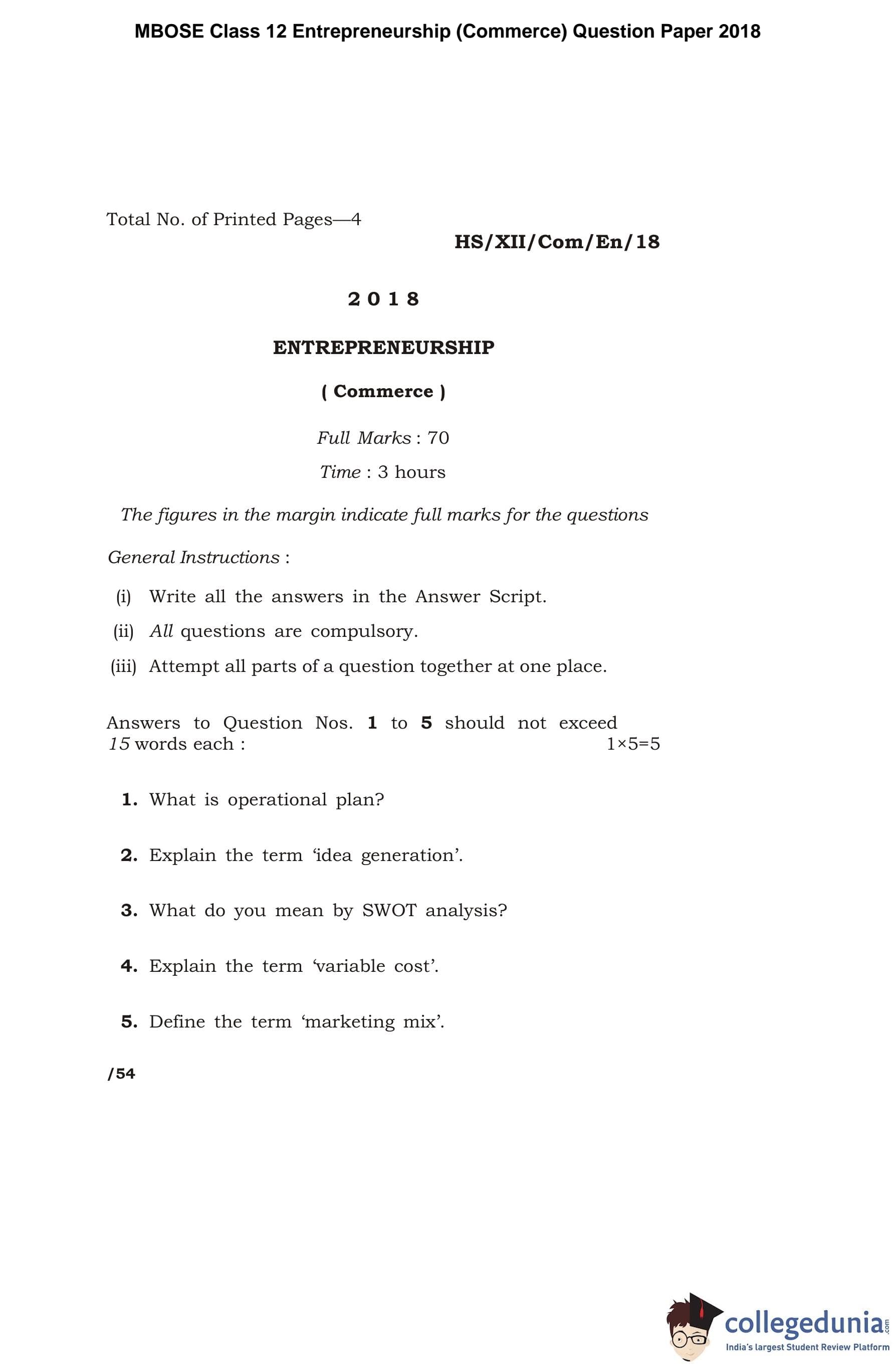MBOSE Class 12 Entrepreneurship (Commerce) Question Paper 2018 with Answer Key