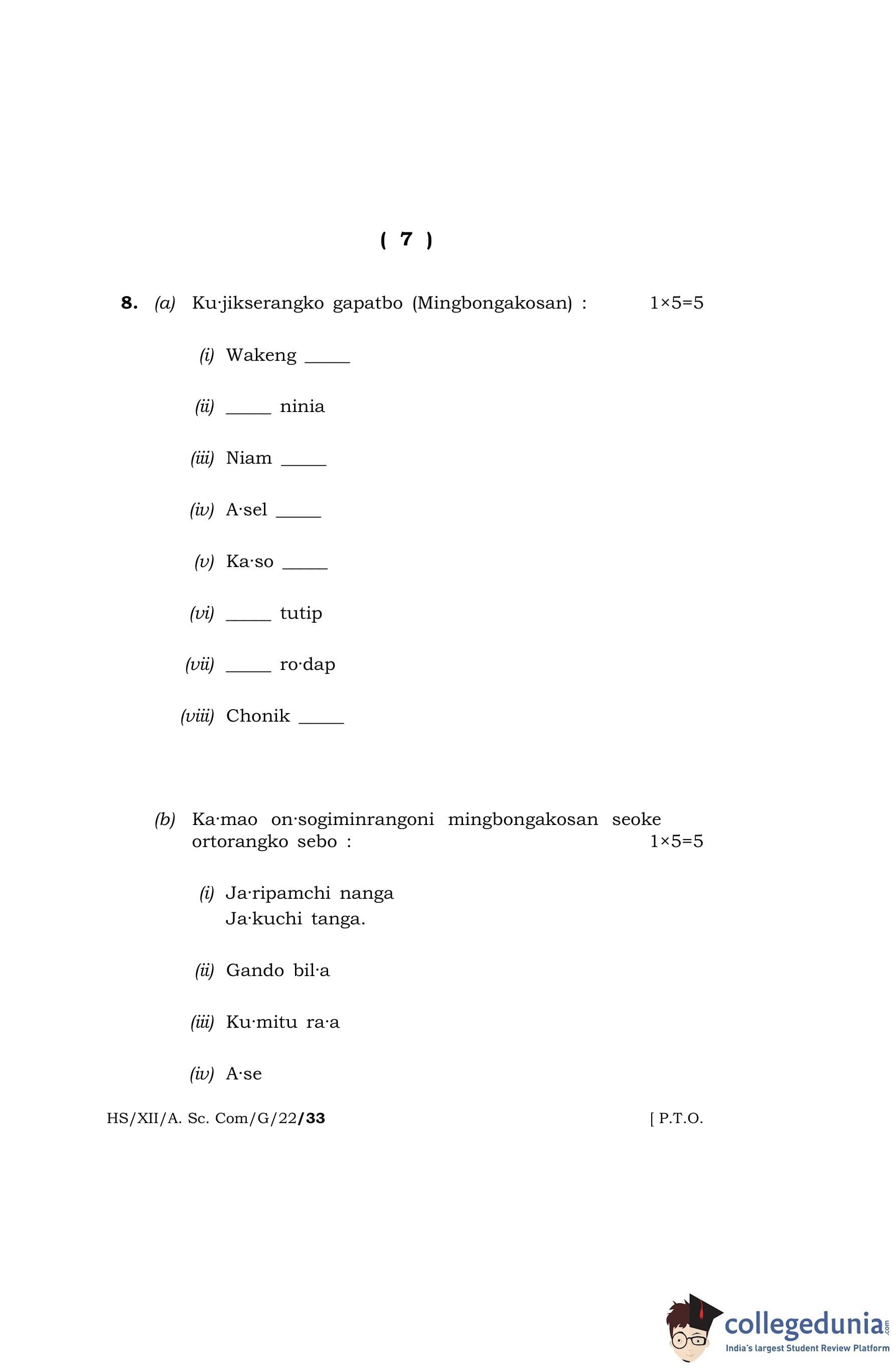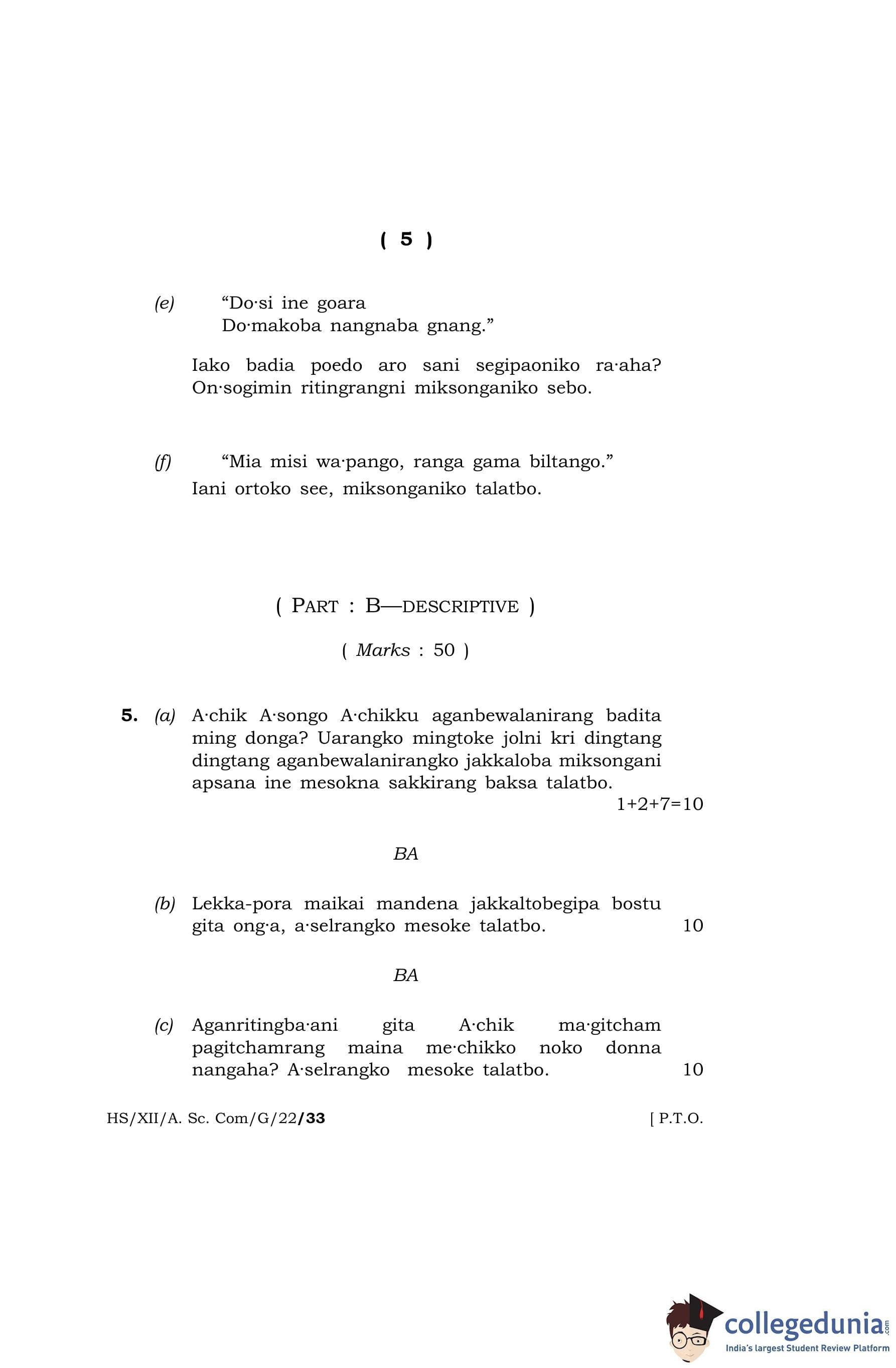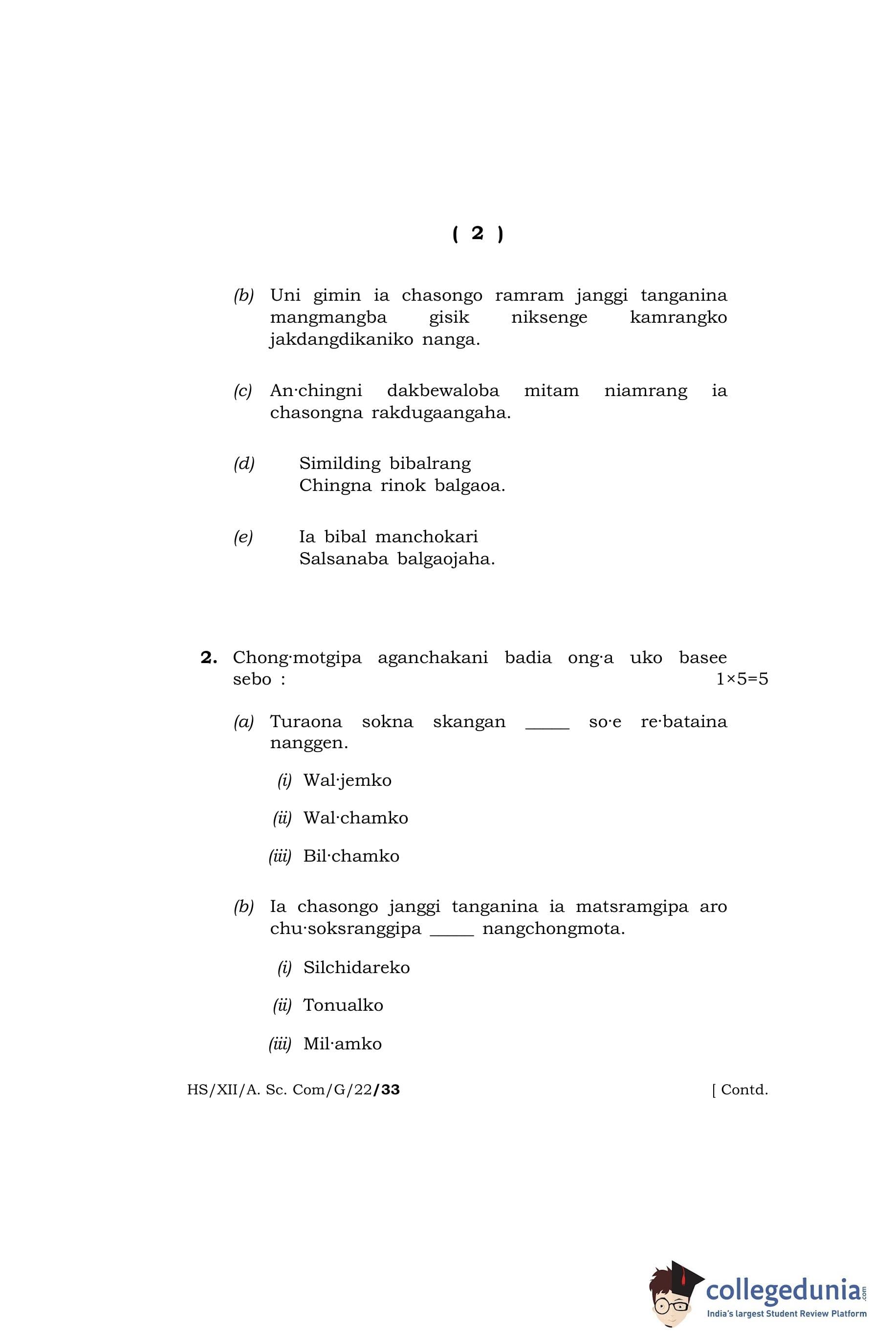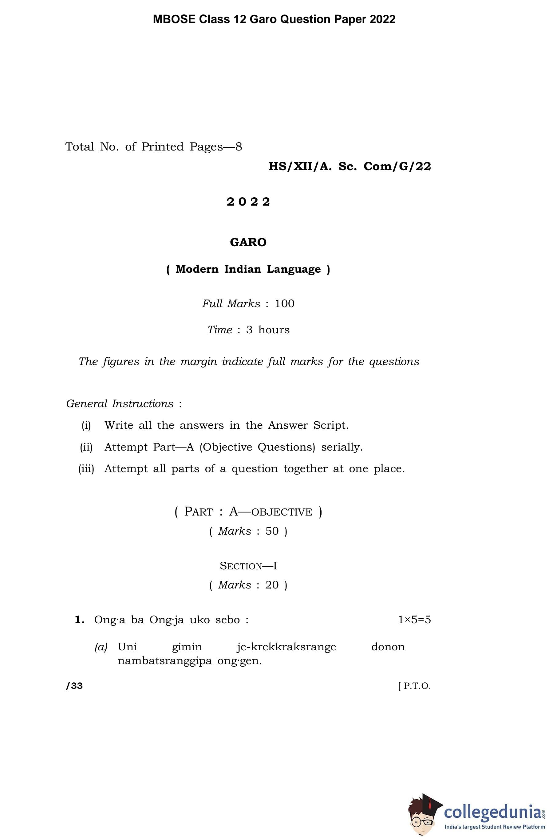 MBOSE Class 12 Garo Question Paper 2022 with Answer Key pdf is available for download here. The exam was conducted by Meghalaya Board of School Education on March 29, 2022 in the Morning Session 10 AM to 1 PM. The question paper comprised a total of 9 questions divided among 2 sections.