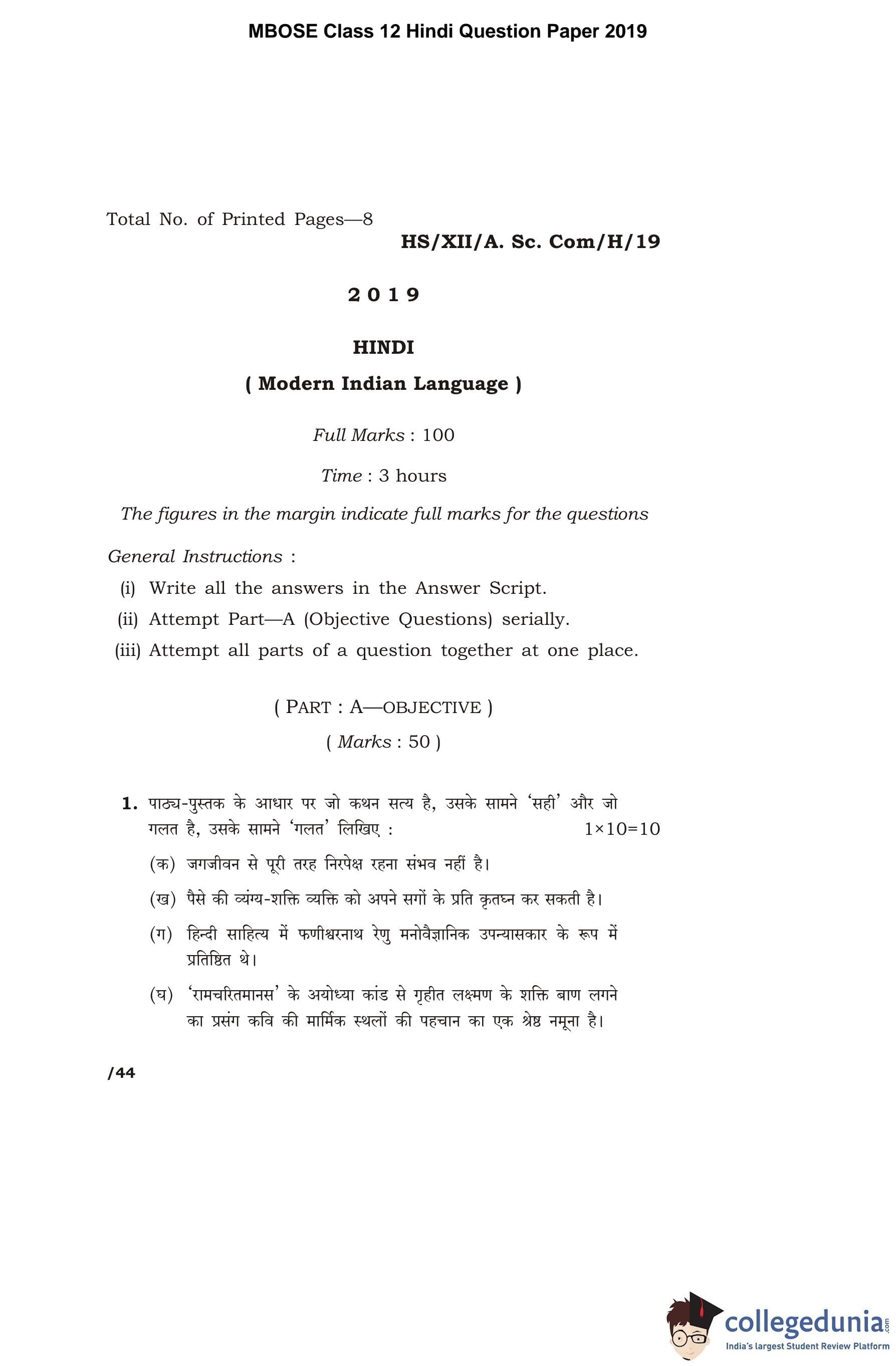 | MBOSE Class 12 Hindi Question Paper 2019 PDF | MBOSE Class 12 Hindi Answer Key 2019 PDF |