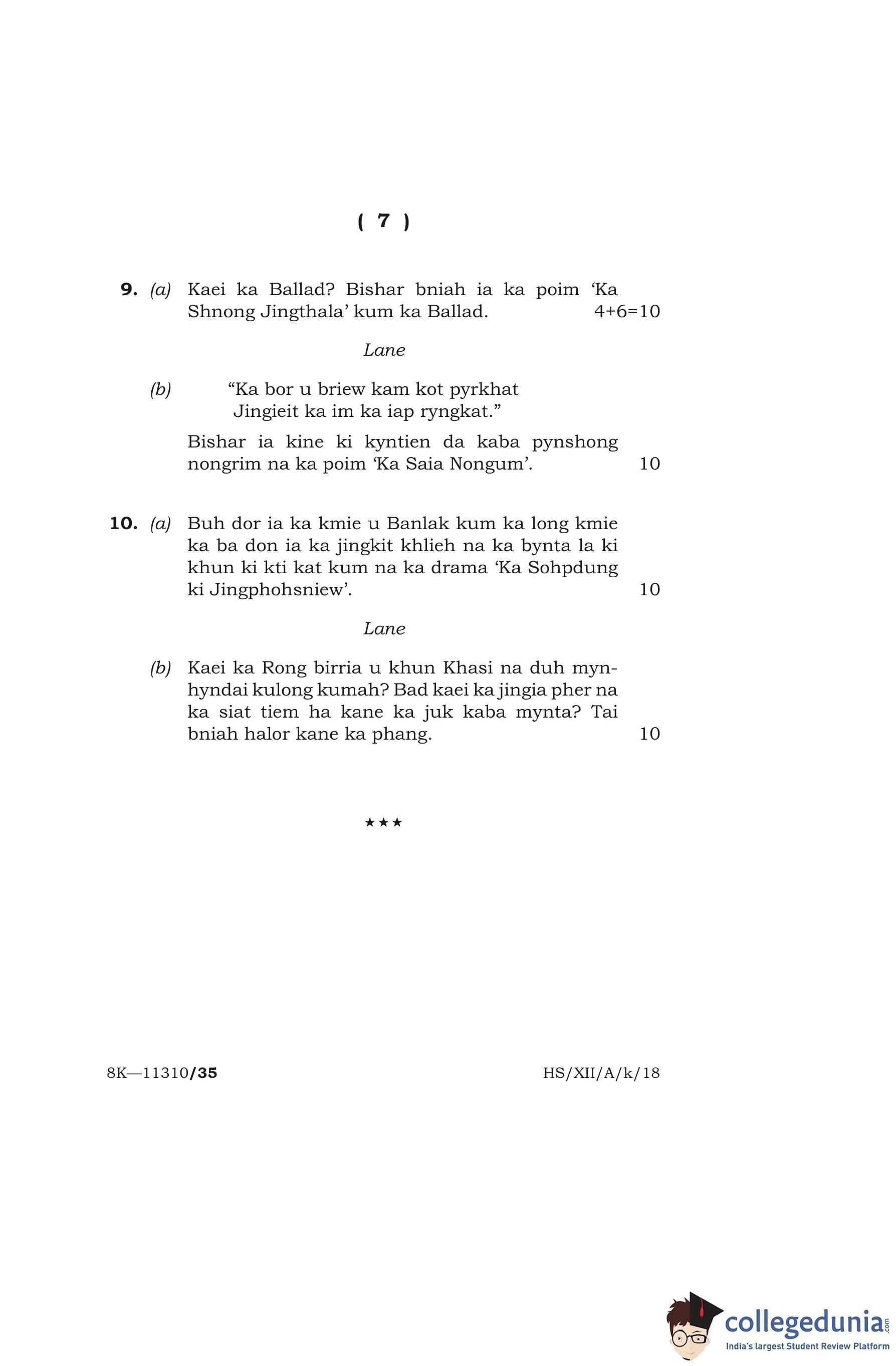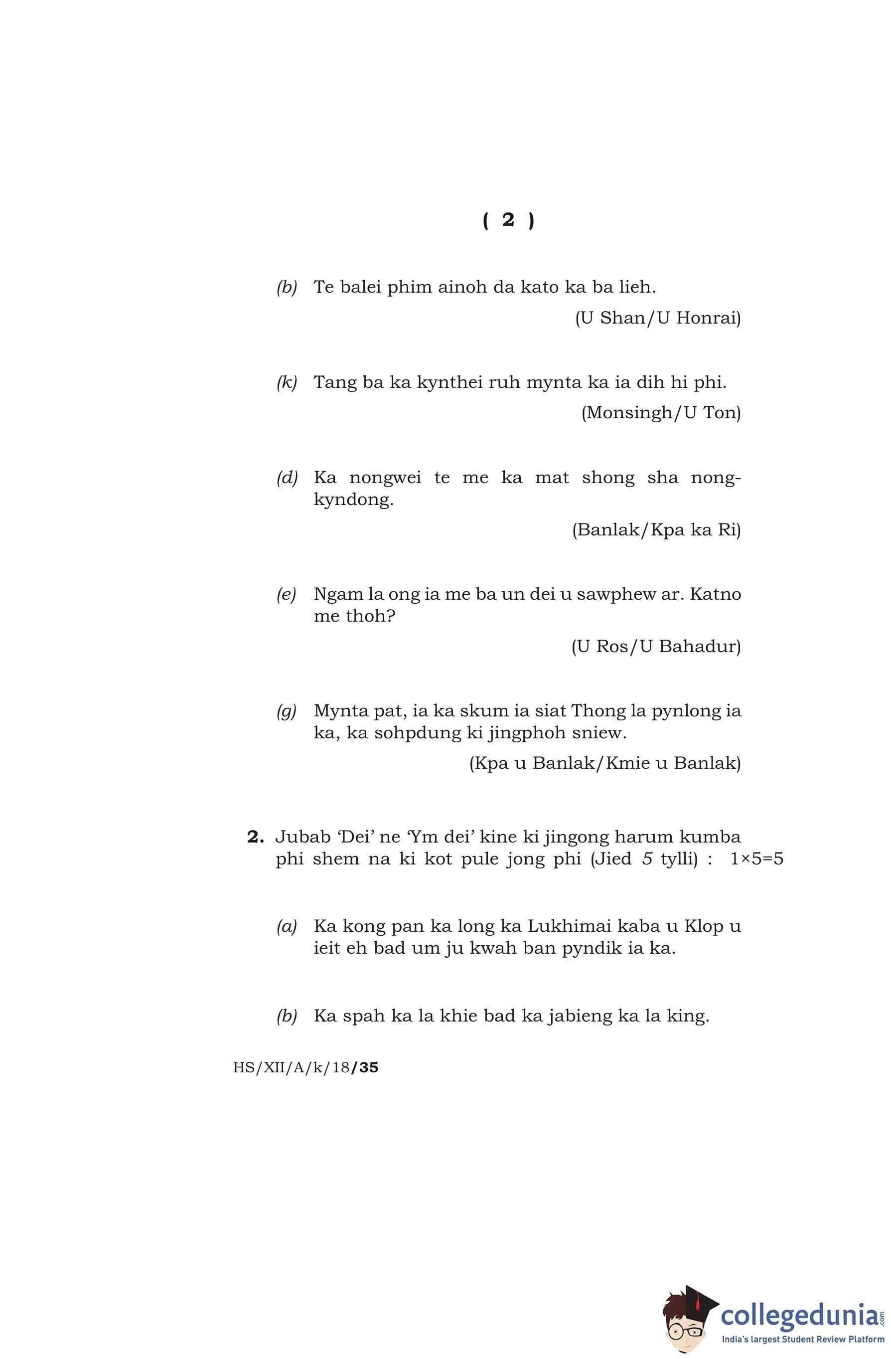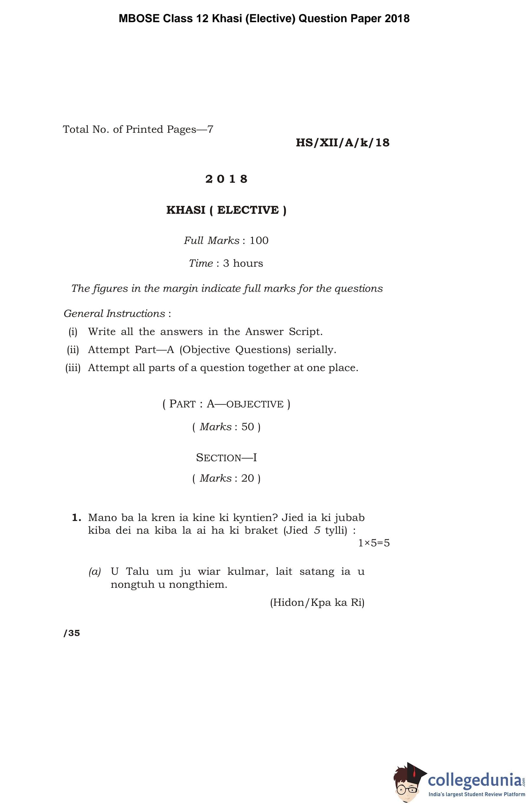 MBOSE Class 12 Khasi (Elective) Question Paper 2018