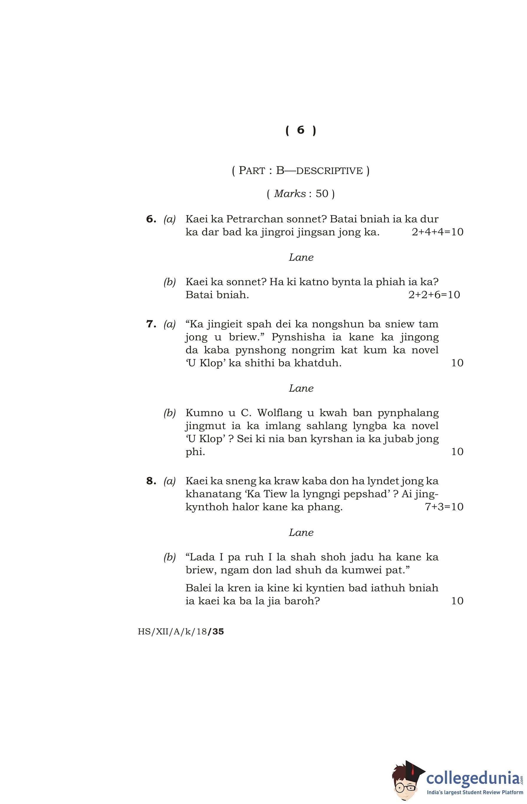 MBOSE Class 12 Khasi (Elective) Question Paper 2018 with Answer Key pdf is available for download here. The exam was conducted by Meghalaya Board of School Education on March 20, 2018 in the Morning Session 10 AM to 1 PM. The question paper comprised a total of 10 questions divided among 2 sections.