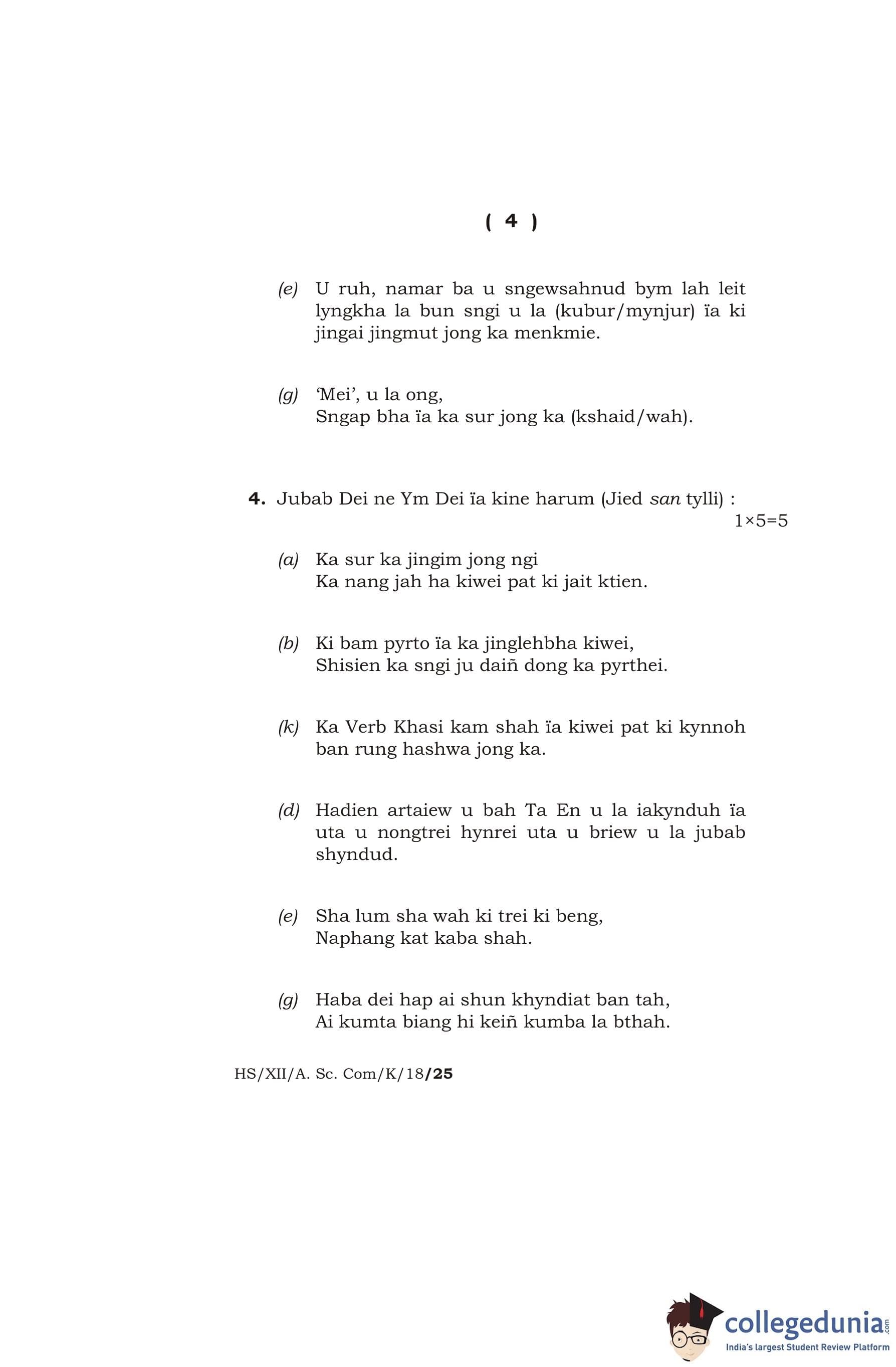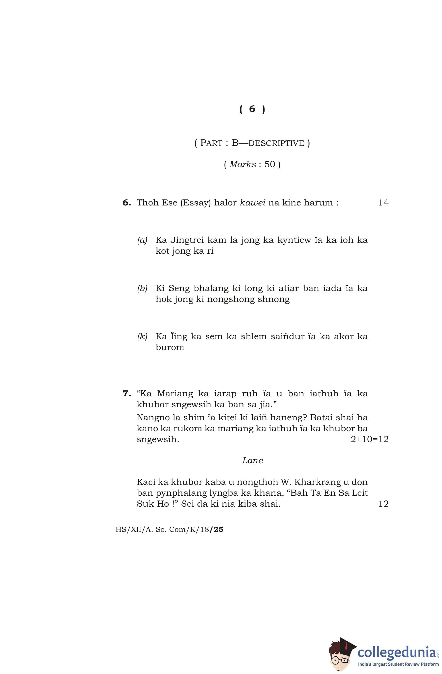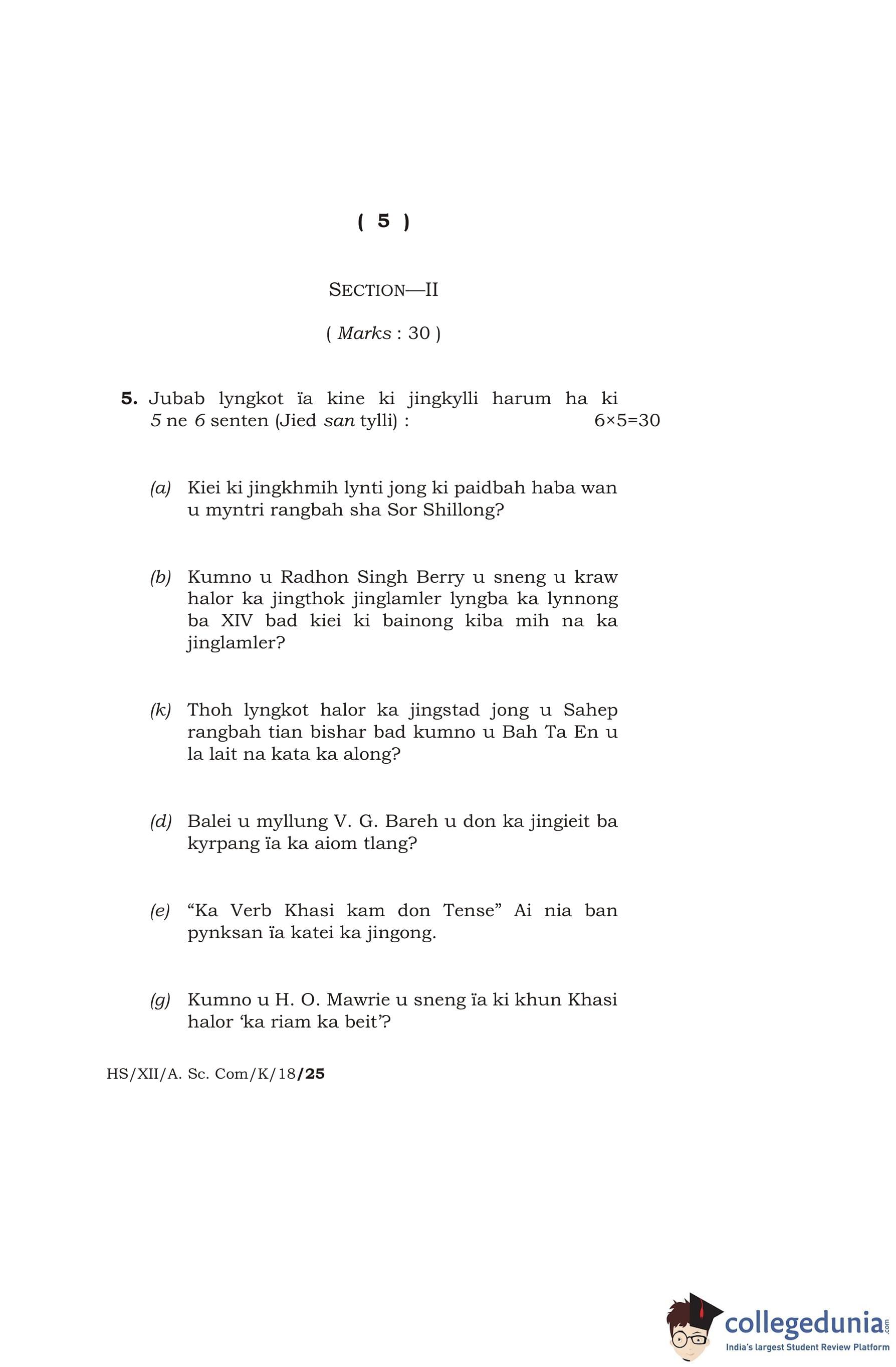 MBOSE Class 12 Khasi Question Paper 2018 with Answer Key pdf is available for download here. The exam was conducted by Meghalaya Board of School Education on March 8, 2018 in the Morning Session 10 AM to 1 PM. The question paper comprised a total of 9 questions divided among 2 sections.