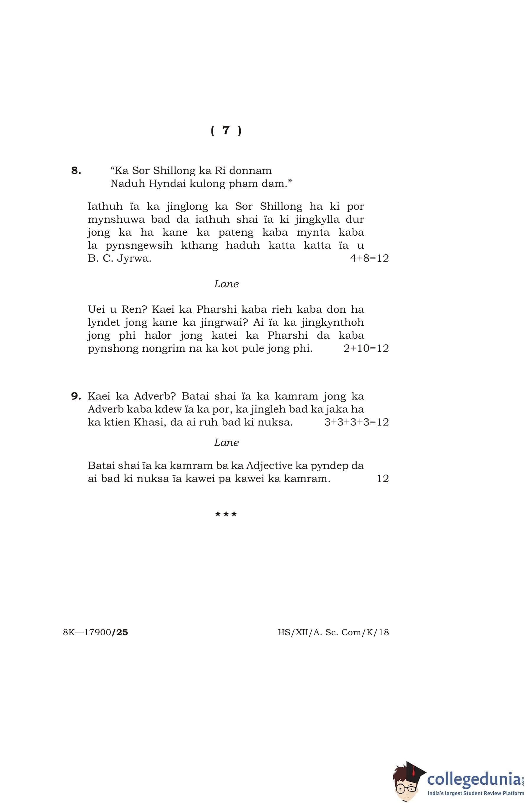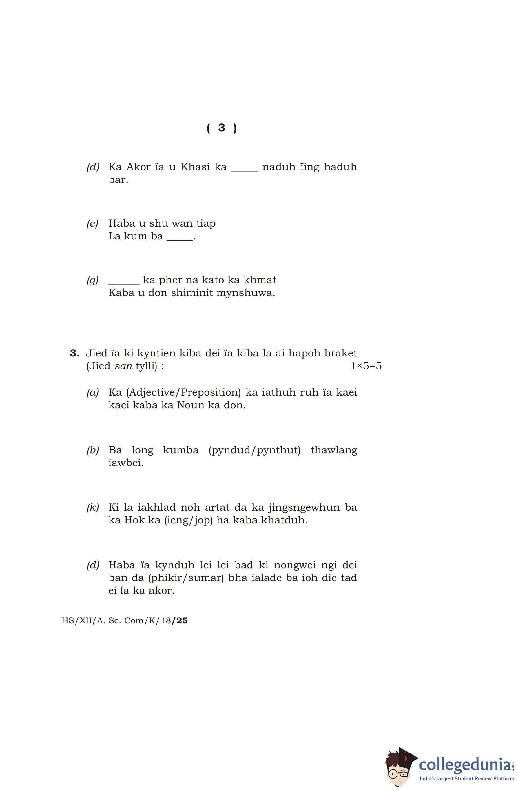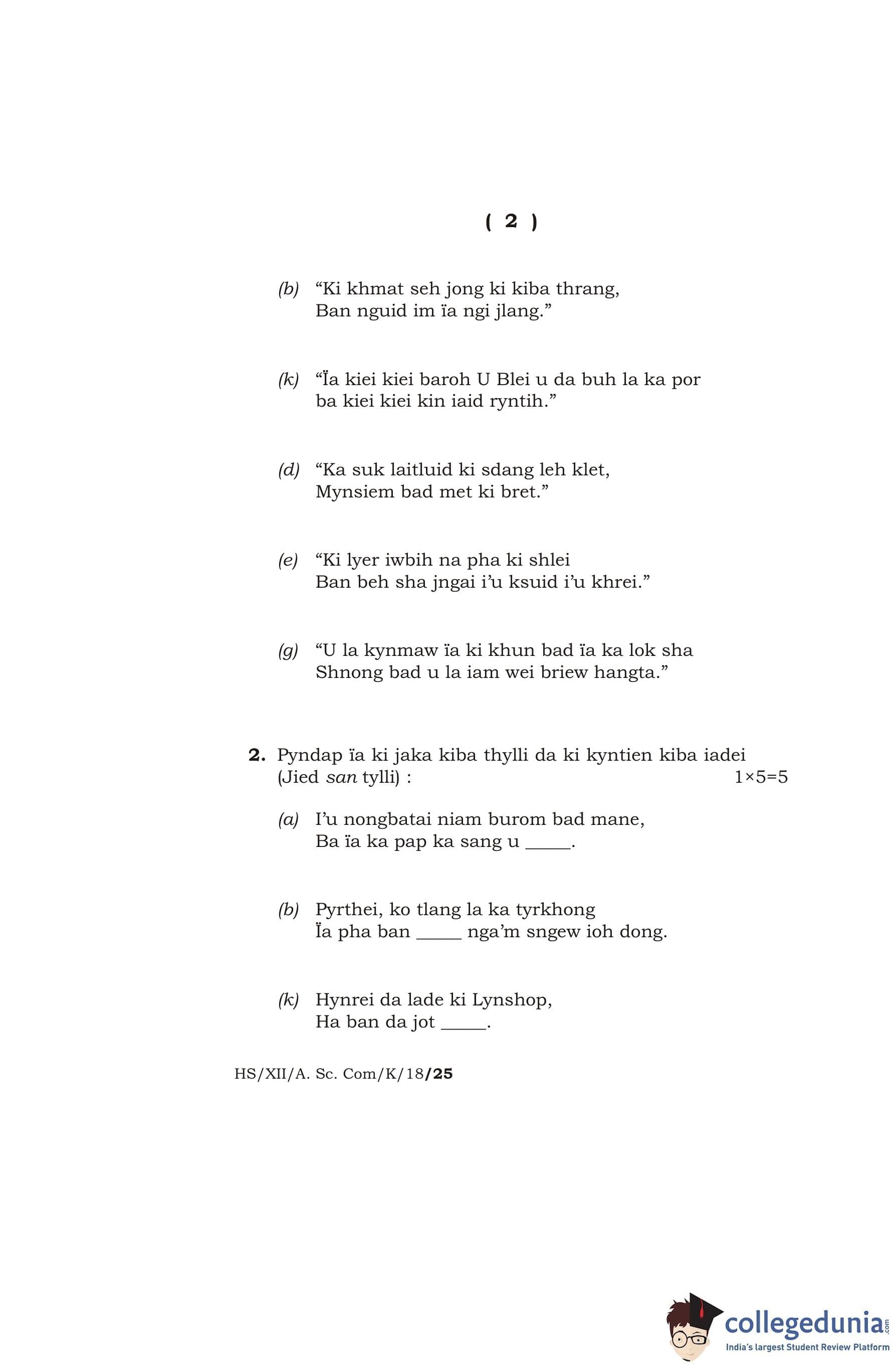 MBOSE Class 12 Khasi Question Paper 2018 with Answer Key pdf is available for download here. The exam was conducted by Meghalaya Board of School Education on March 8, 2018 in the Morning Session 10 AM to 1 PM. The question paper comprised a total of 9 questions divided among 2 sections.