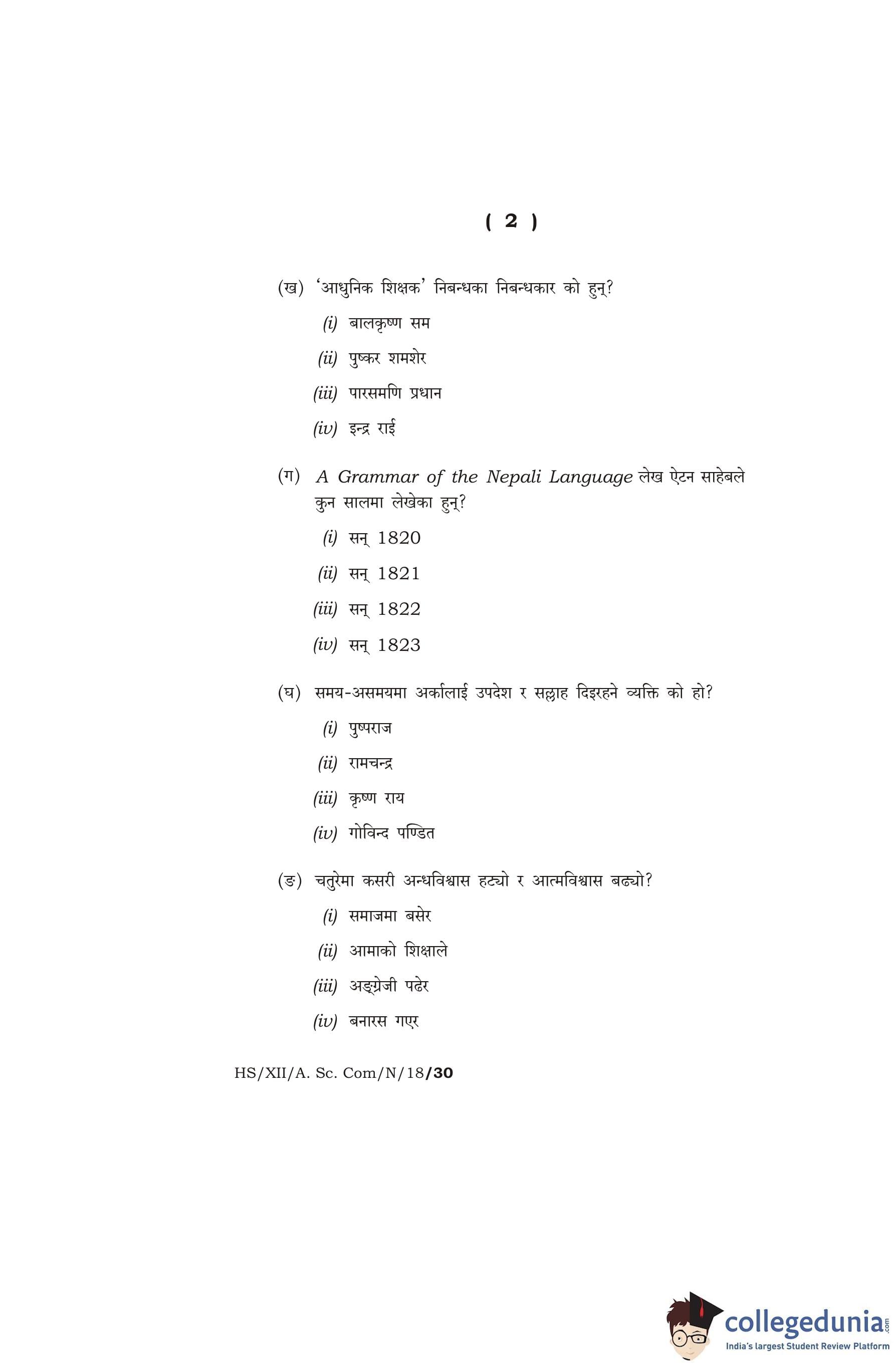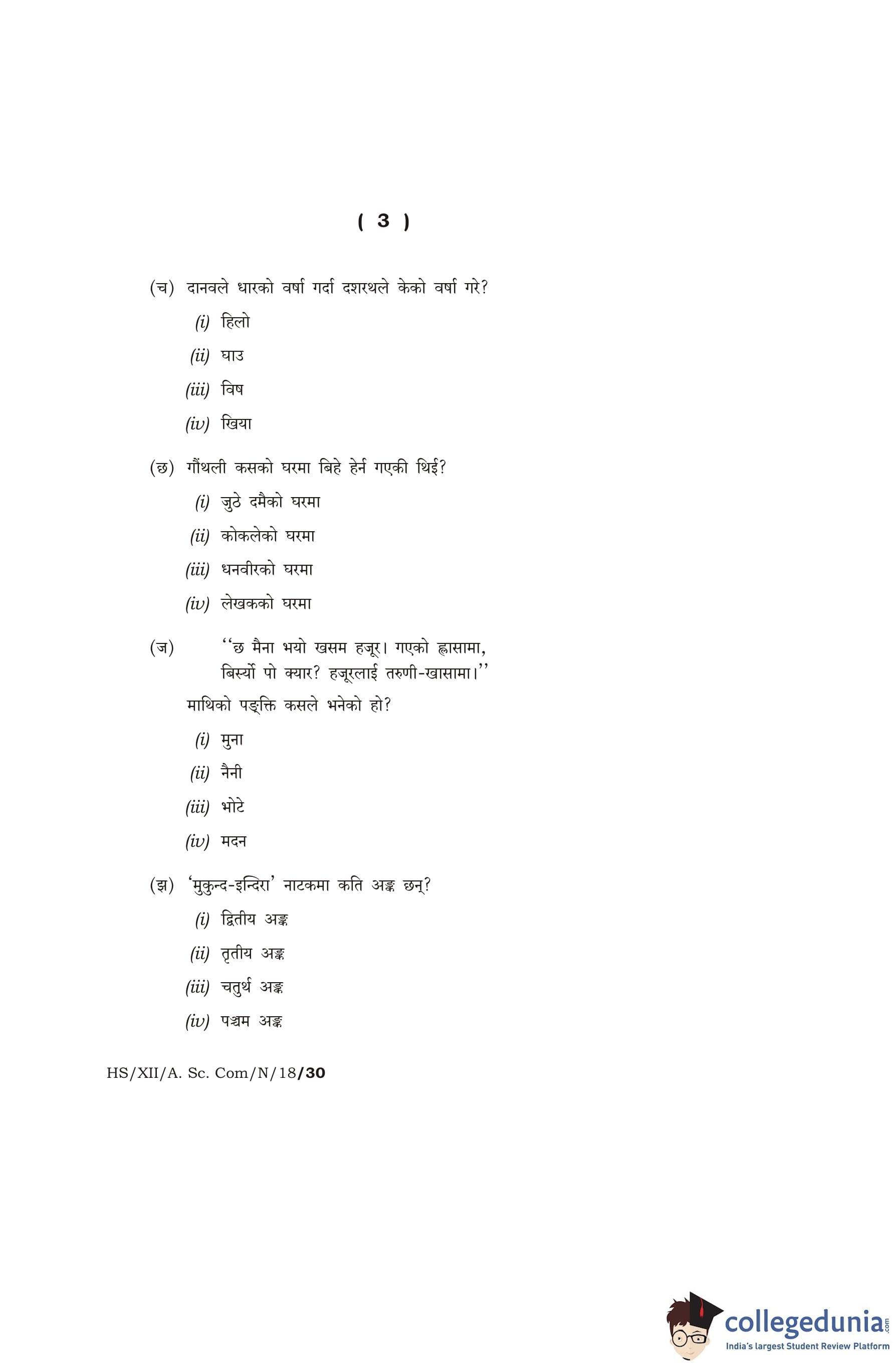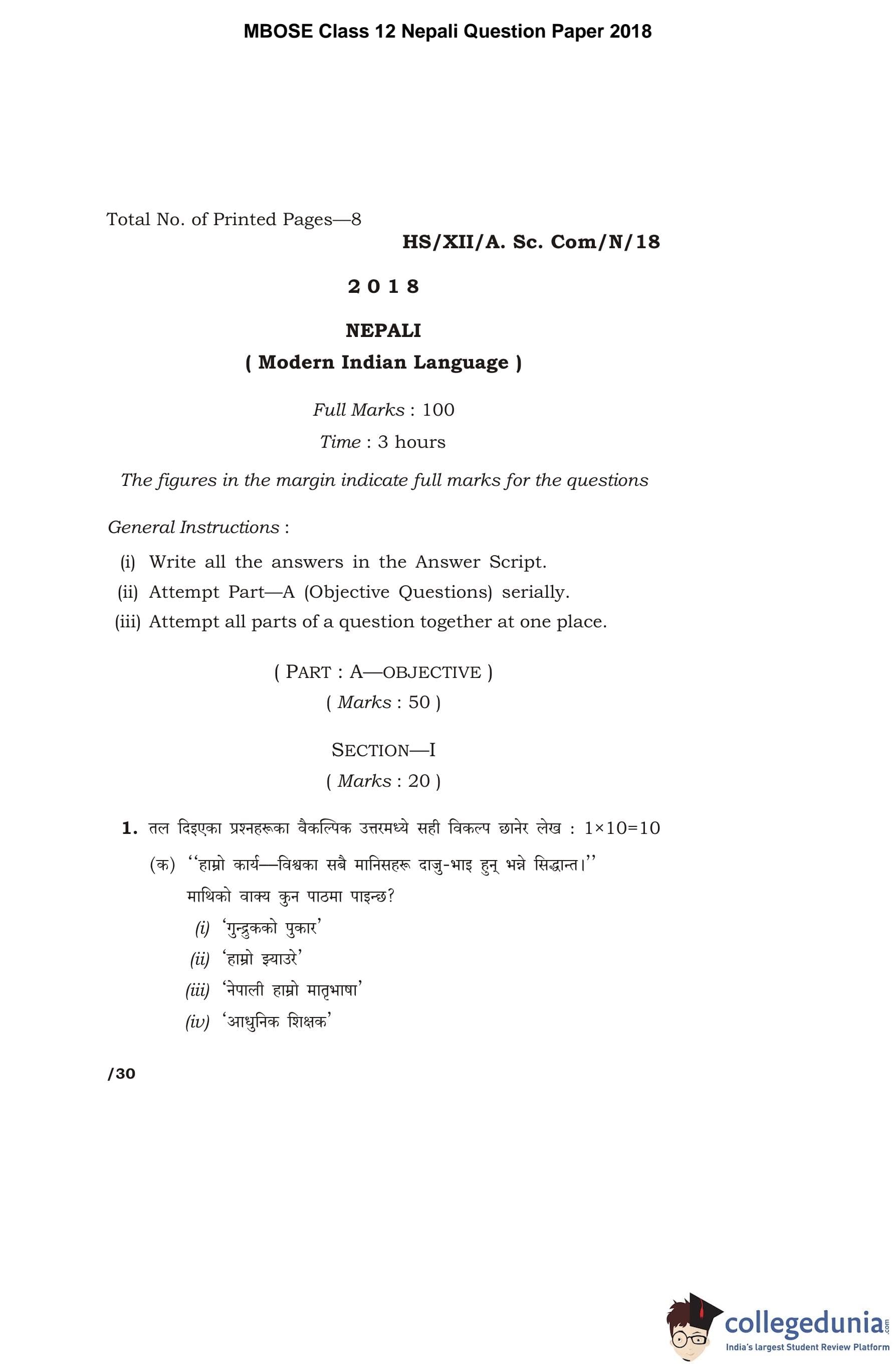 MBOSE Class 12 Nepali Question Paper 2018 with Answer Key pdf is available for download here. The exam was conducted by Meghalaya Board of School Education on March 8, 2018 in the Morning Session 10 AM to 1 PM. The question paper comprised a total of 13 questions divided among 2 sections.
