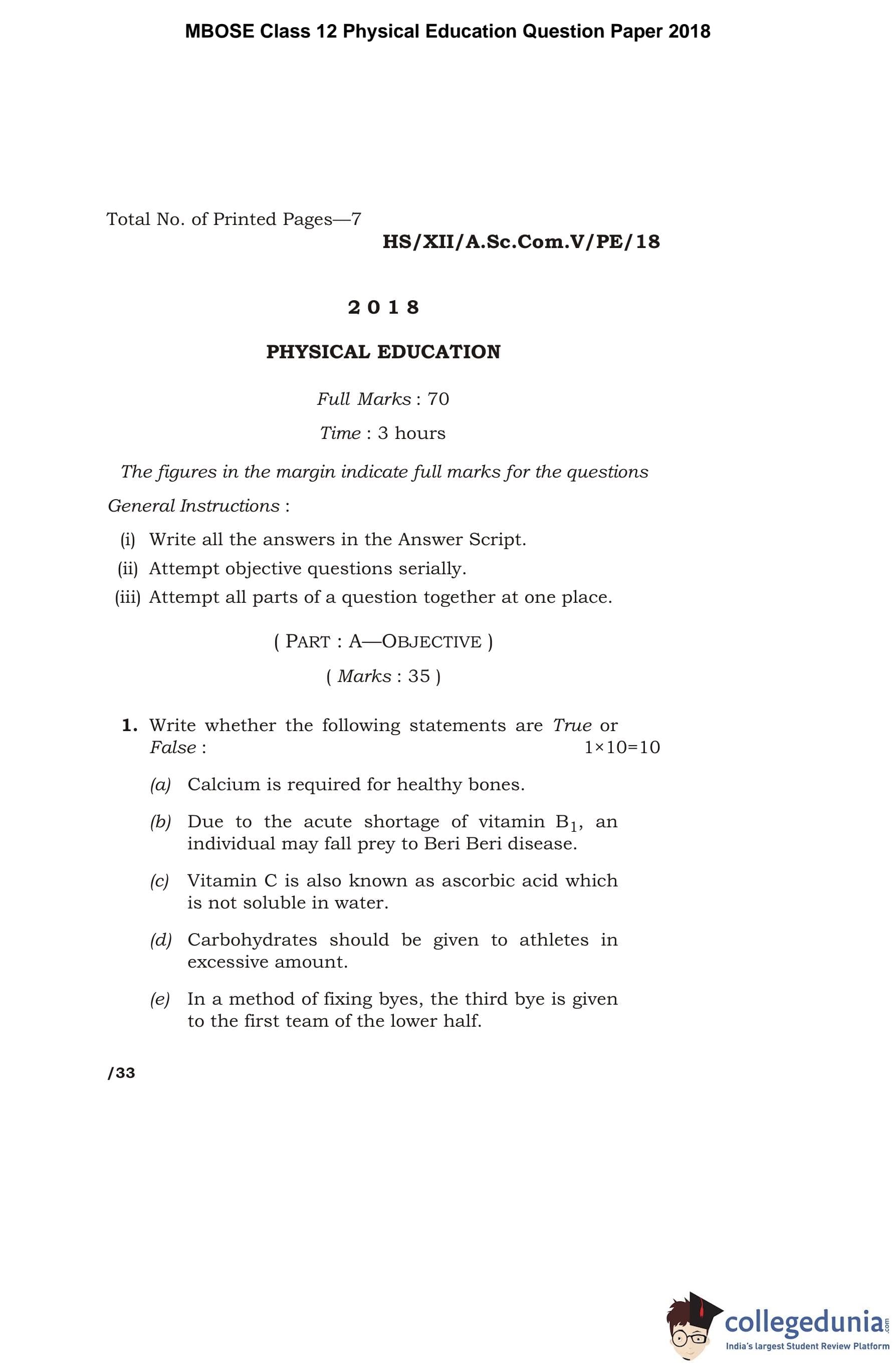 | MBOSE Class 12 Physical Education Question Paper 2018 PDF | MBOSE Class 12 Physical Education Answer Key 2018 PDF |
