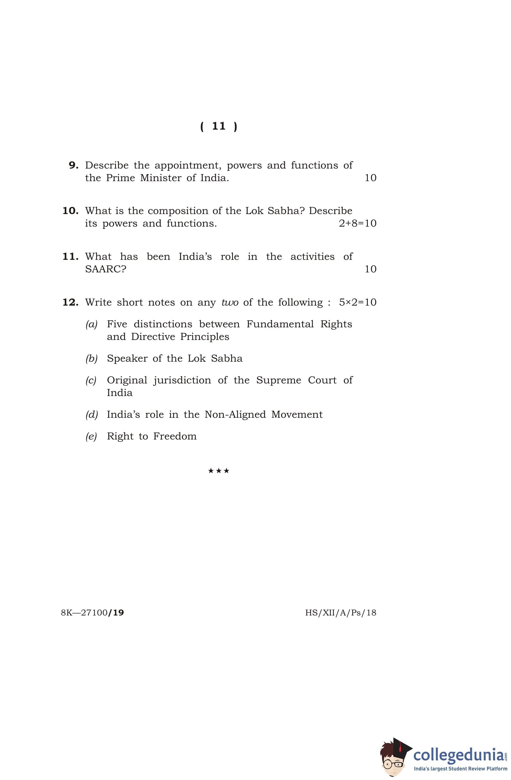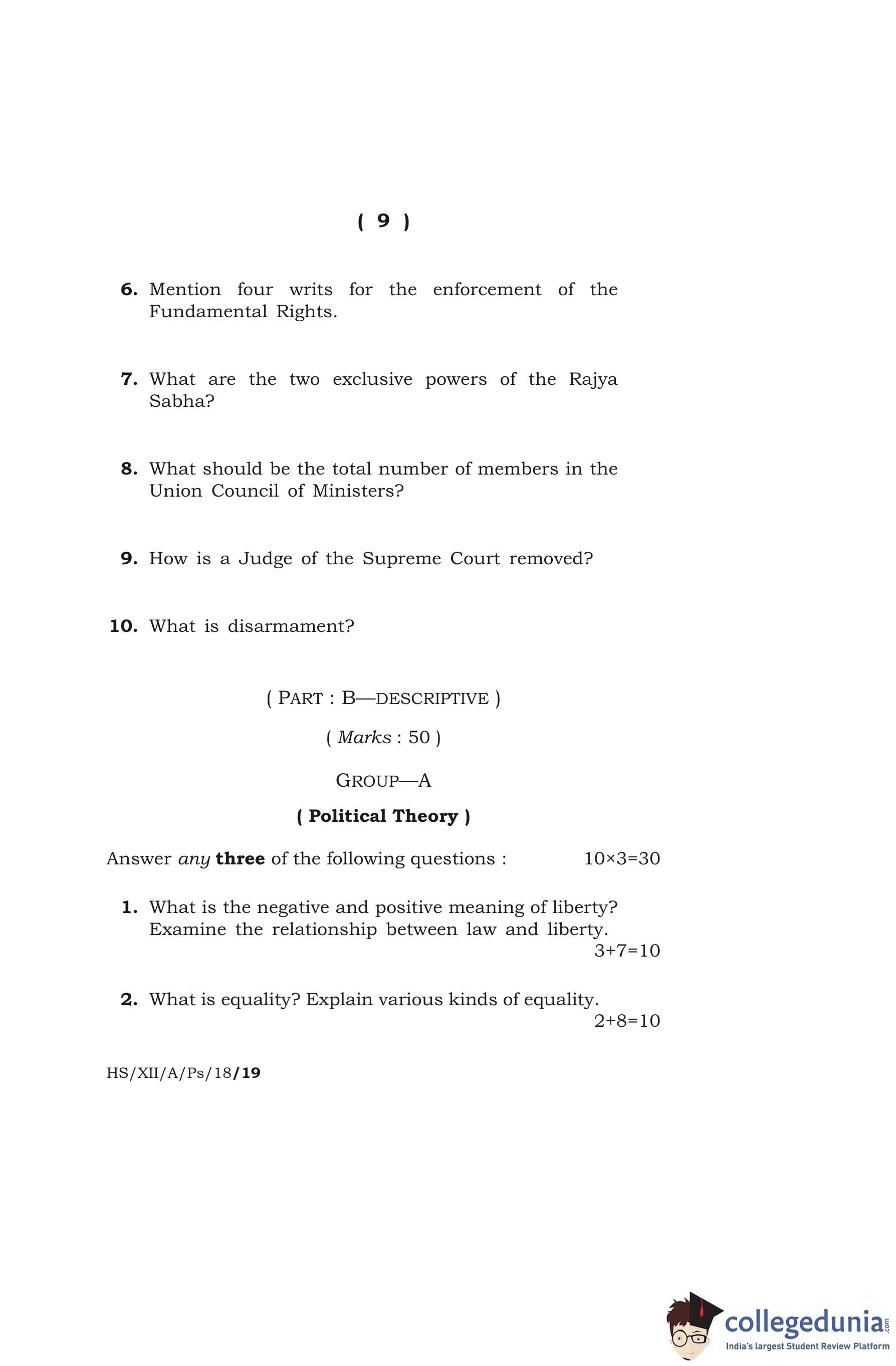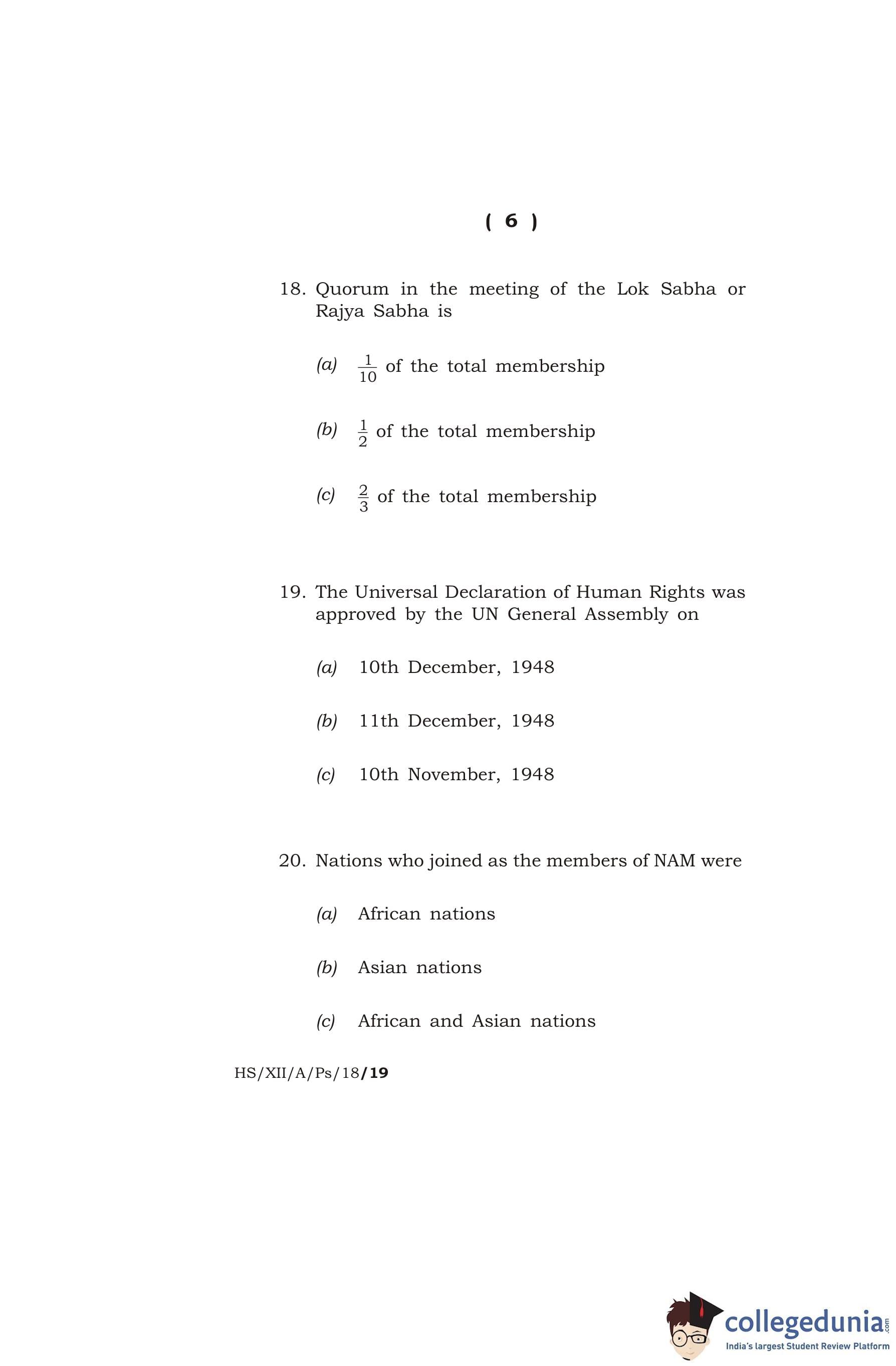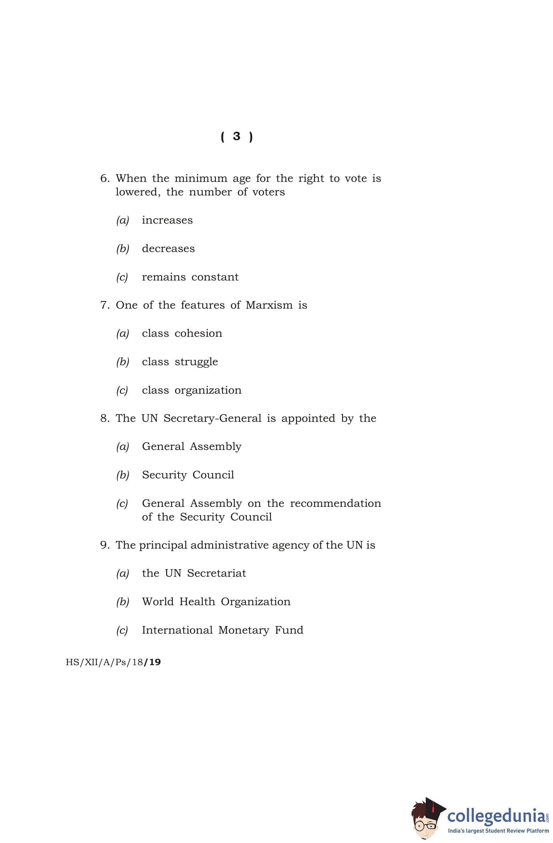 MBOSE Class 12 Political Science Question Paper 2018