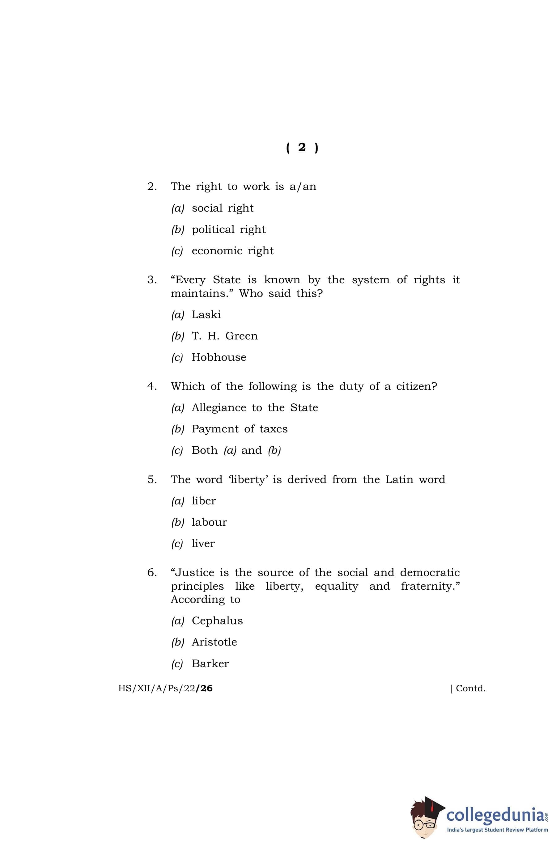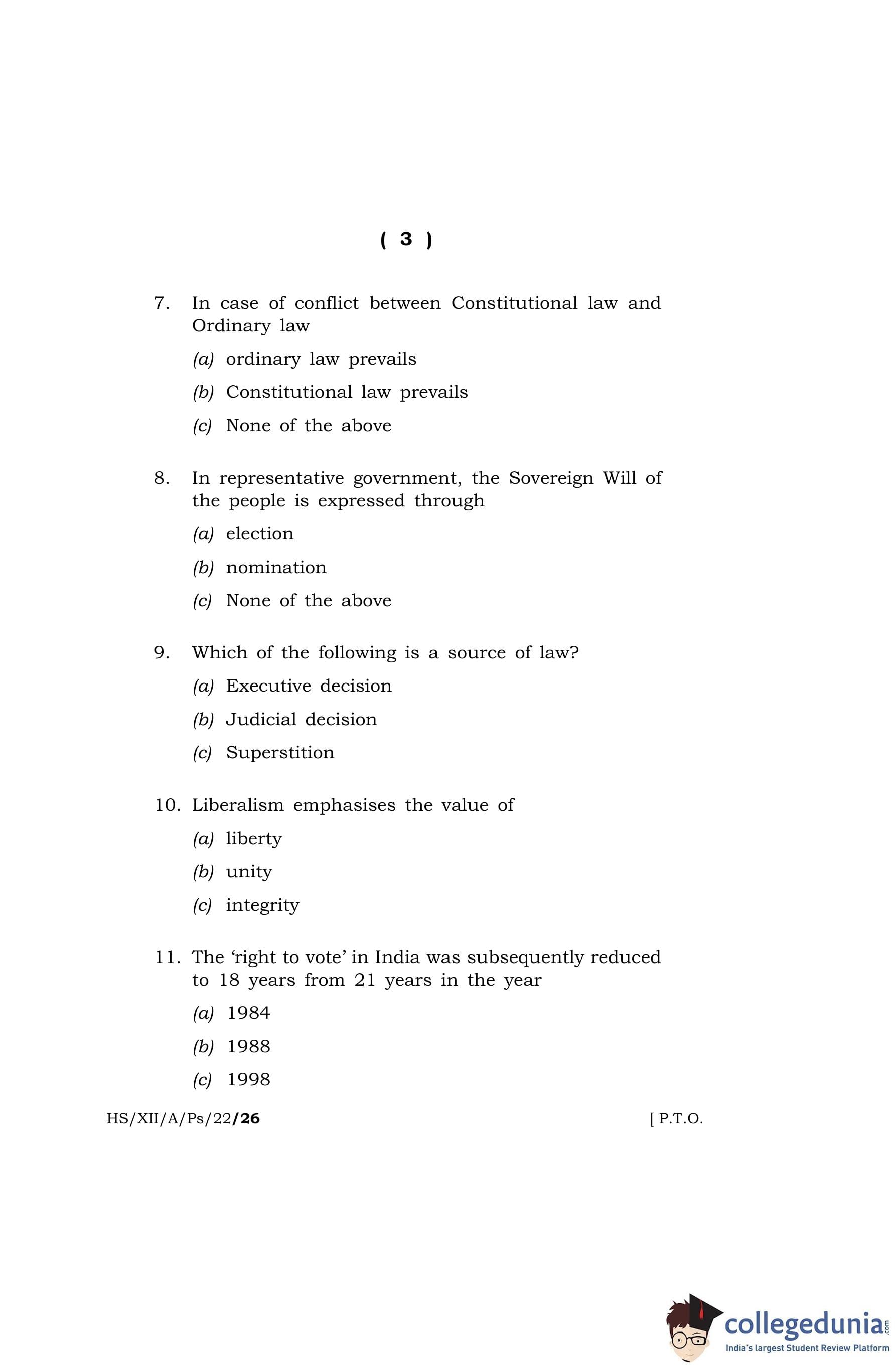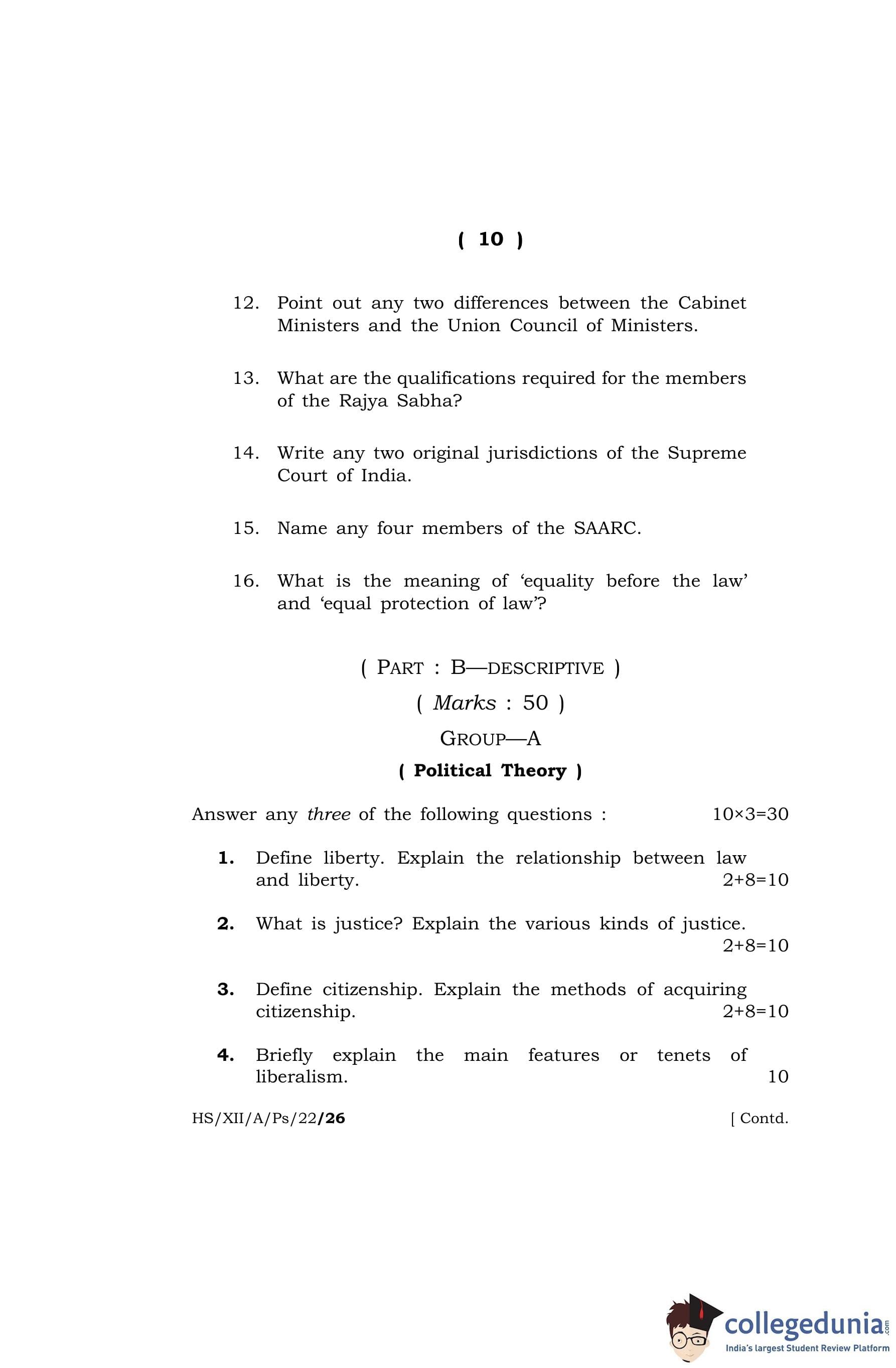 MBOSE Class 12 Political Science Question Paper 2022 with Answer Key pdf is available for download here. The exam was conducted by Meghalaya Board of School Education on April 8, 2022 in the Morning Session 10 AM to 1 PM. The question paper comprised a total of 16 questions divided among 2 sections.