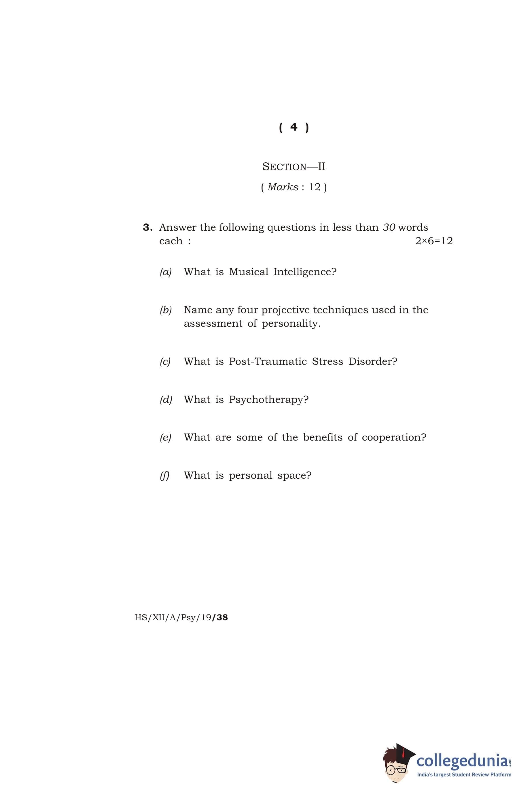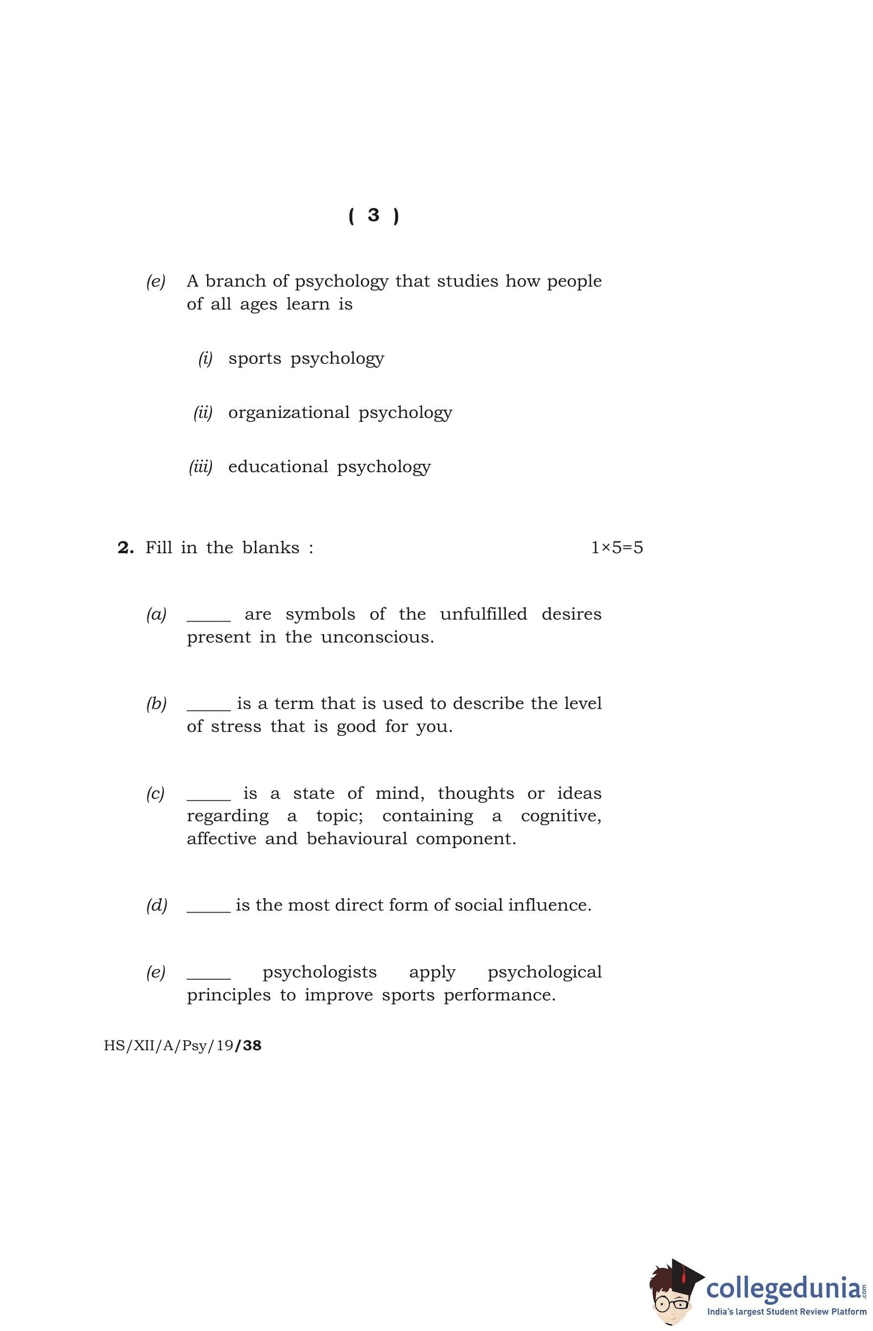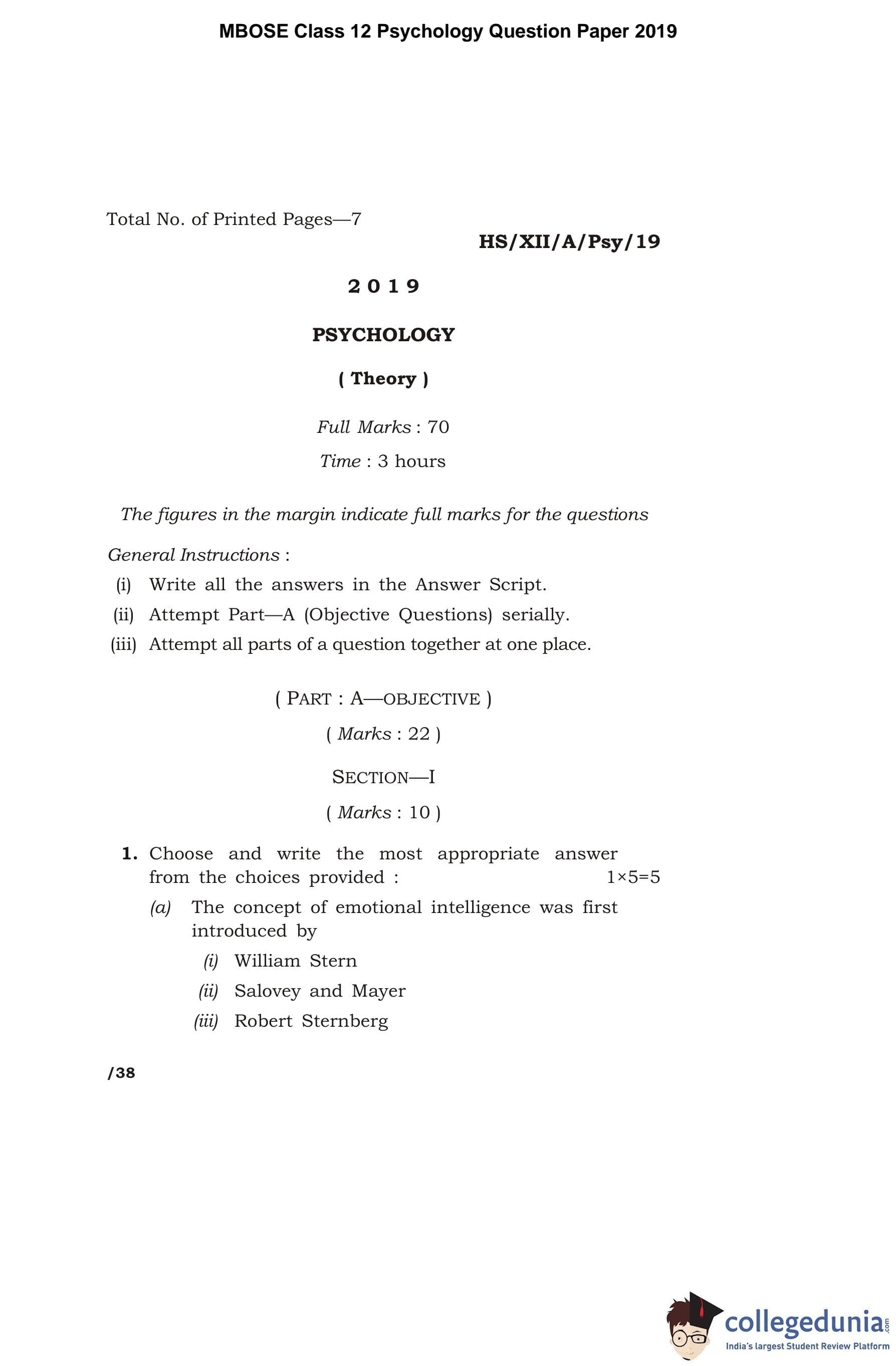 MBOSE Class 12 Psychology Question Paper 2019 with Answer Key pdf is available for download here. The exam was conducted by Meghalaya Board of School Education on March 19, 2019 in the Morning Session 10 AM to 1 PM. The question paper comprised a total of 6 questions divided among 2 sections.