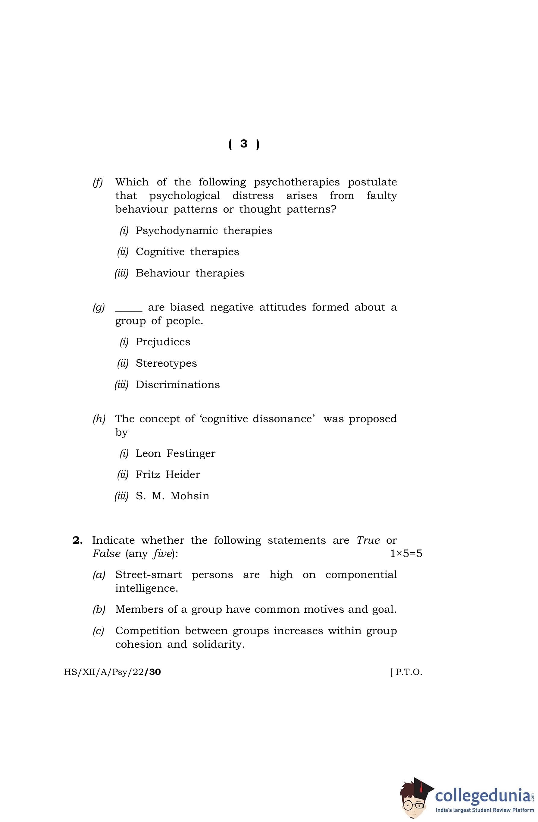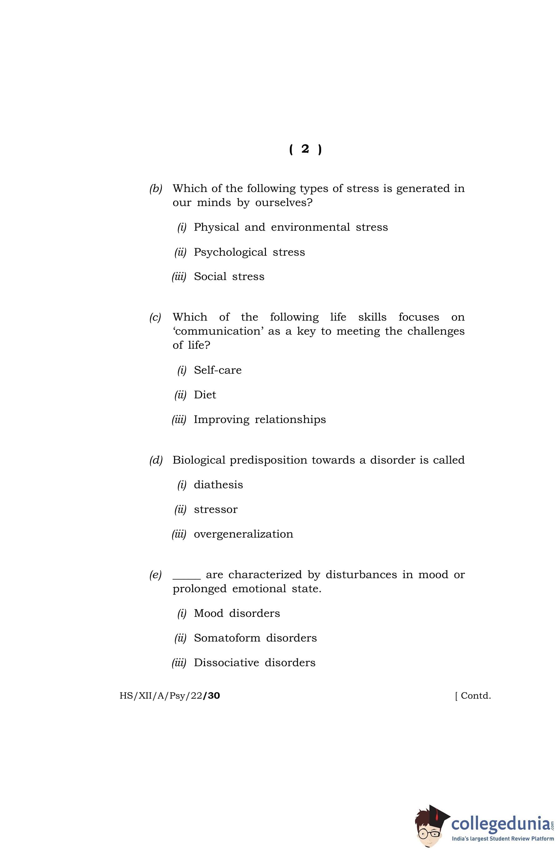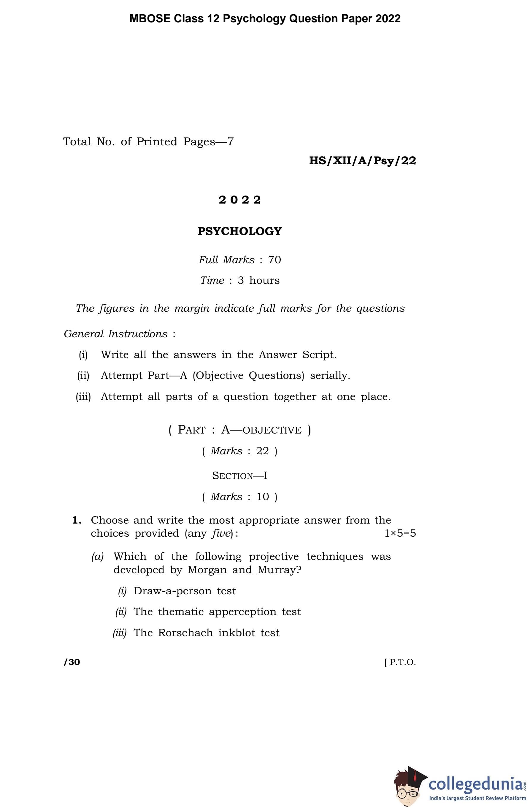 MBOSE Class 12 Psychology Question Paper 2022 with Answer Key pdf is available for download here. The exam was conducted by Meghalaya Board of School Education on March 28, 2022 in the Morning Session 10 AM to 1 PM. The question paper comprised a total of 6 questions divided among 2 sections.