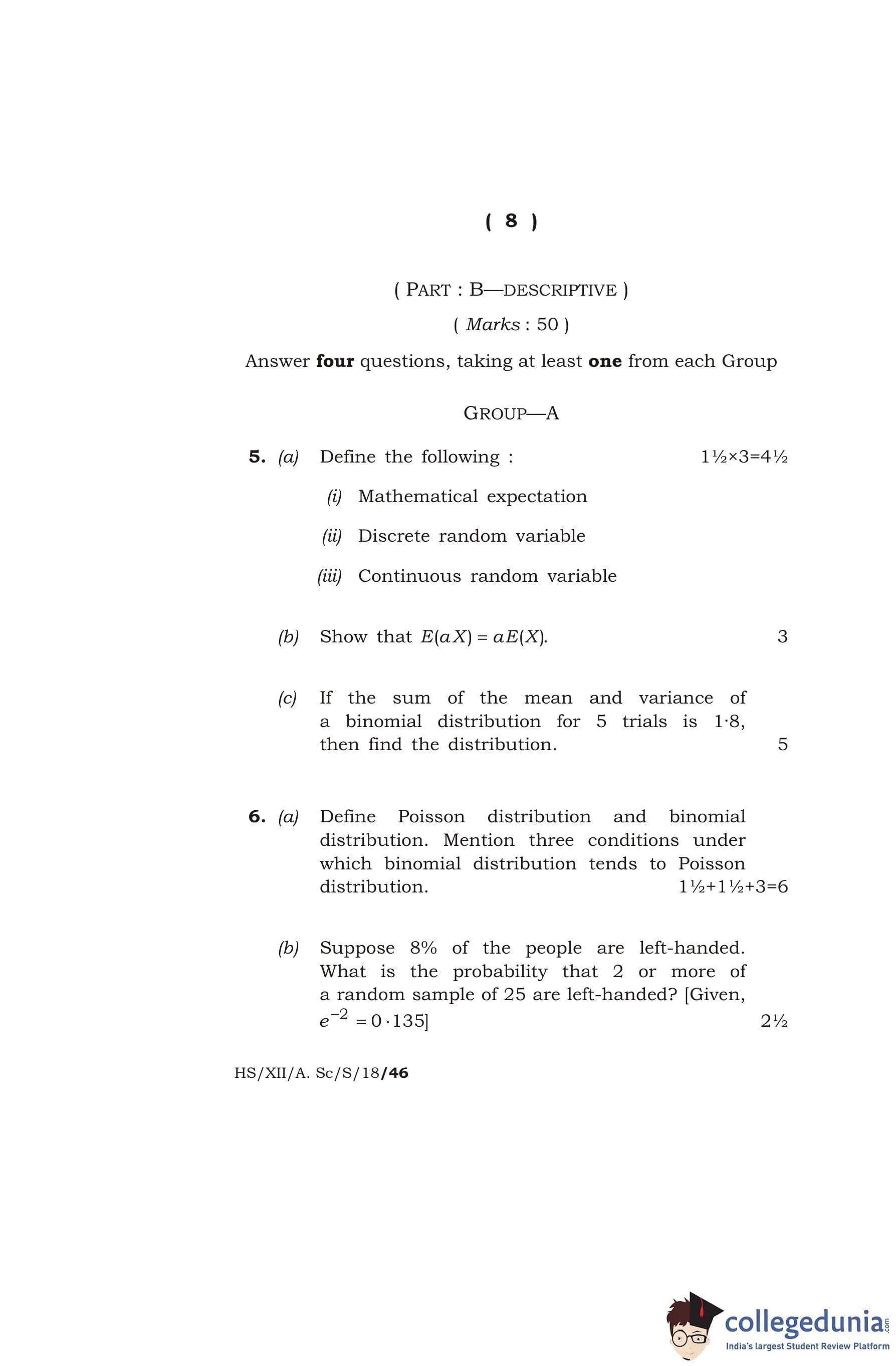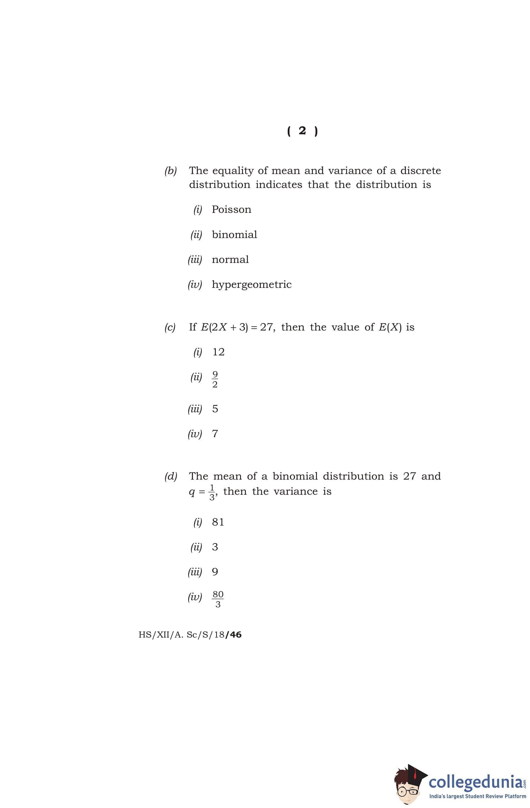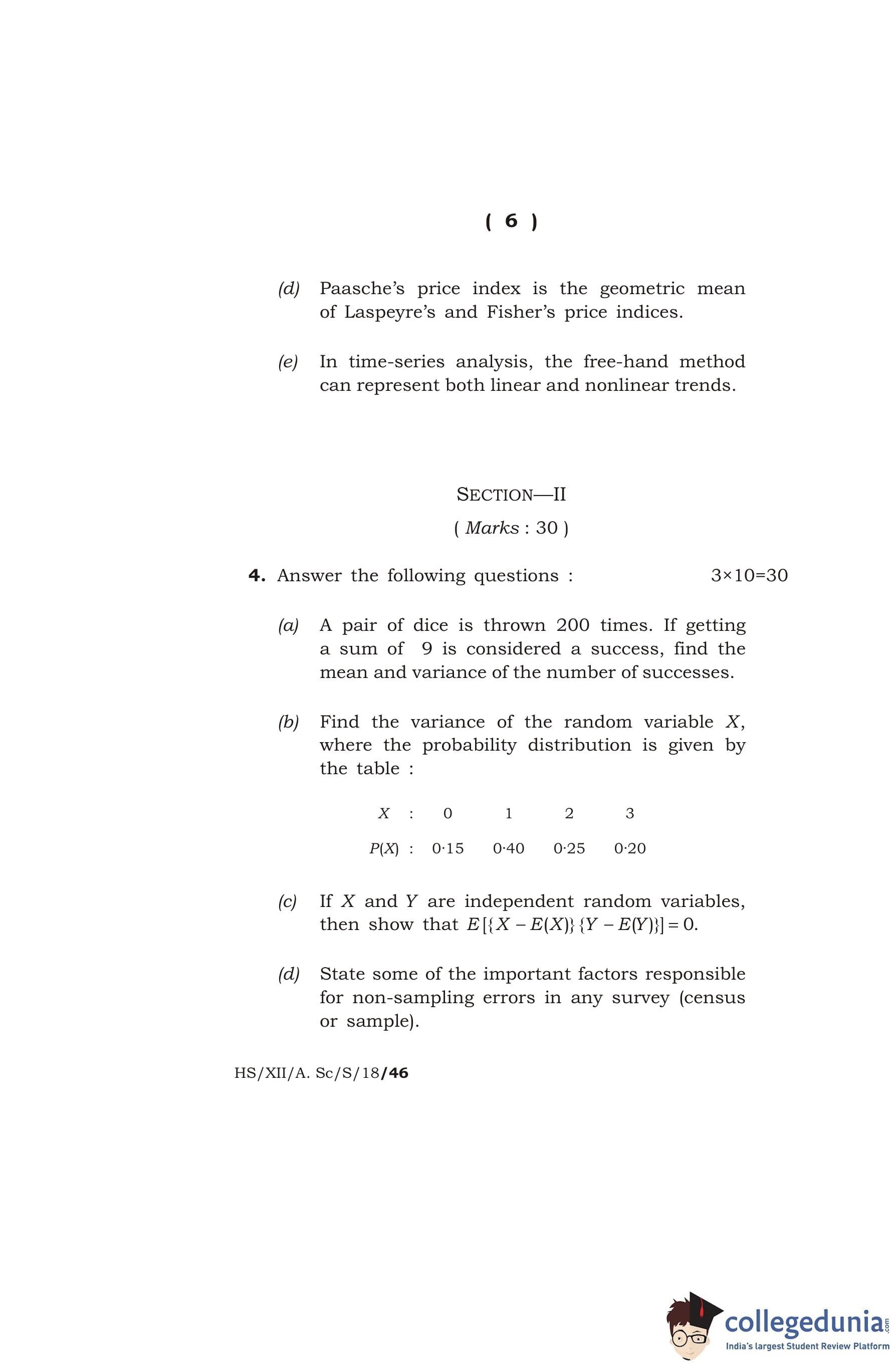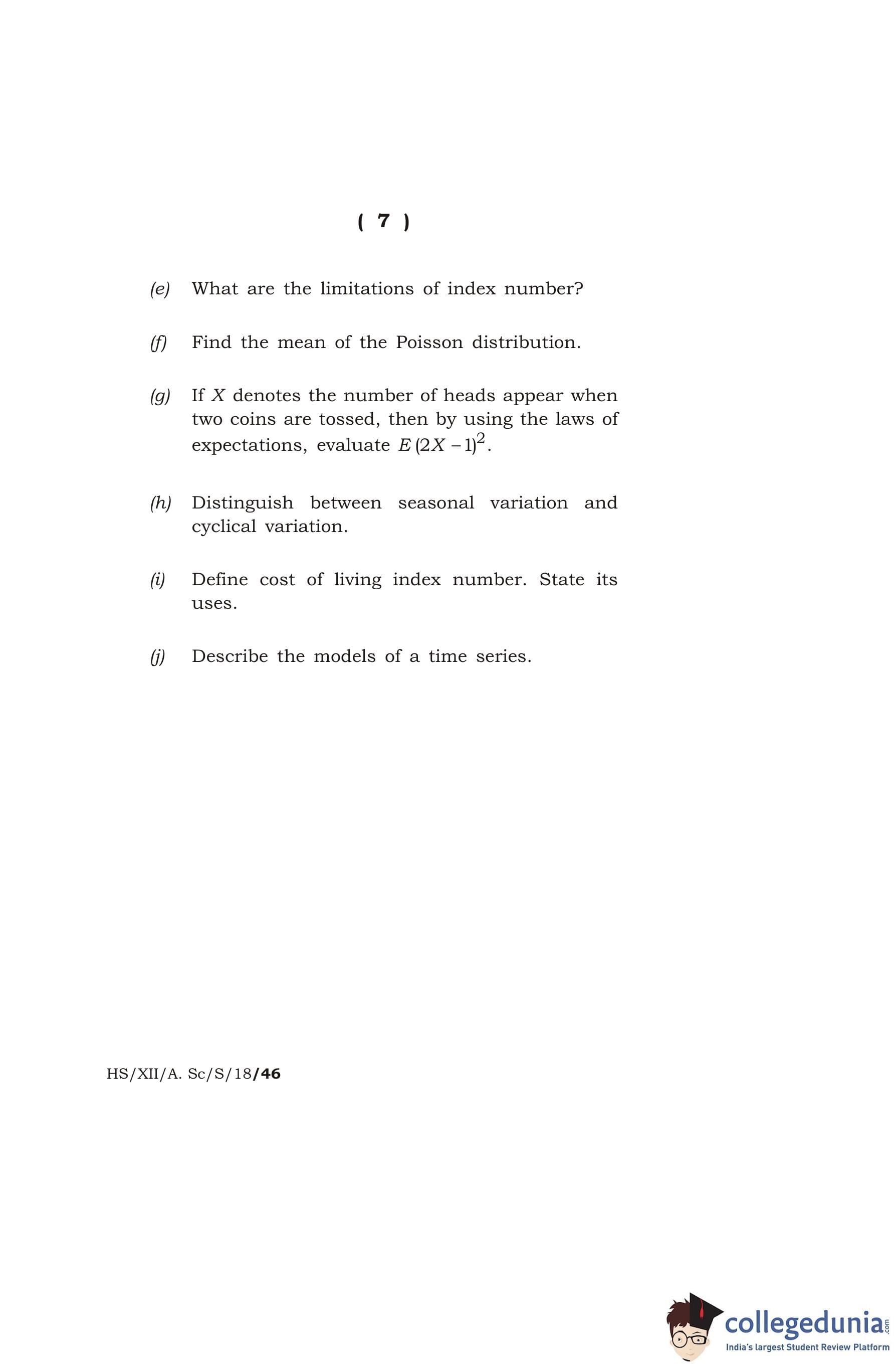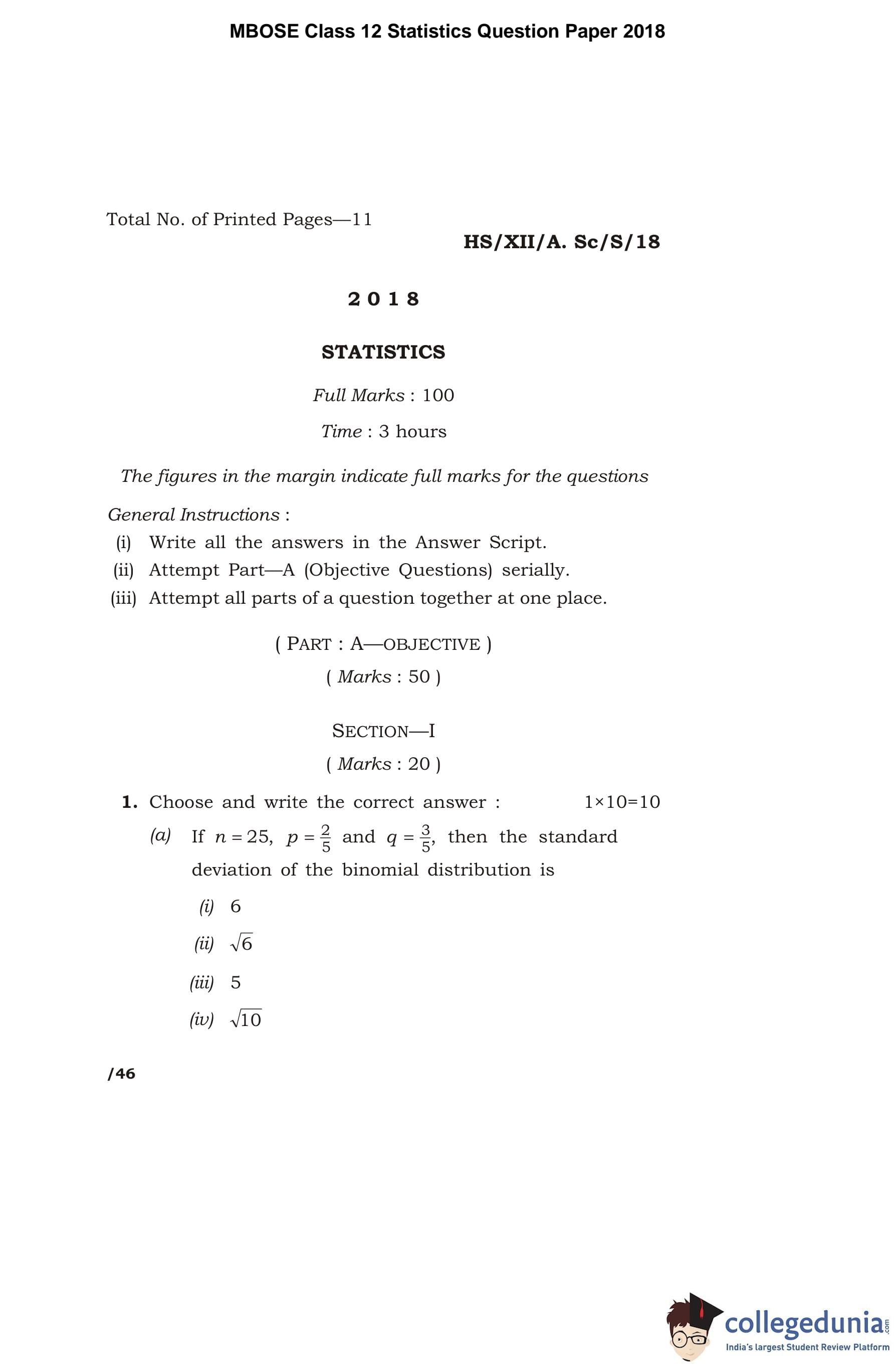 MBOSE Class 12 Statistics Question Paper 2018 with Answer Key pdf is available for download here. The exam was conducted by Meghalaya Board of School Education on March 26, 2018 in the Morning Session 10 AM to 1 PM. The question paper comprised a total of 10 questions divided among 2 sections.