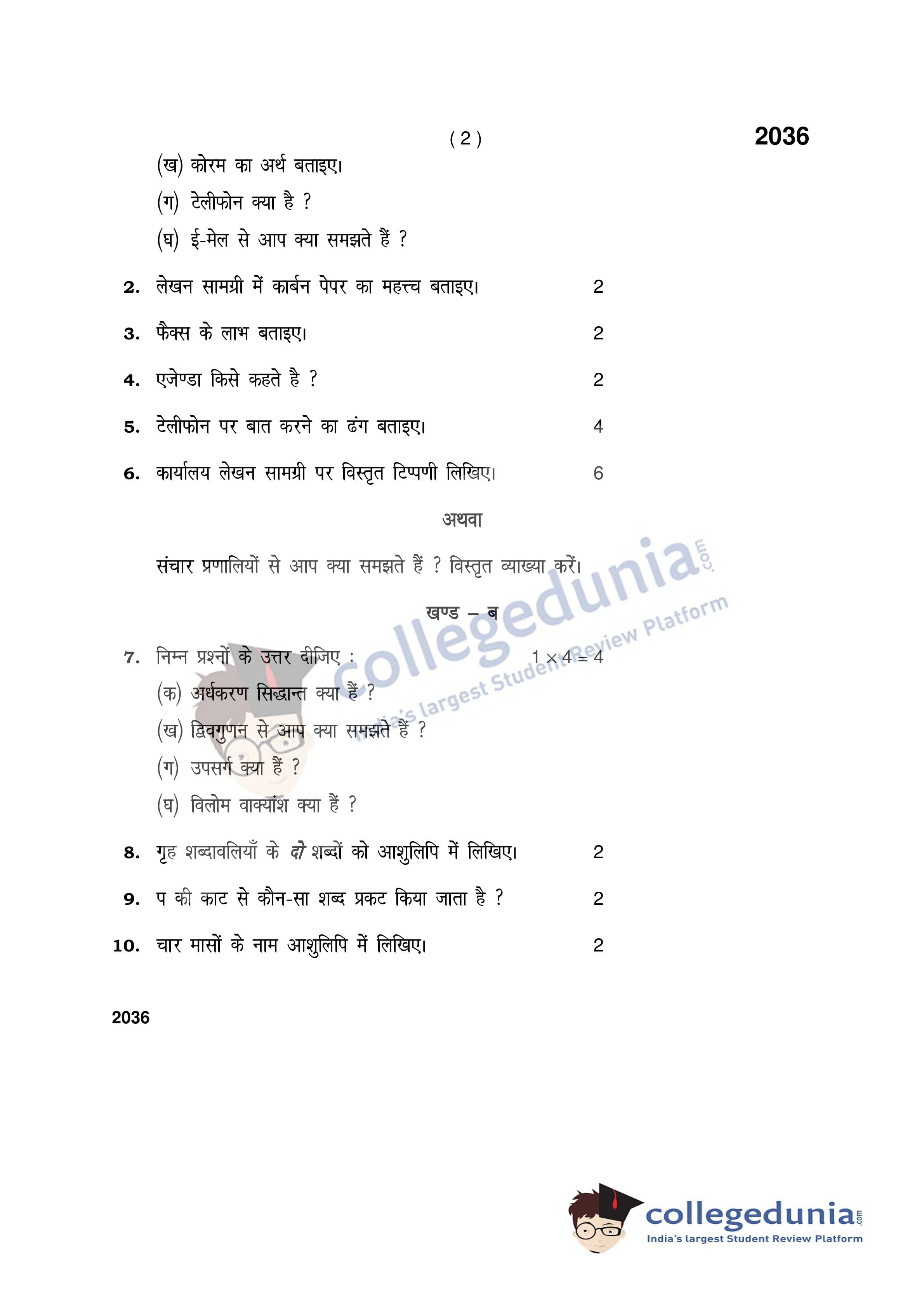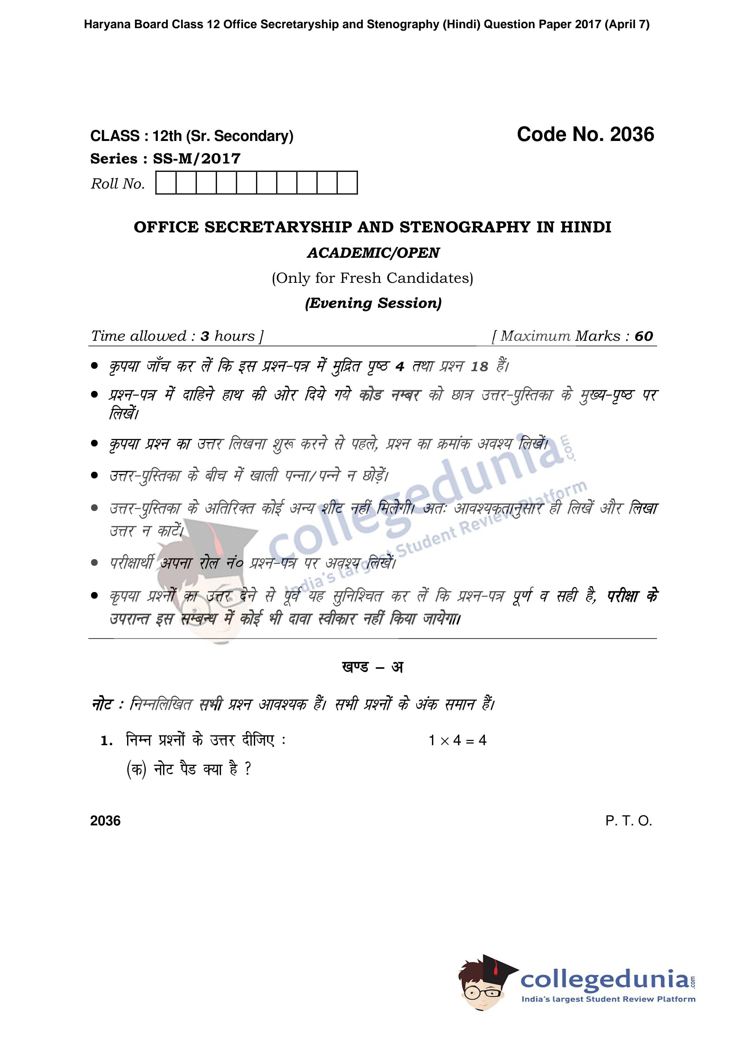 HBSE Class 12 Office Secretaryship and Stenography (Hindi) Question Paper 2017 with Answer Key (April 7)