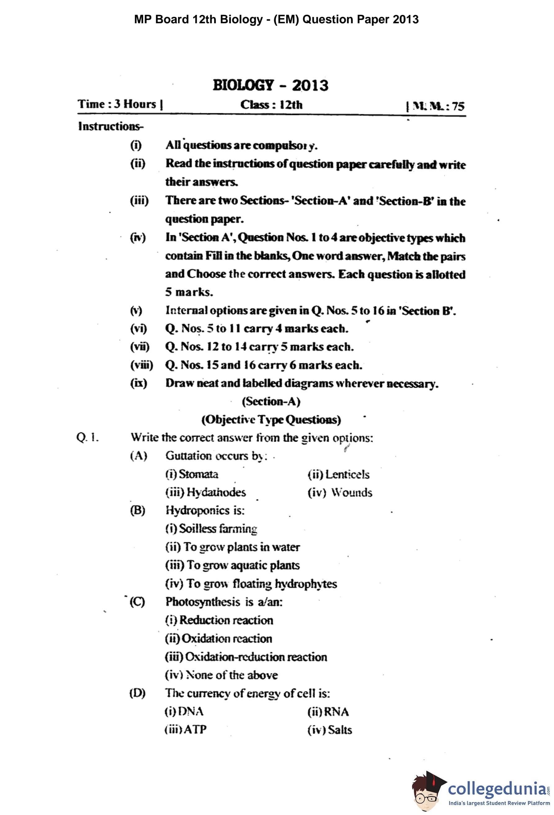 MP Board 12th Biology Question Paper 2013 with Answer Key pdf is available for download here. The exam was conducted by Madhya Pradesh Board of Secondary Education, MPBSE. The question paper comprised a total of 16 questions divided among 2 sections.