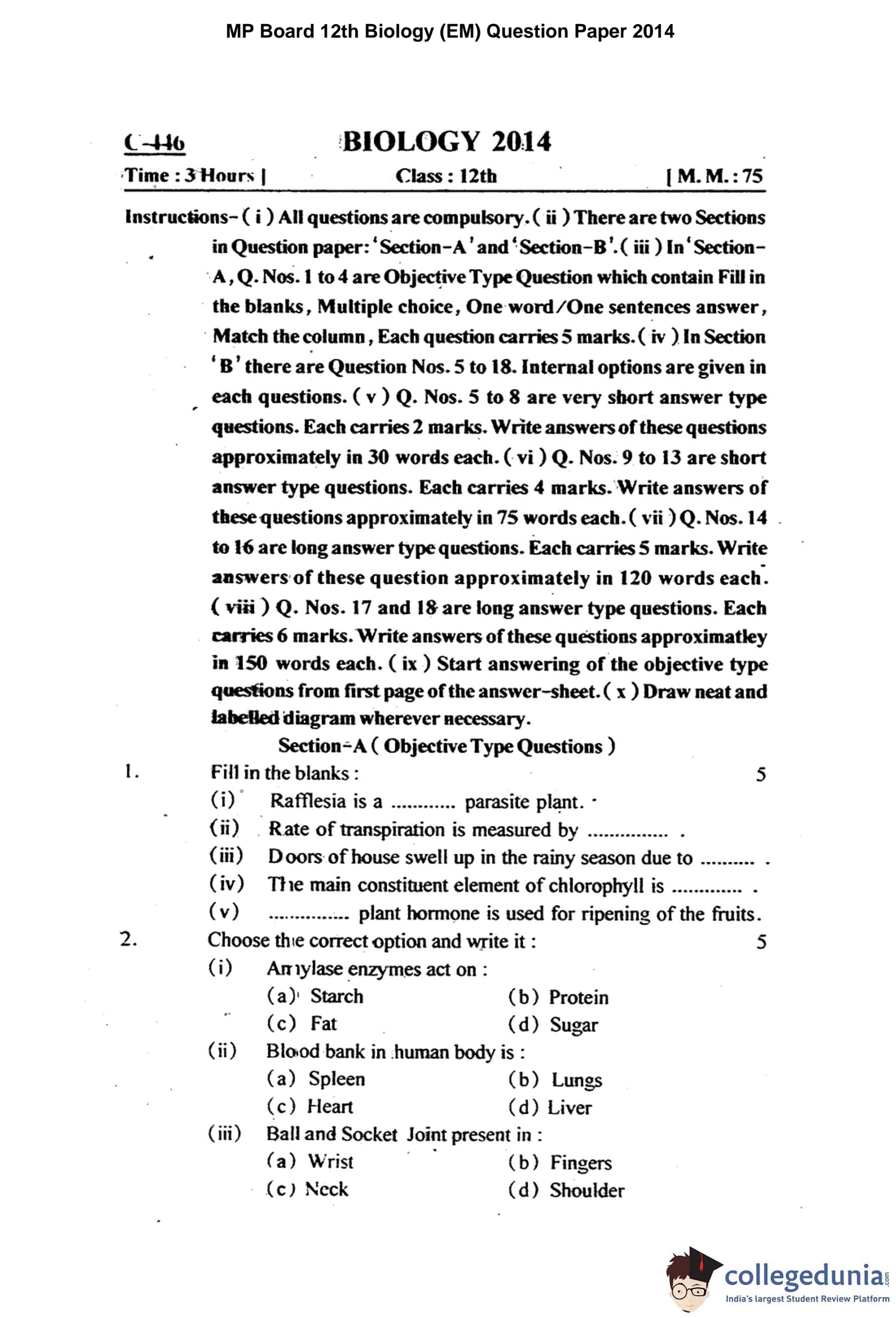 MP Board 12th Biology Question Paper 2014 with Answer Key