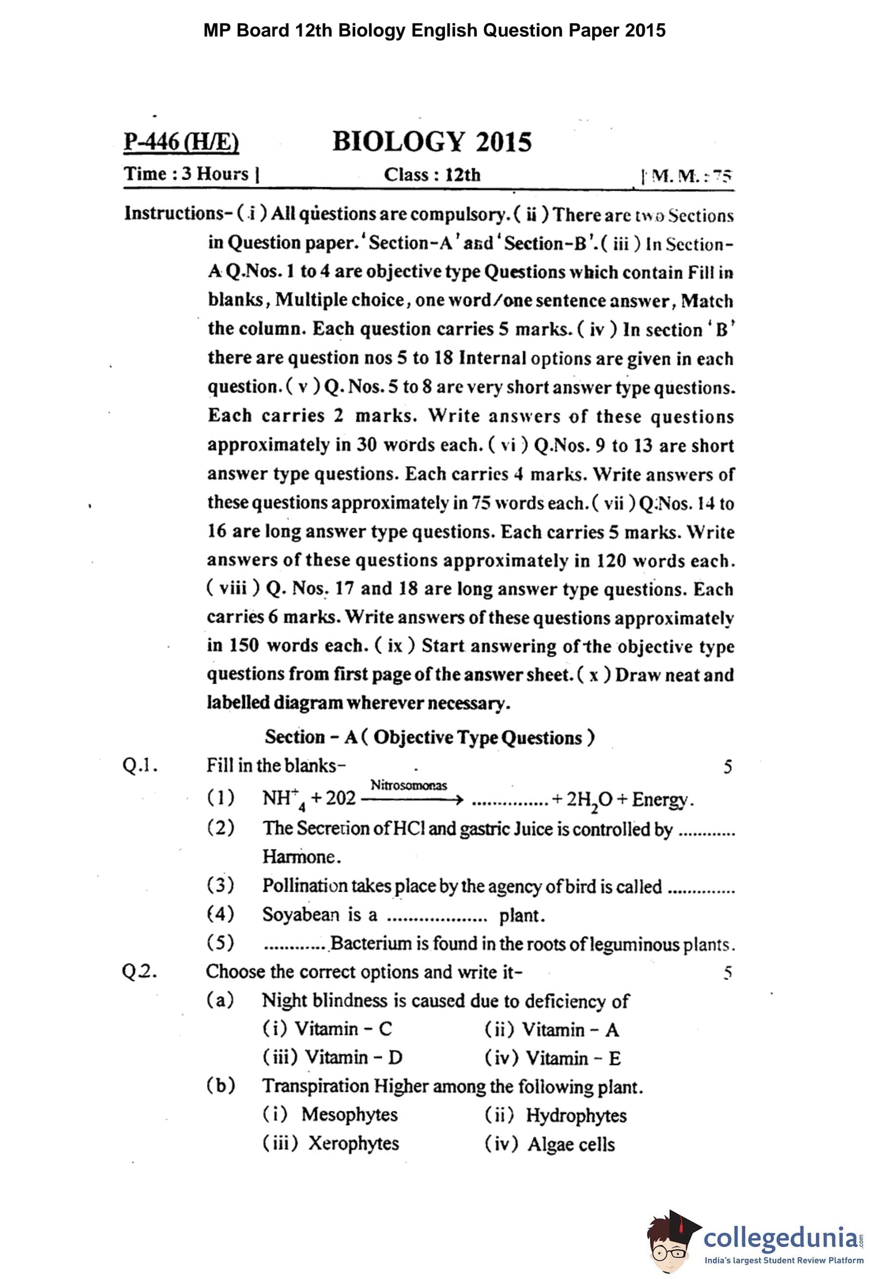 MP Board 12th Biology Question Paper 2015 with Answer Key