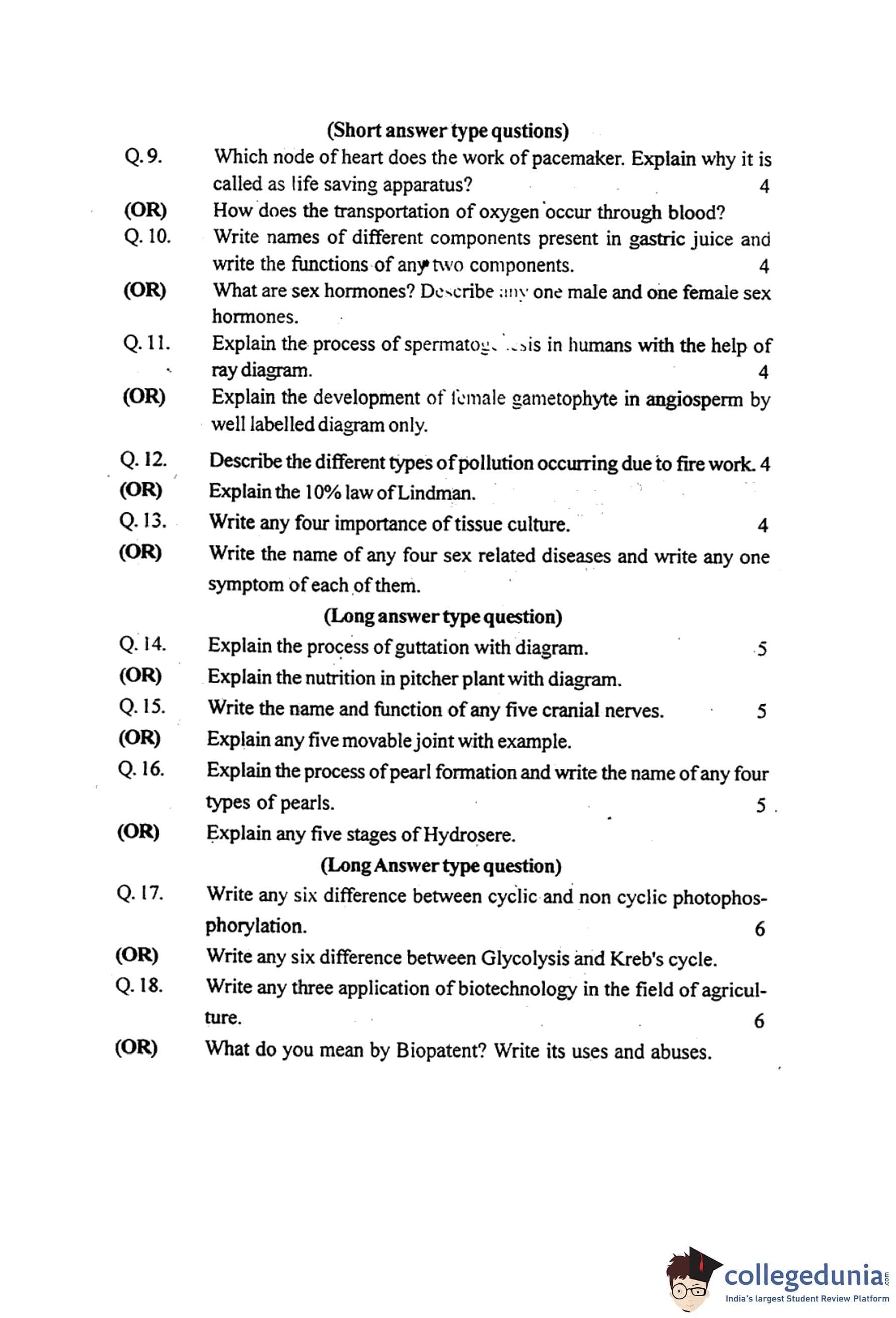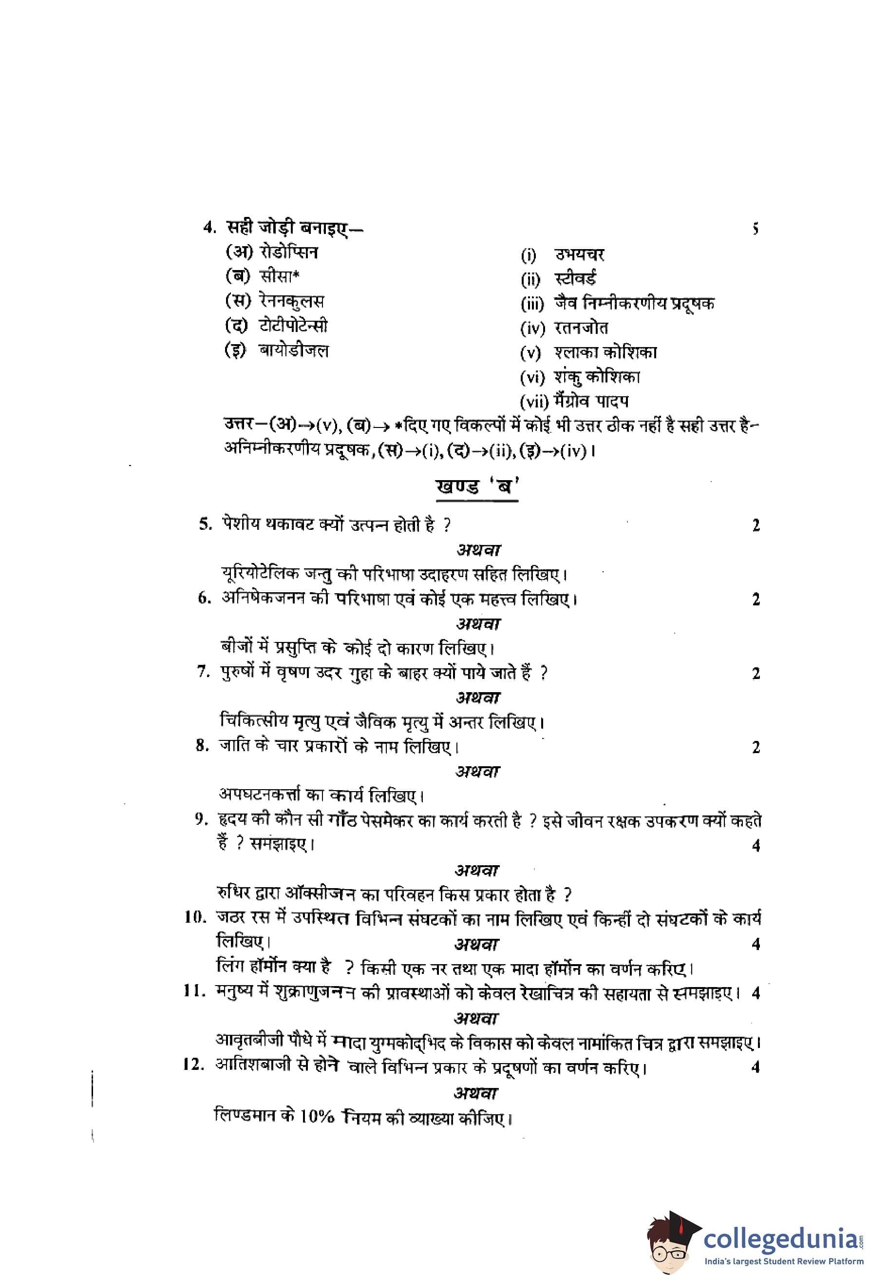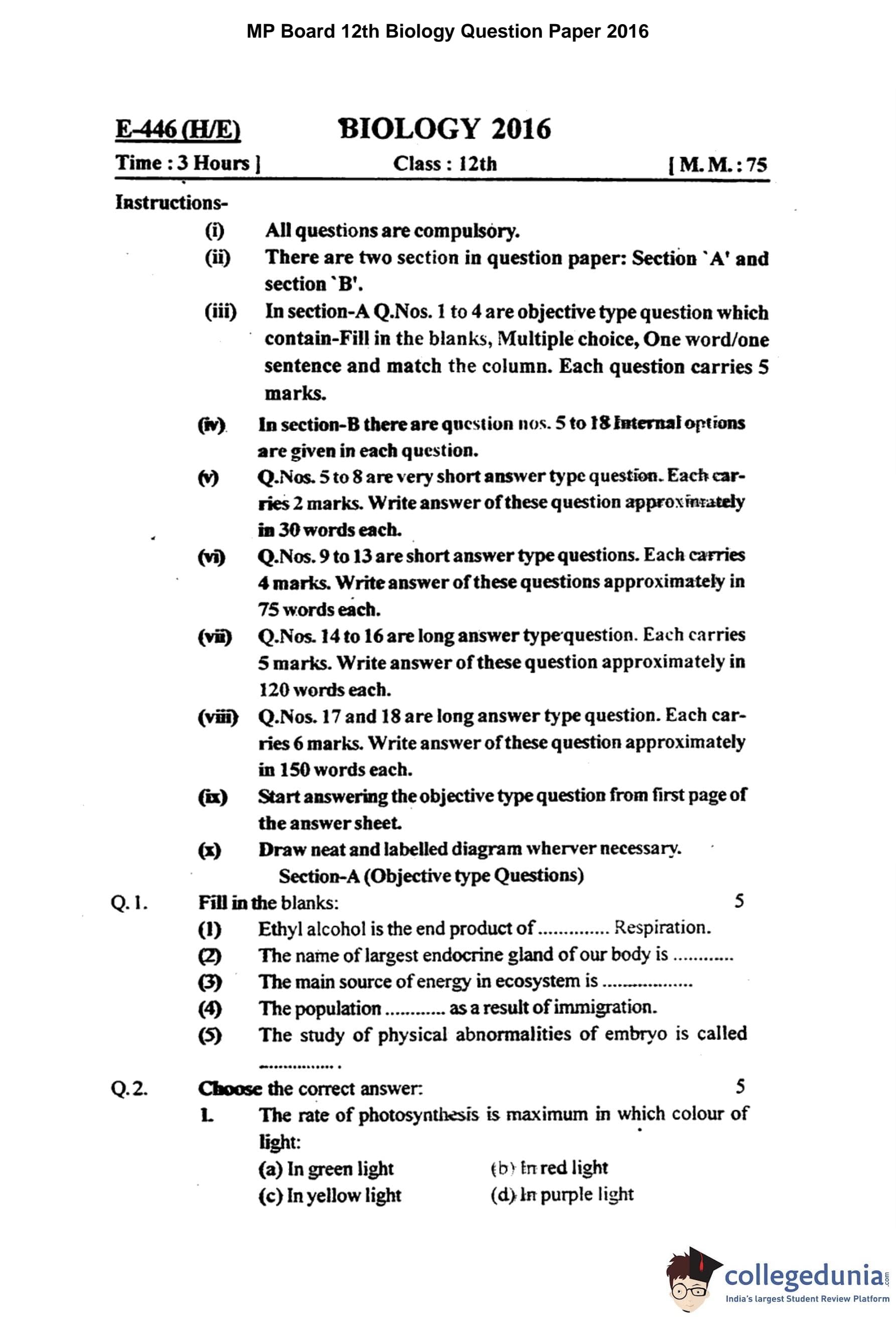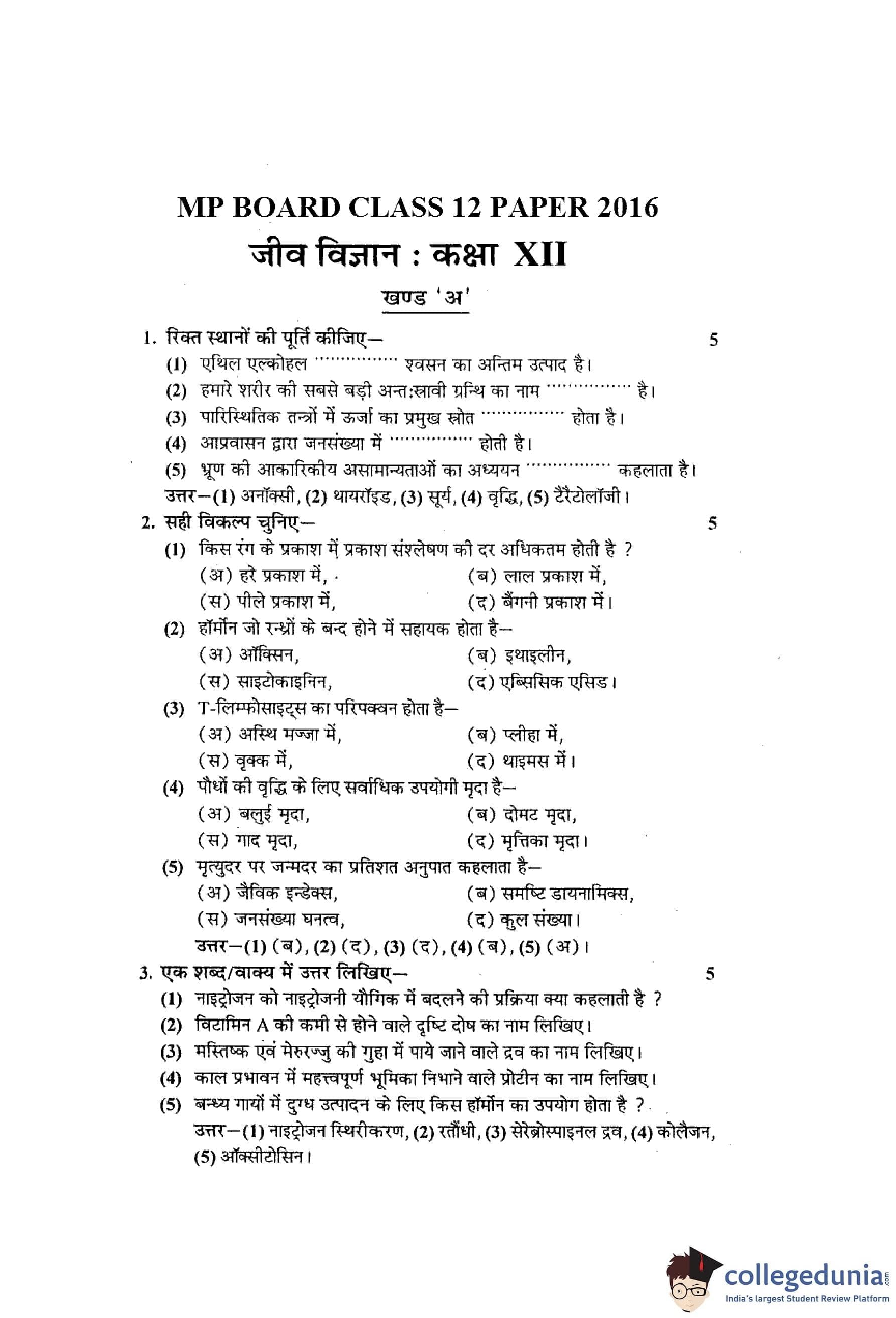 MP Board 12th Biology Question Paper 2016 with Answer Key