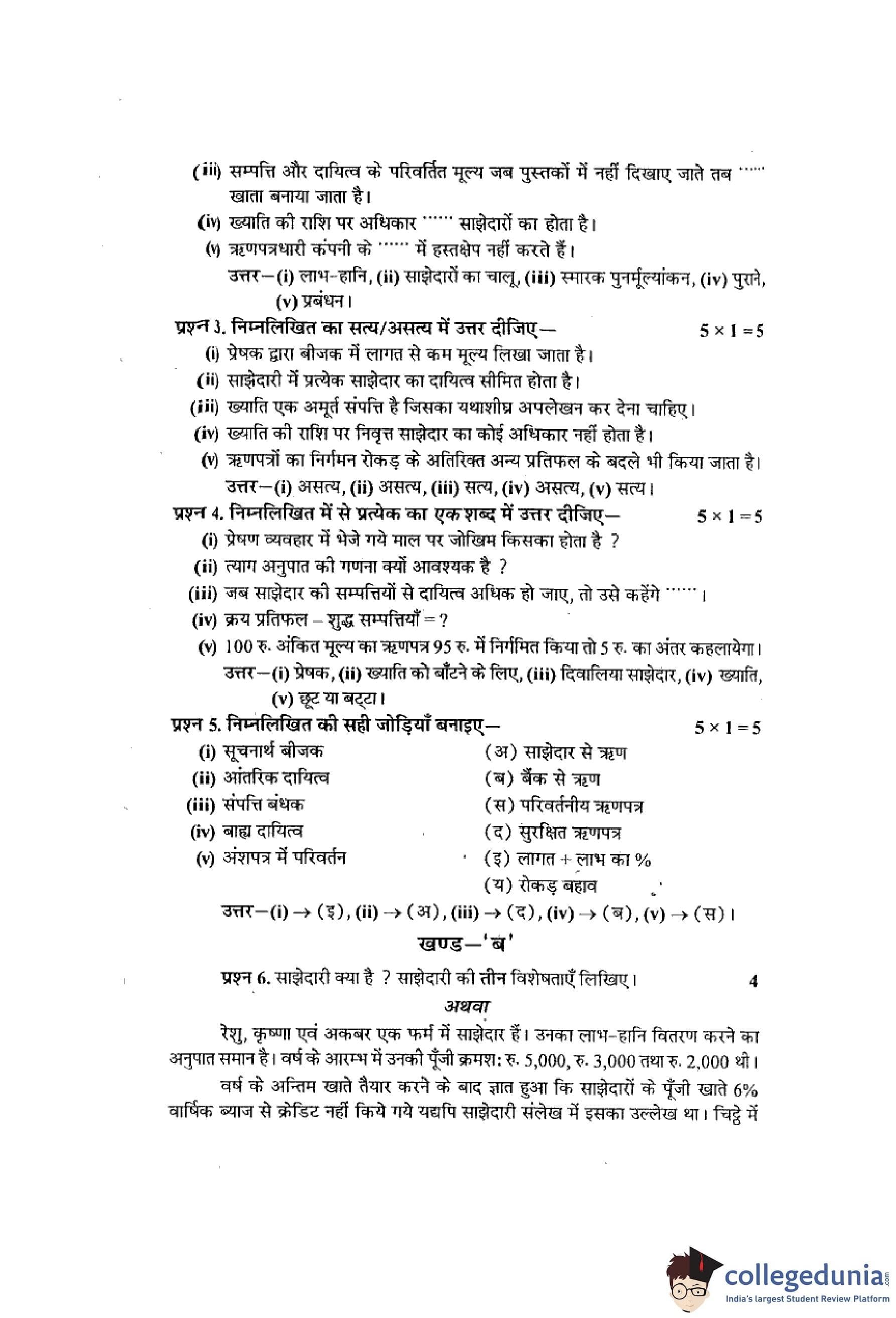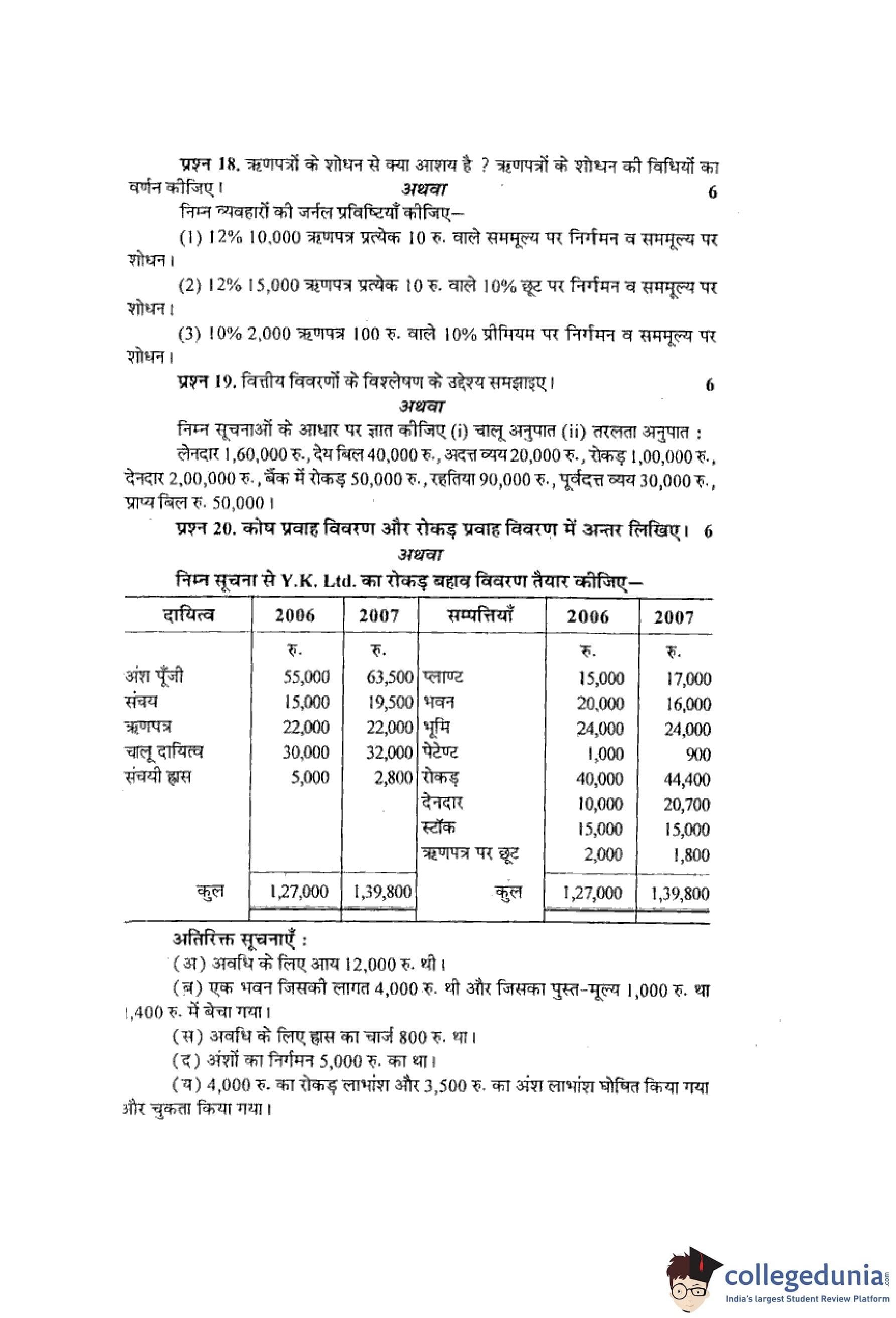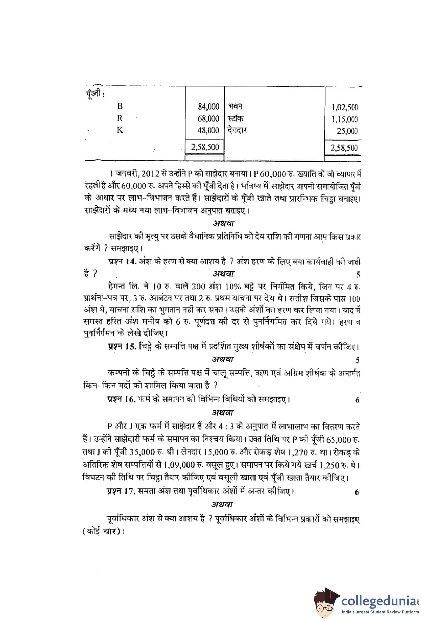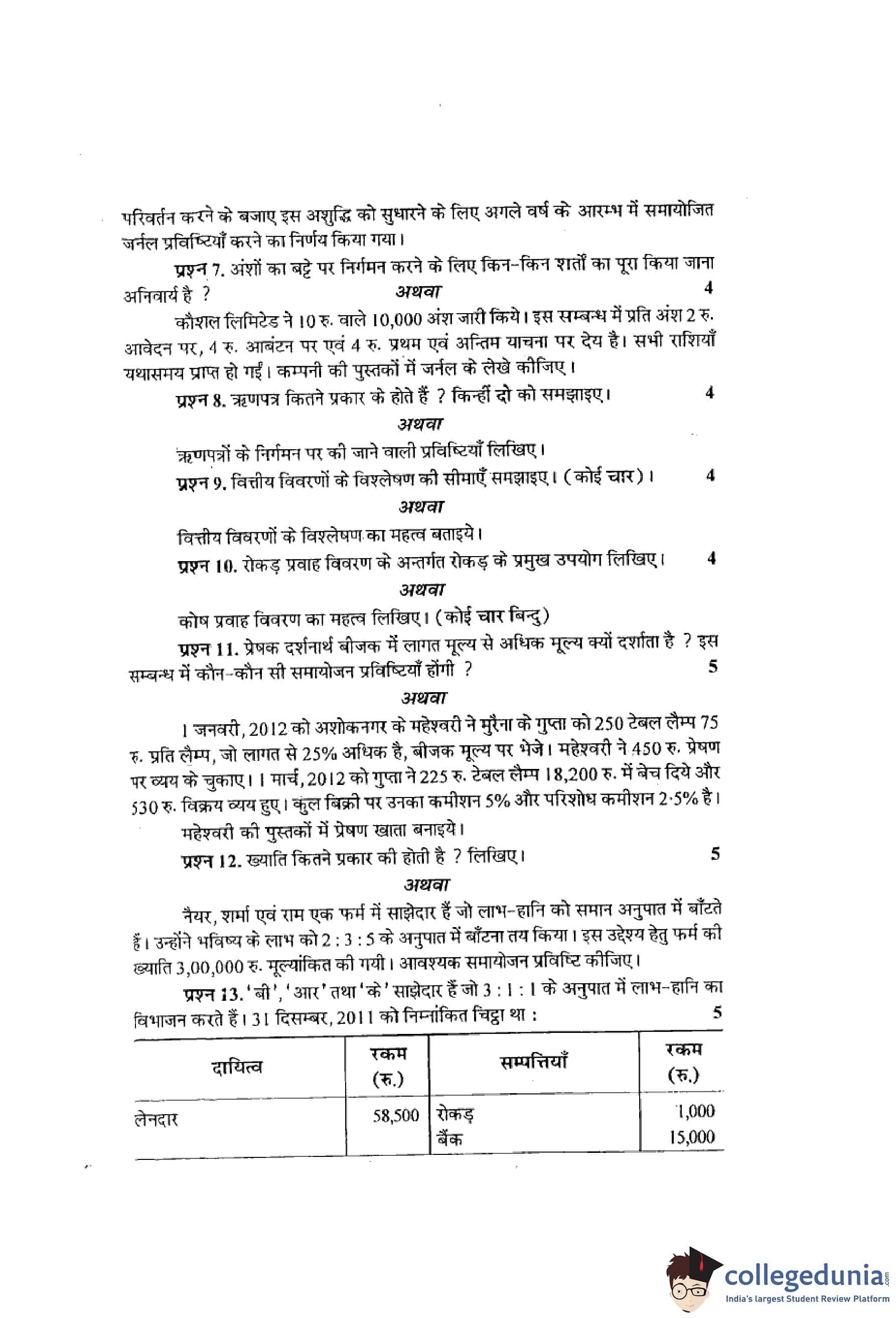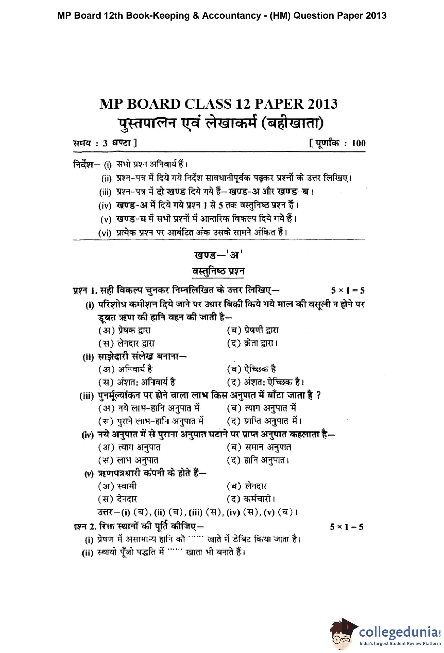 MP Board 12th Book-Keeping & Accountancy Hindi Question Paper 2013 with Answer Key