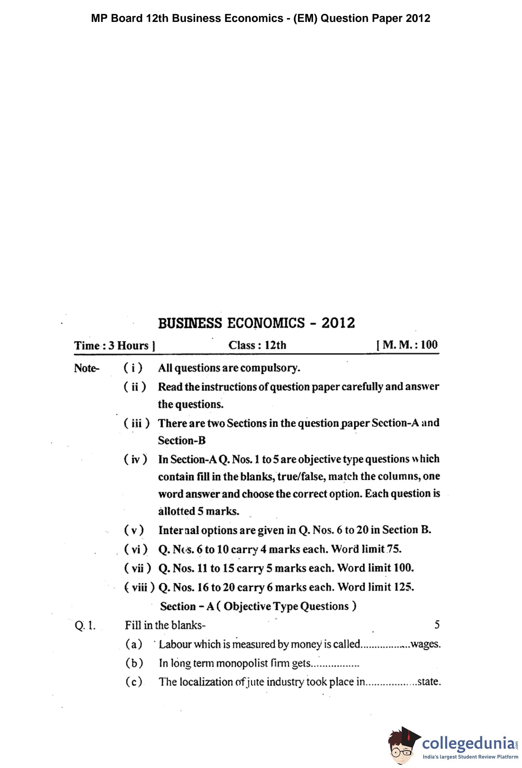 MP Board 12th Business Economics Question Paper 2012 with Answer Key