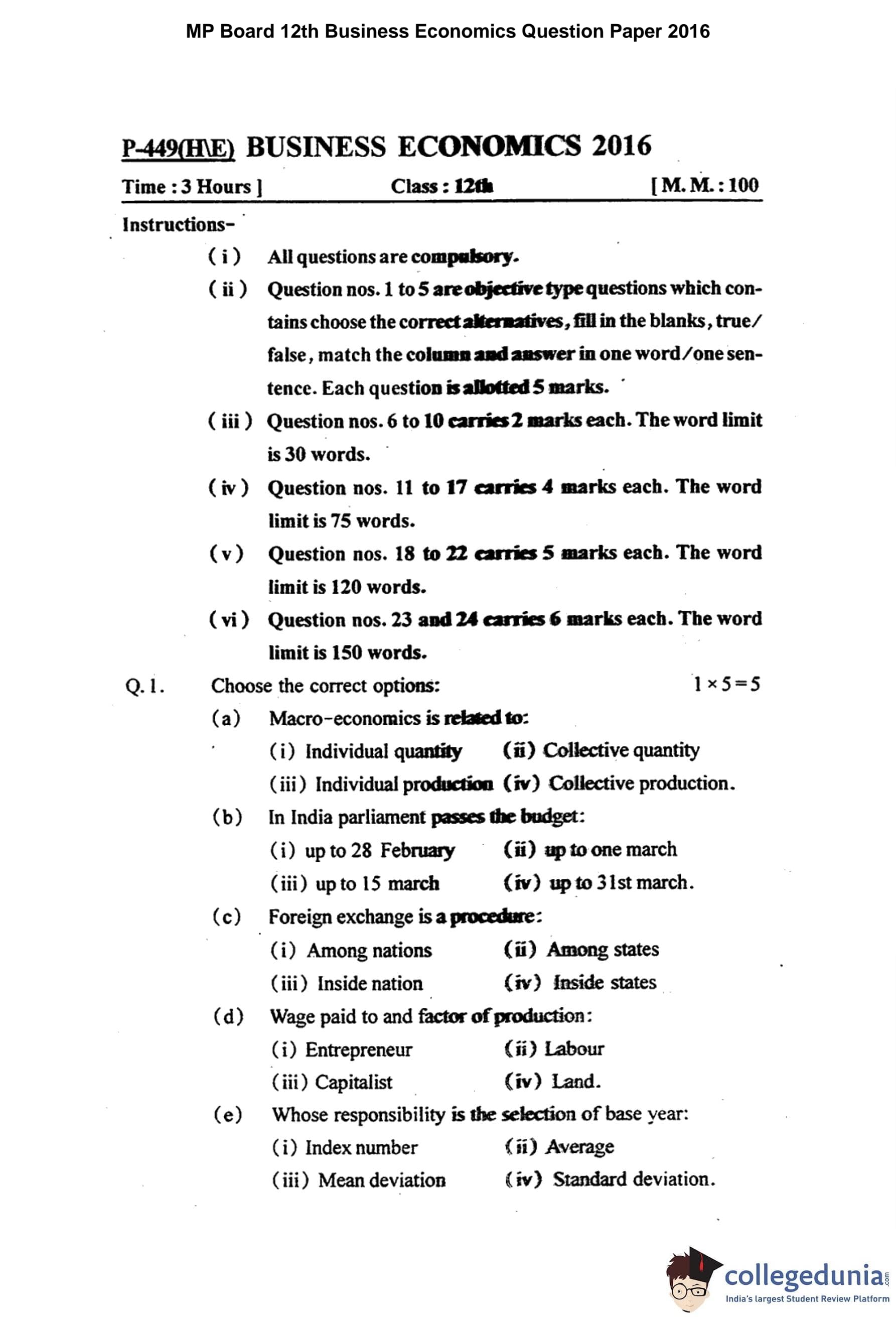 MP Board 12th Business Economics Question Paper 2016 with Answer Key pdf is available for download here. The exam was conducted by Madhya Pradesh Board of Secondary Education, MPBSE on March 19, 2016 in the Morning Session 8.30 AM to 11.30AM. The question paper comprised a total of 24 questions.