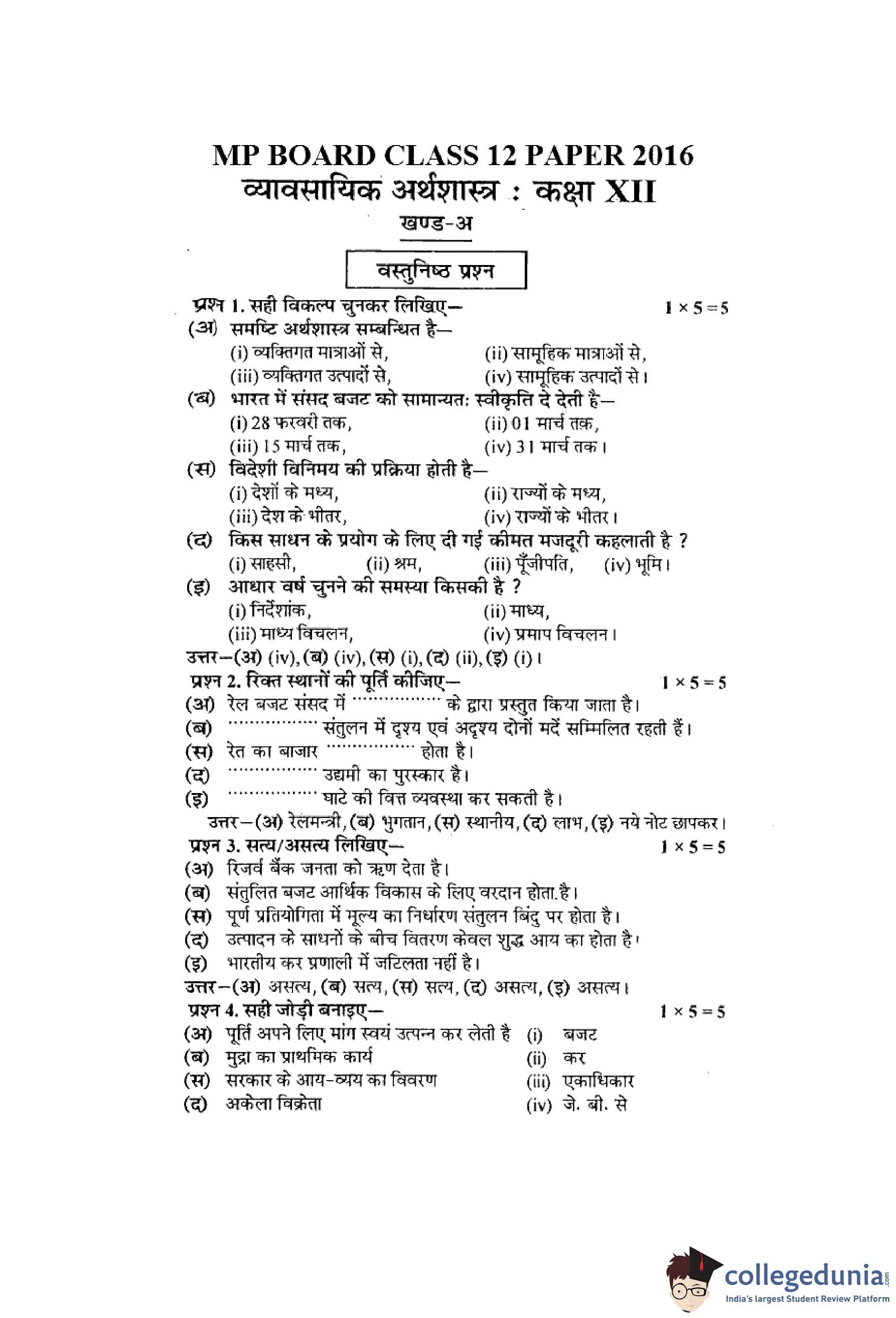 MP Board 12th Business Economics Question Paper 2016 with Answer Key