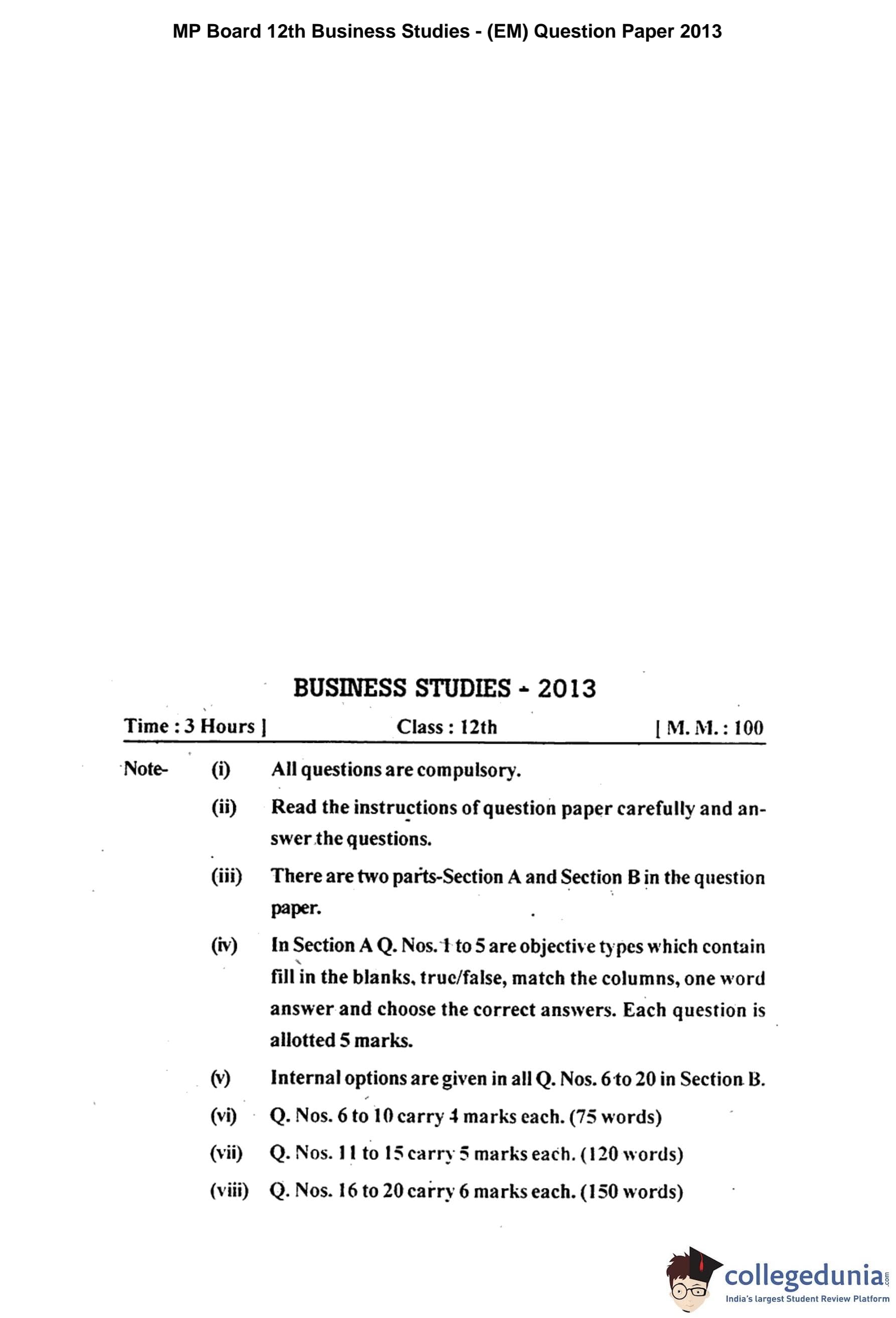 MP Board 12th Business Studies Question Paper 2013 with Answer Key pdf is available for download here. The exam was conducted by Madhya Pradesh Board of Secondary Education, MPBSE on March 9, 2013 in the Morning Session 8.30 AM to 11.30AM. The question paper comprised a total of 20 questions divided among 2 sections.
