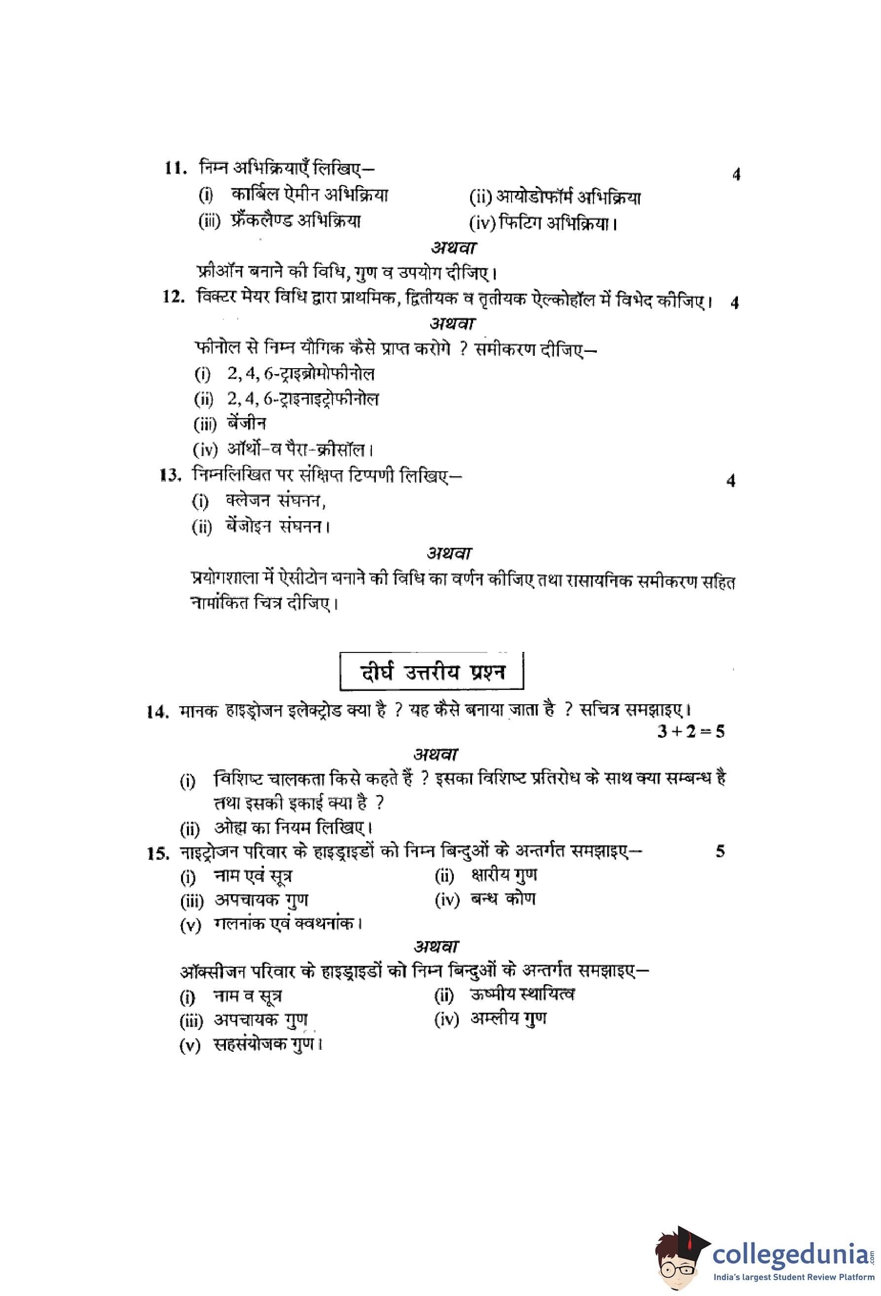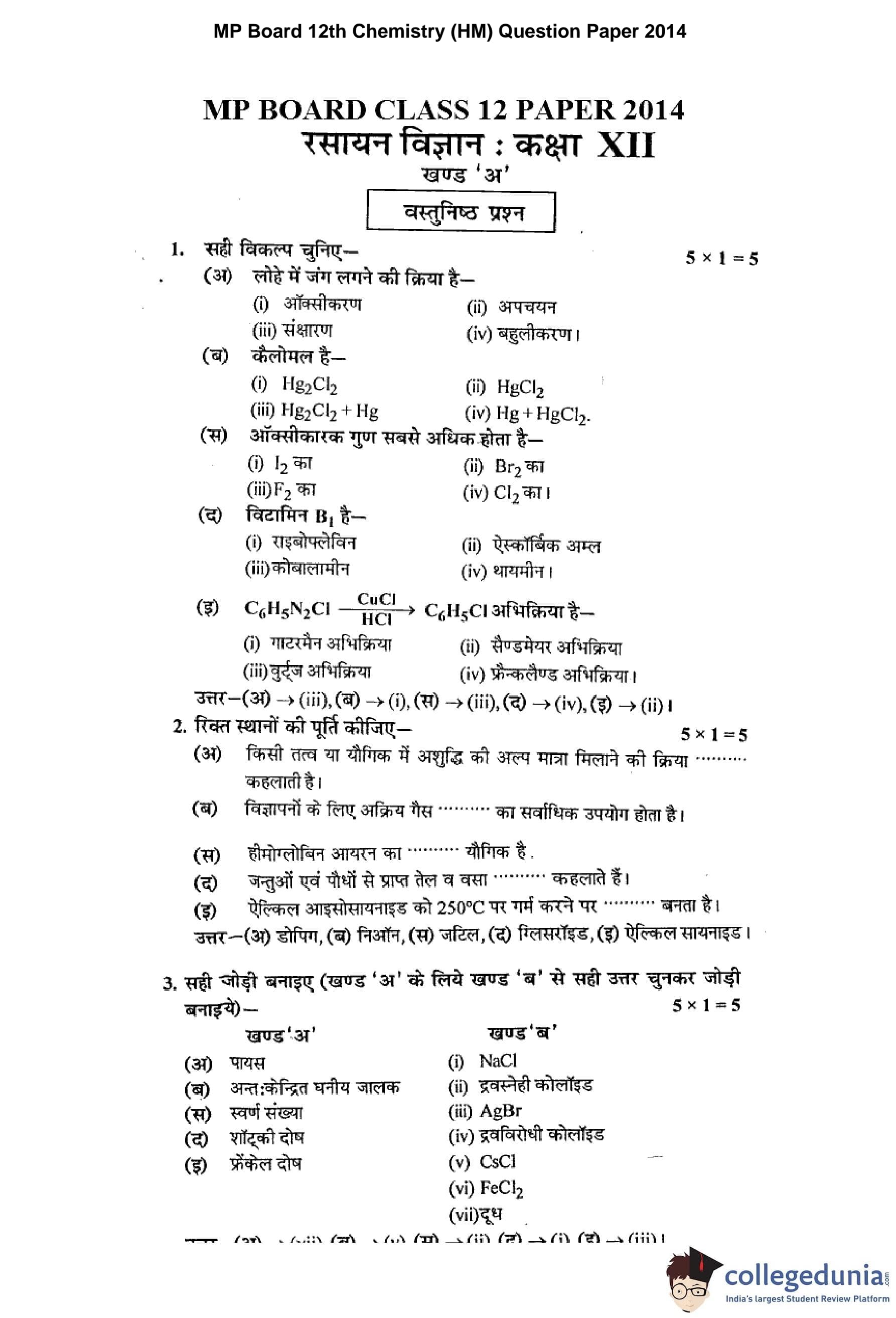 MP Board 12th Chemistry Hindi Question Paper 2014 with Answer Key