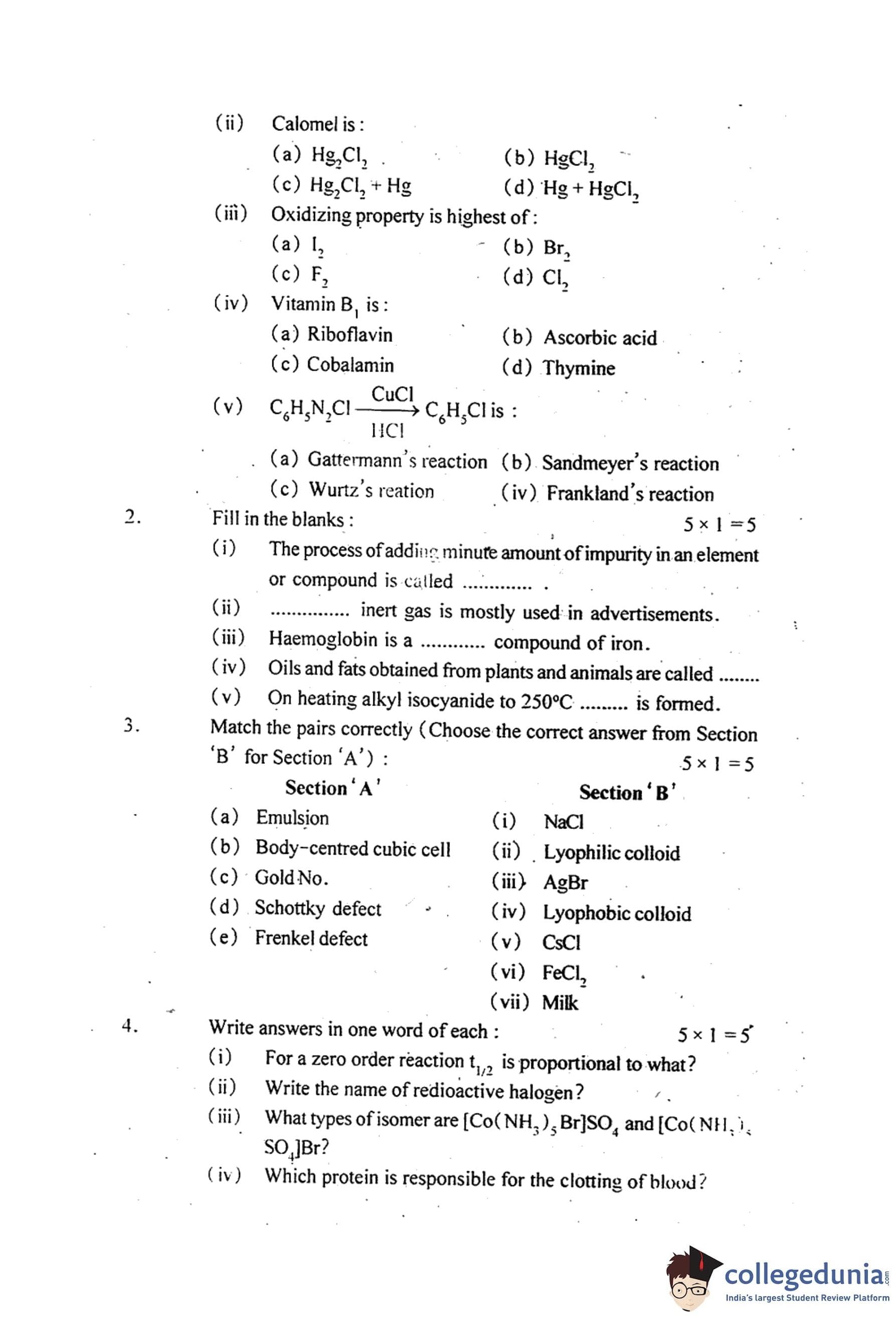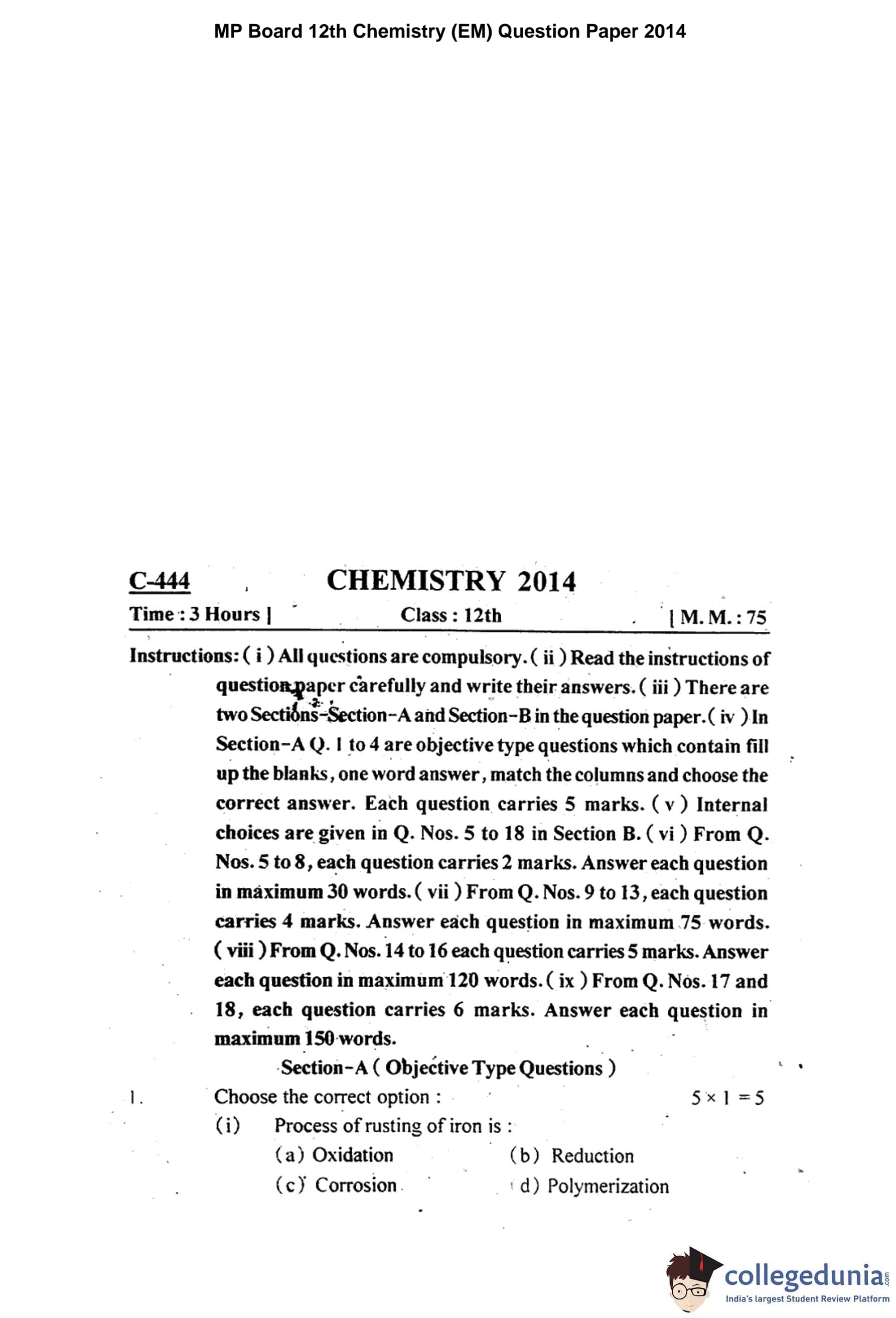 MP Board 12th Chemistry Question Paper 2014 with Answer Key
