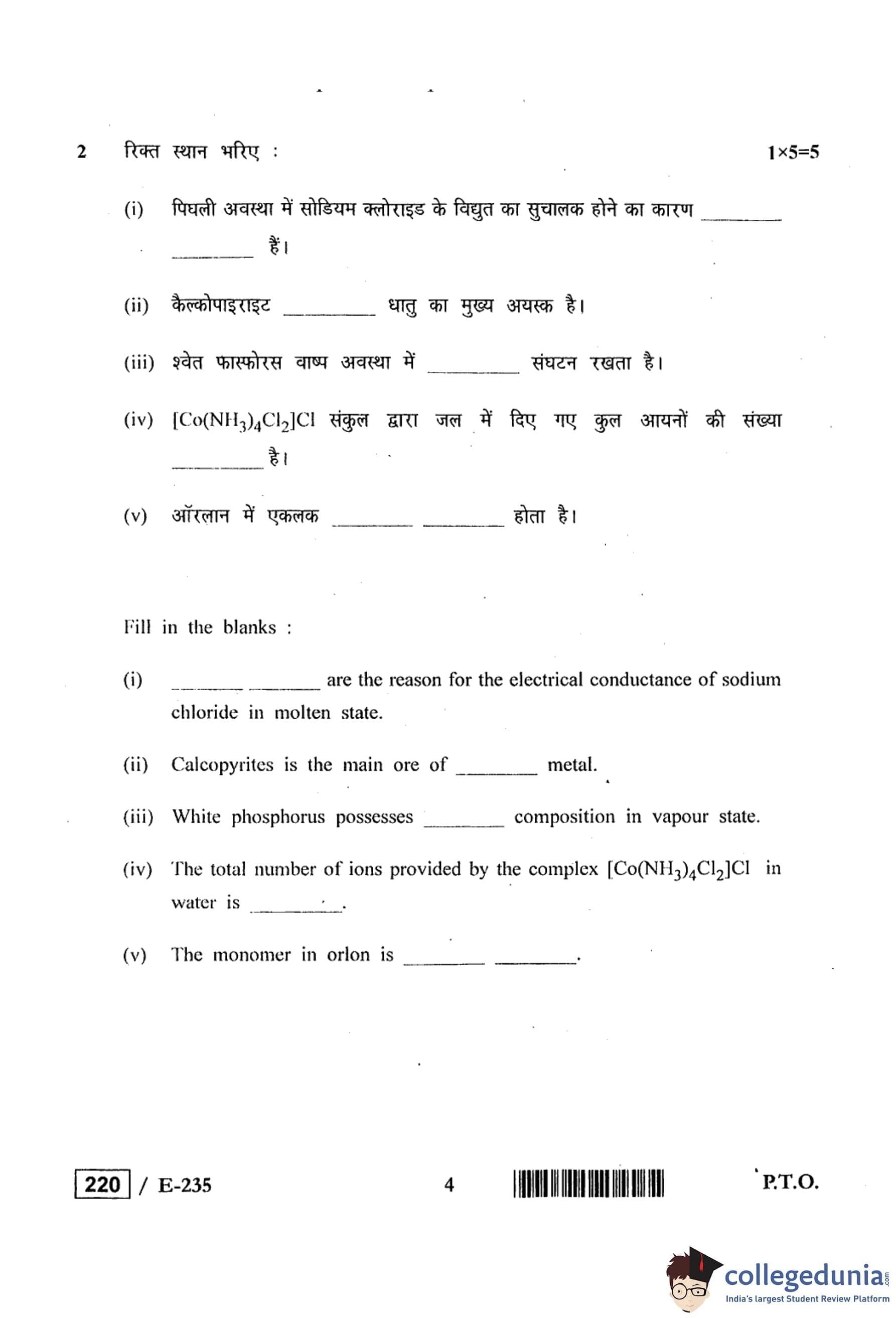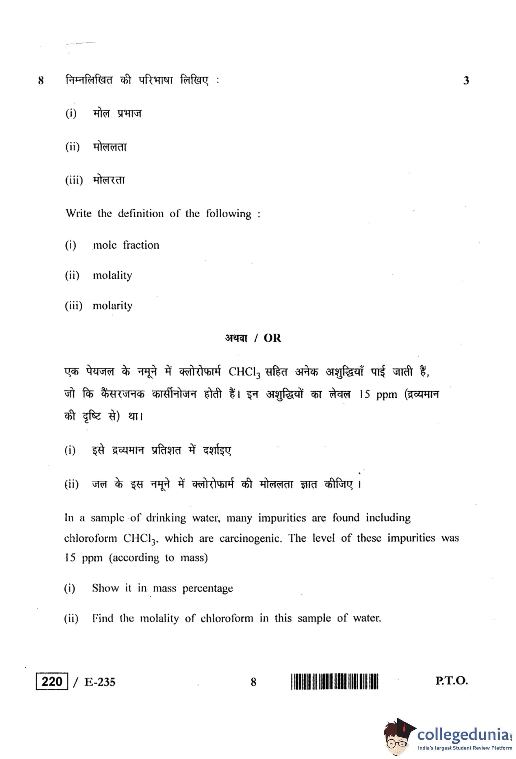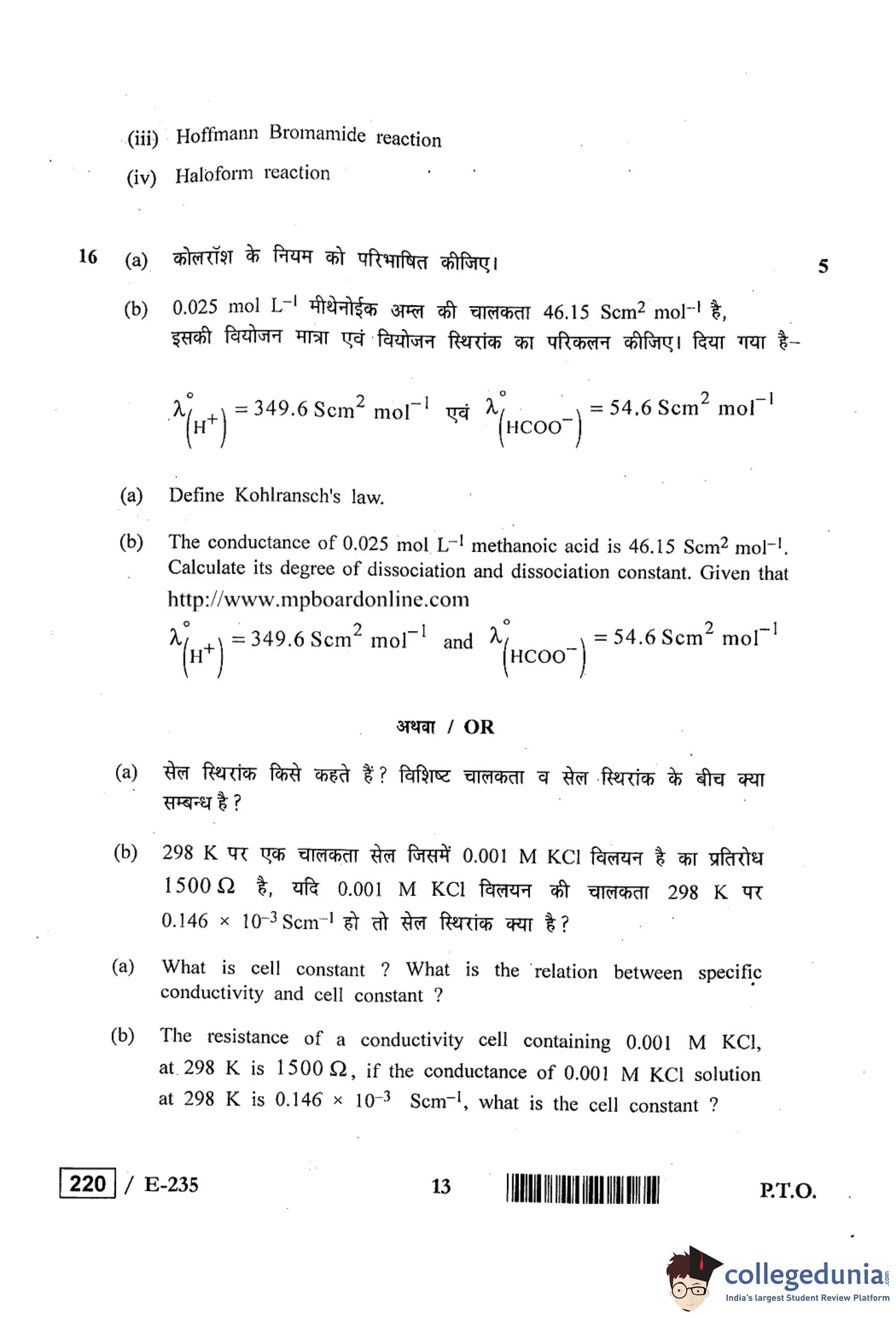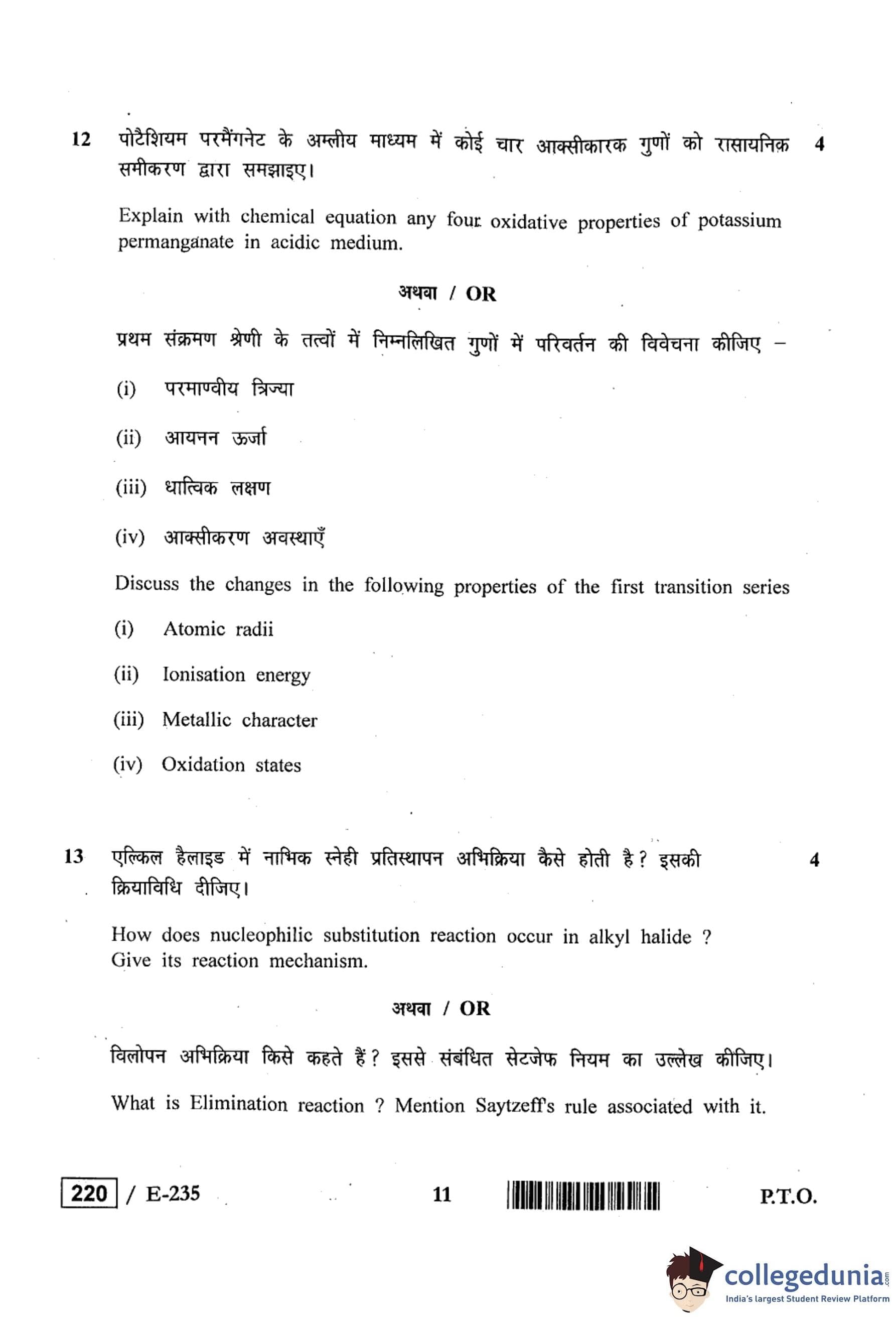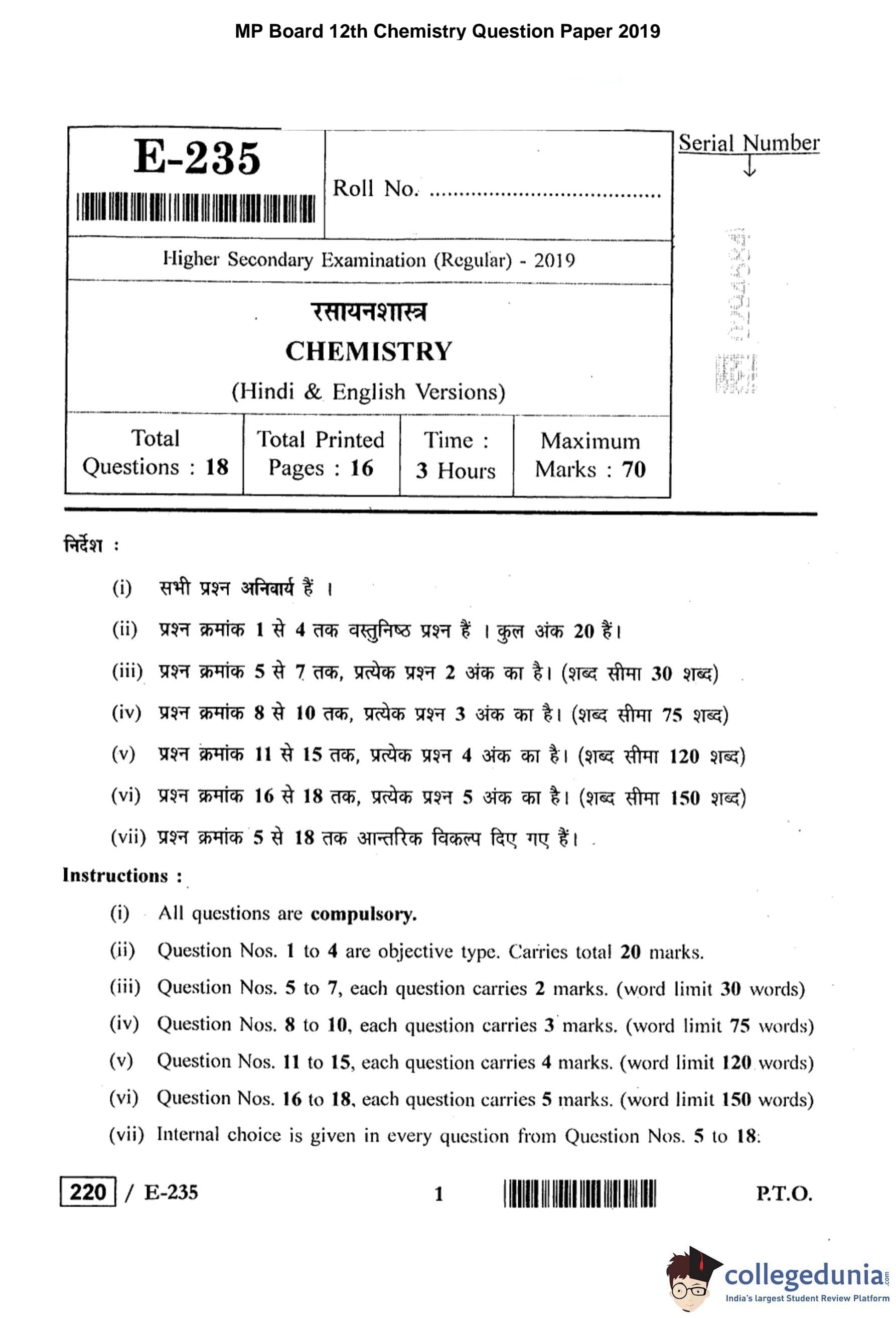 MP Board 12th Chemistry Question Paper 2019 with Answer Key