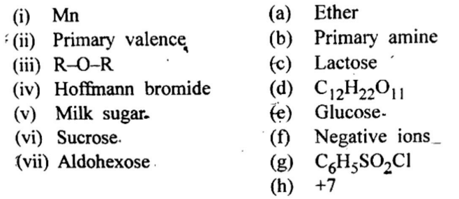 The pairs are correctly matched as follows: \[ (i) - C_{12}H_{22}O_{11}, \quad (ii) - Glucose, \quad (iii) - +7, \quad (iv) - Negative ions, \quad (v) - Ether, \] \[(vi) - Primary amine, \quad (vii) - Lactose.\] Quick Tip: Matching terms in chemistry often involves recognizing functional groups, molecular formulas, and oxidation states.