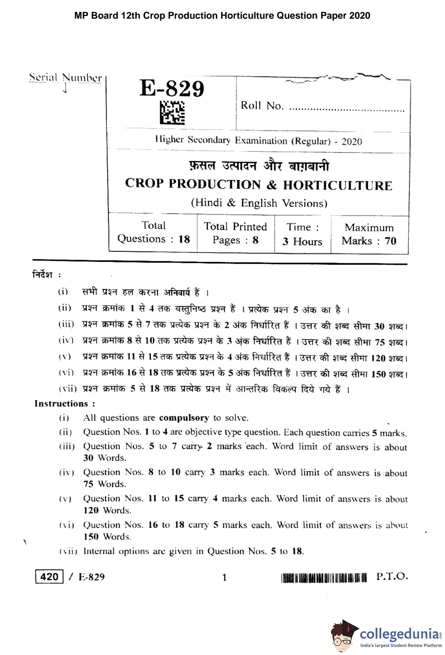 | MP Board 12th Crop Production Horticulture Question Paper 2020 PDF | MP Board 12th Crop Production Horticulture Answer Key 2020 PDF |