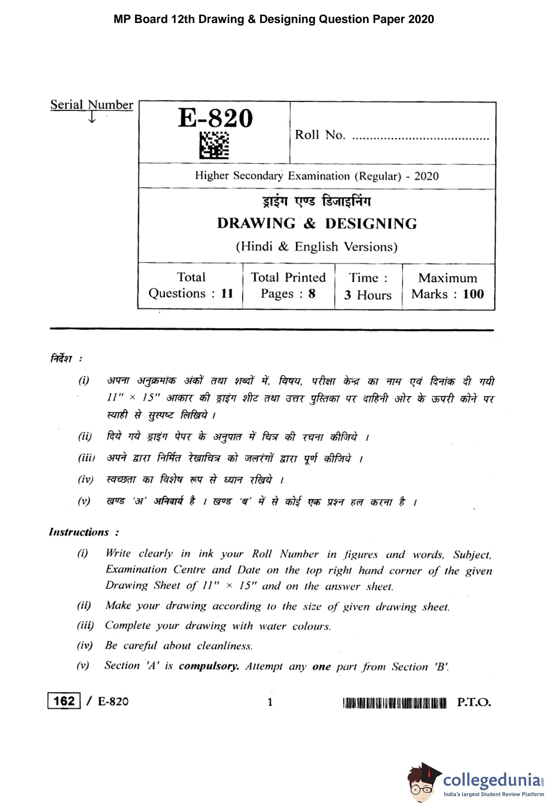 MP Board 12th Drawing & Designing Question Paper 2020 with Answer Key pdf is available for download here. The exam was conducted by Madhya Pradesh Board of Secondary Education, MPBSE on March 23, 2020 in the Morning Session 8 AM to 11 AM. The question paper comprised a total of 11 questions divided among 2 sections.