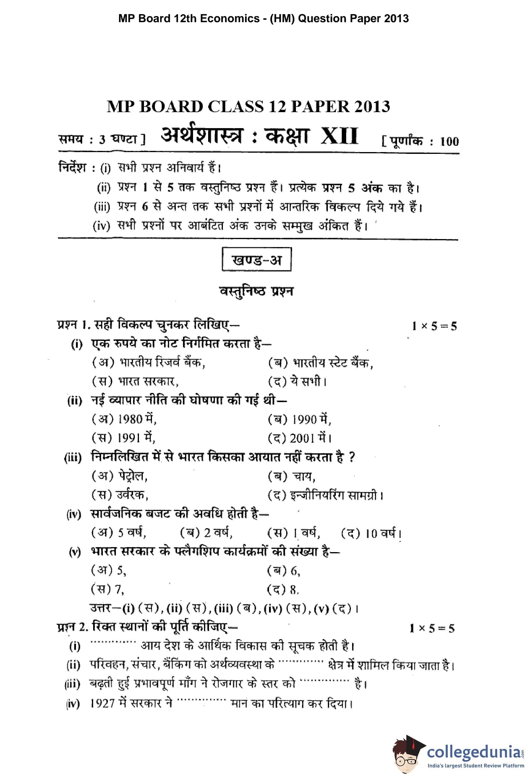 MP Board 12th Economics Hindi Question Paper 2013 with Answer Key pdf is available for download here. The exam was conducted by Madhya Pradesh Board of Secondary Education, MPBSE. The question paper comprised a total of 21 questions divided among 2 sections.