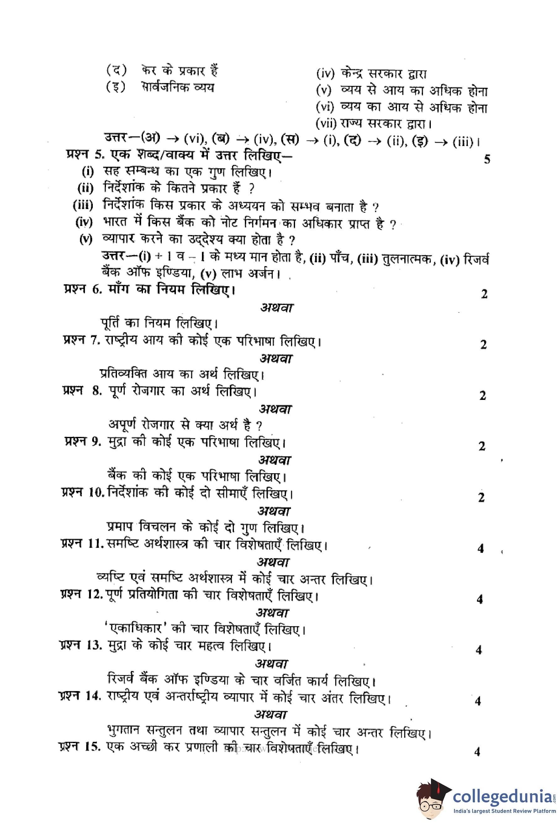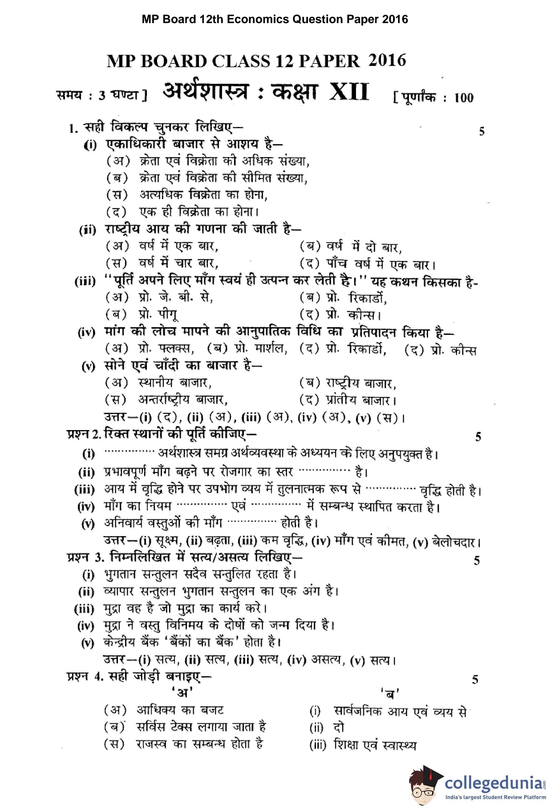 MP Board 12th Economics Question Paper 2016 with Answer Key