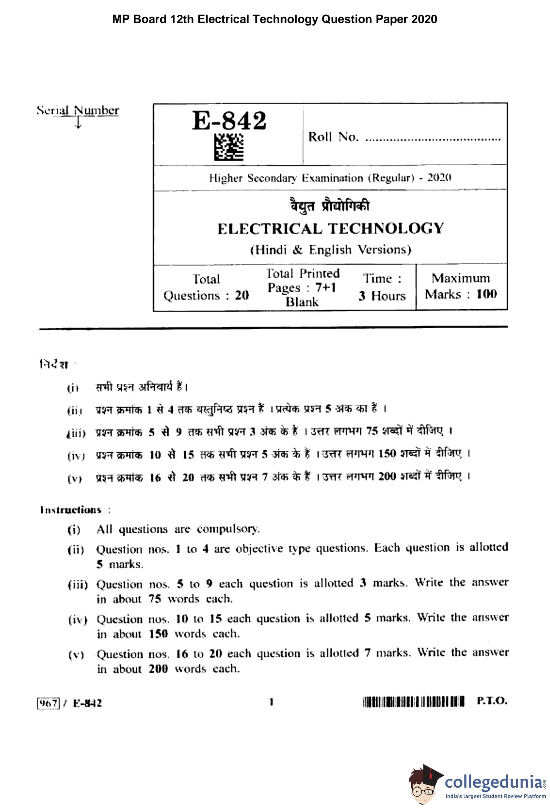 MP Board 12th Electrical Technology Question Paper 2020 with Answer Key pdf is available for download here. The exam was conducted by Madhya Pradesh Board of Secondary Education, MPBSE. The question paper comprised a total of 20 questions.