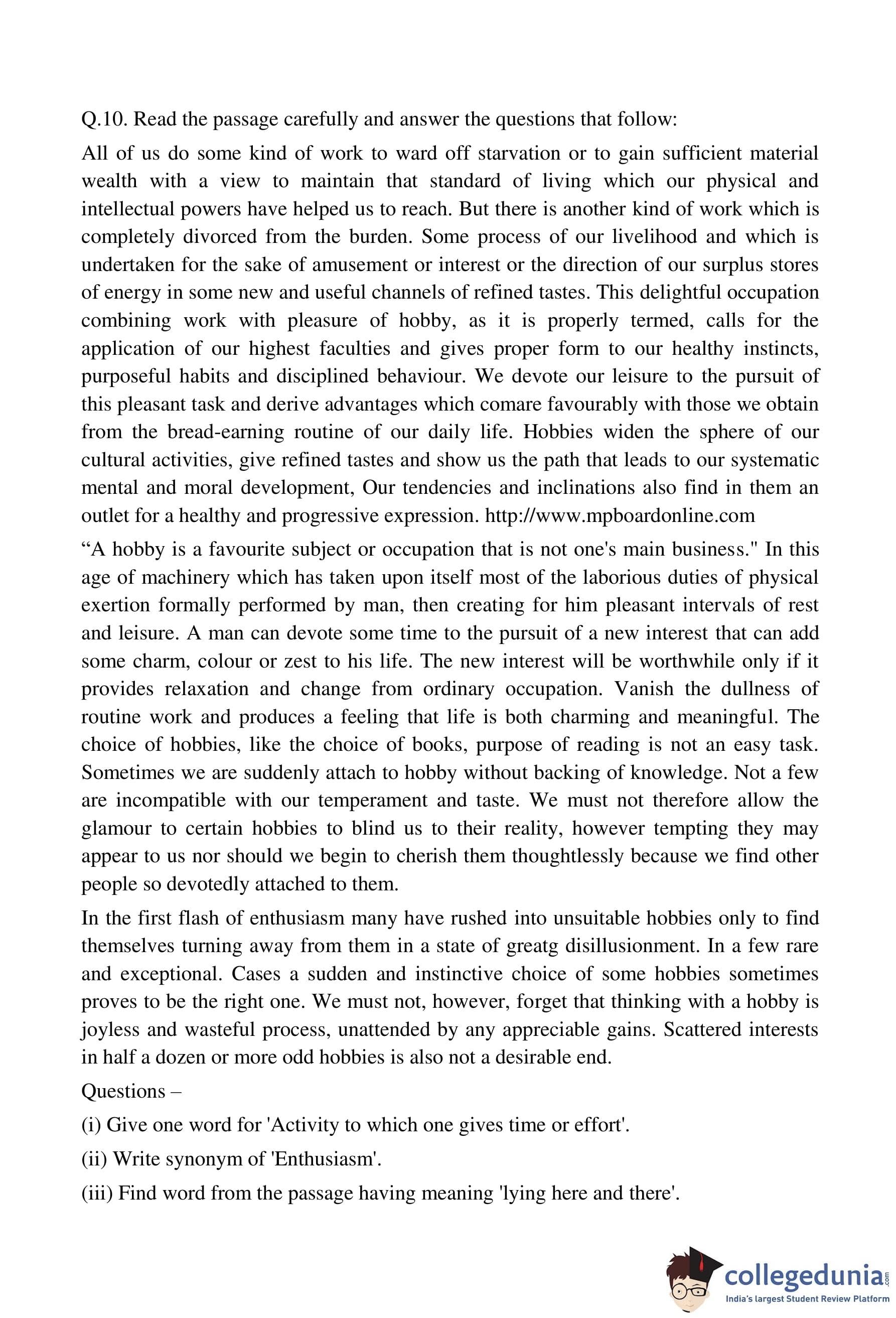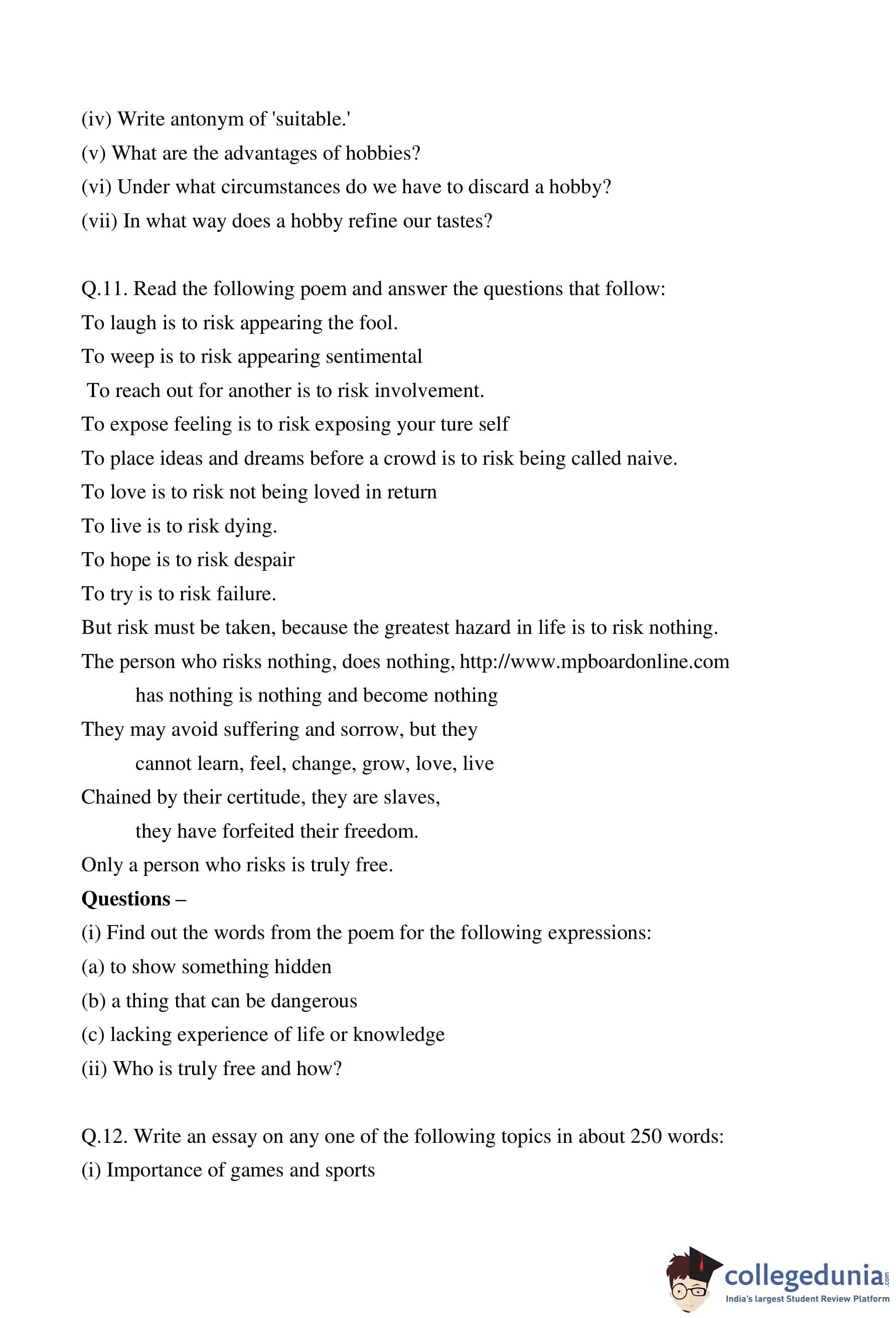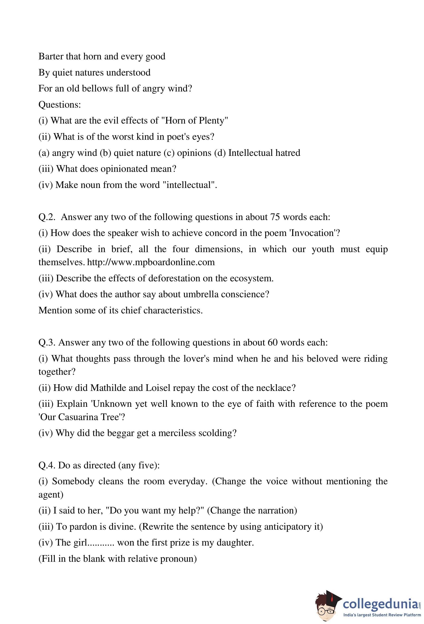 MP Board 12th English Special Question Paper 2012 with Answer Key