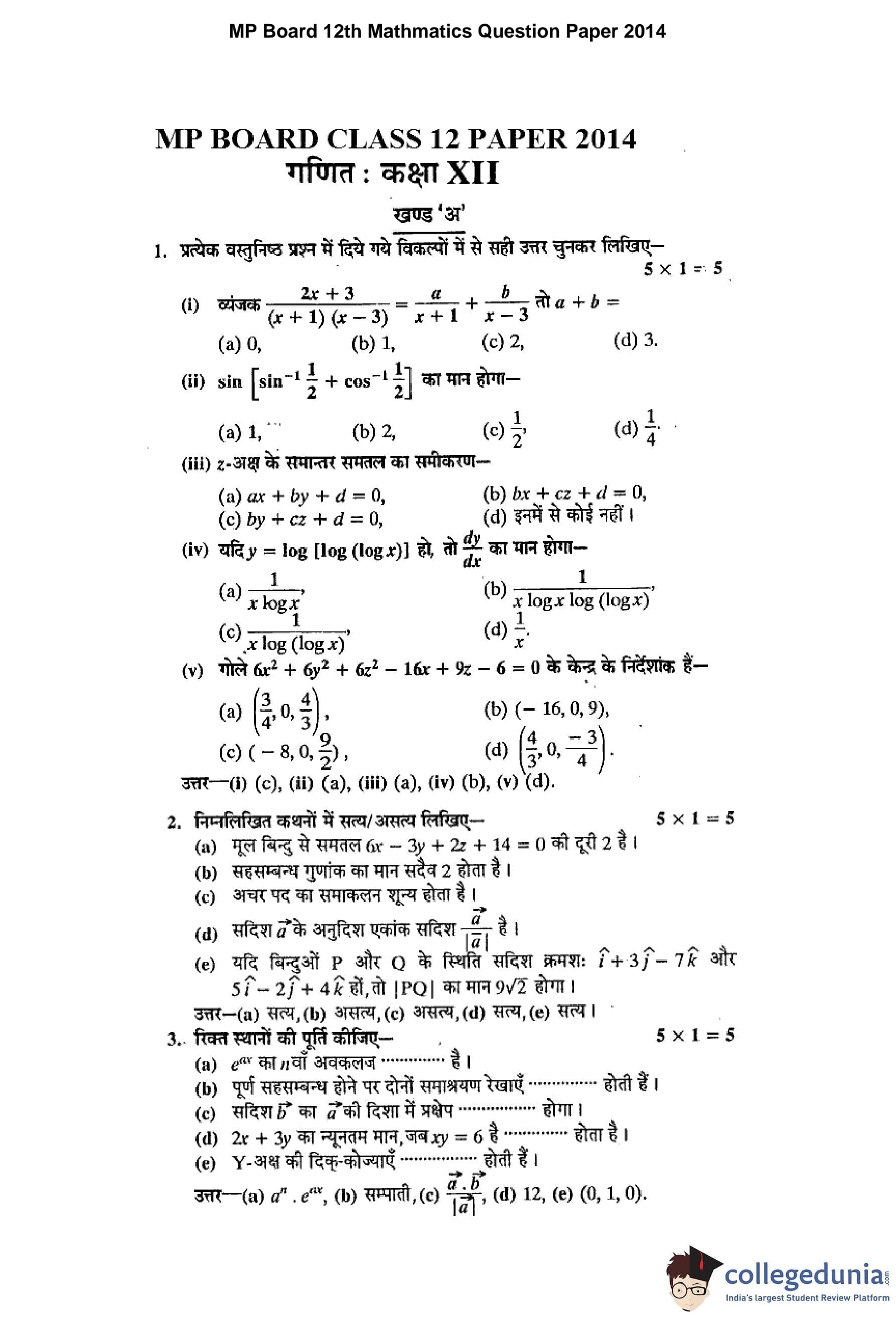 | MP Board 12th Higher Mathematics Question Paper 2014 PDF | MP Board 12th Higher Mathematics Answer Key 2014 PDF |
