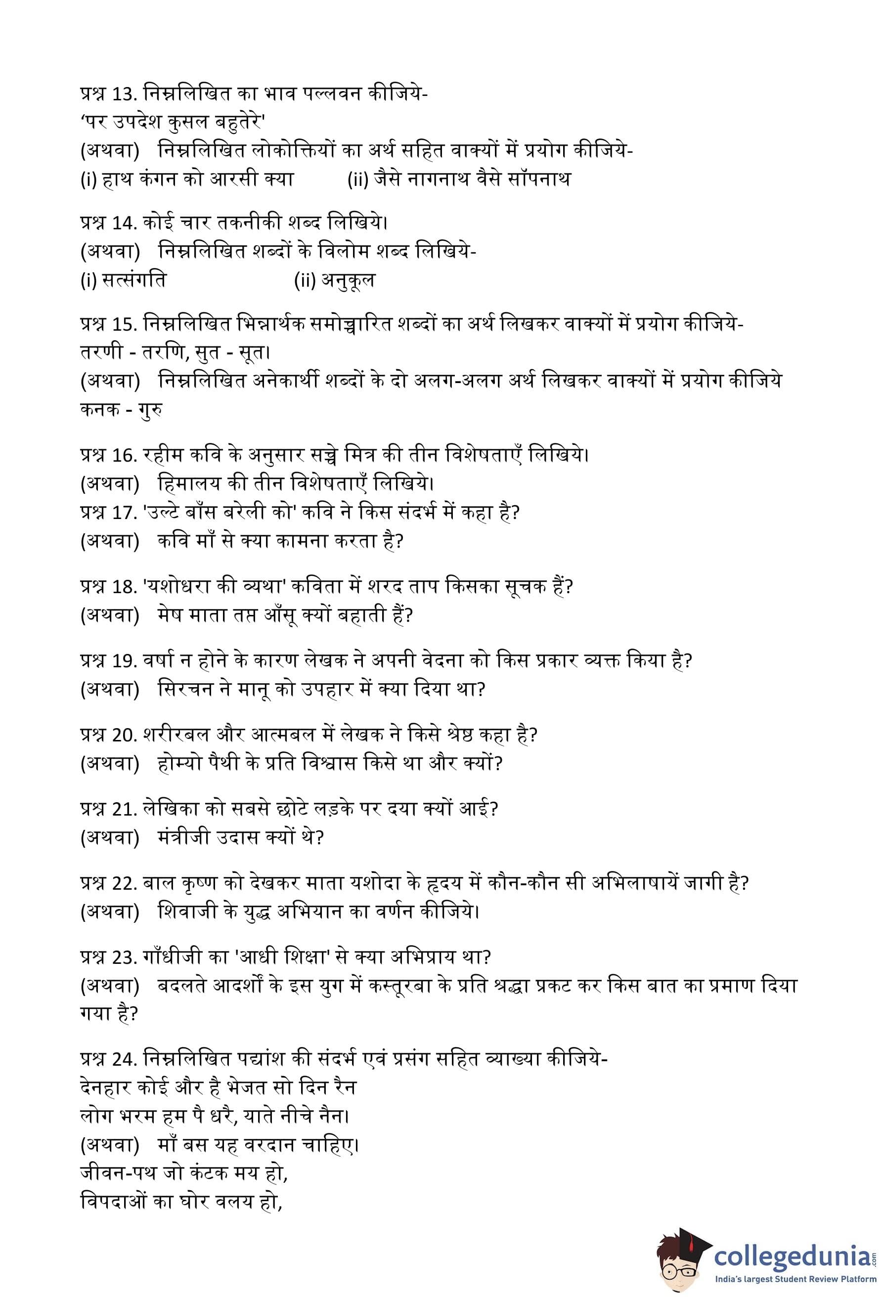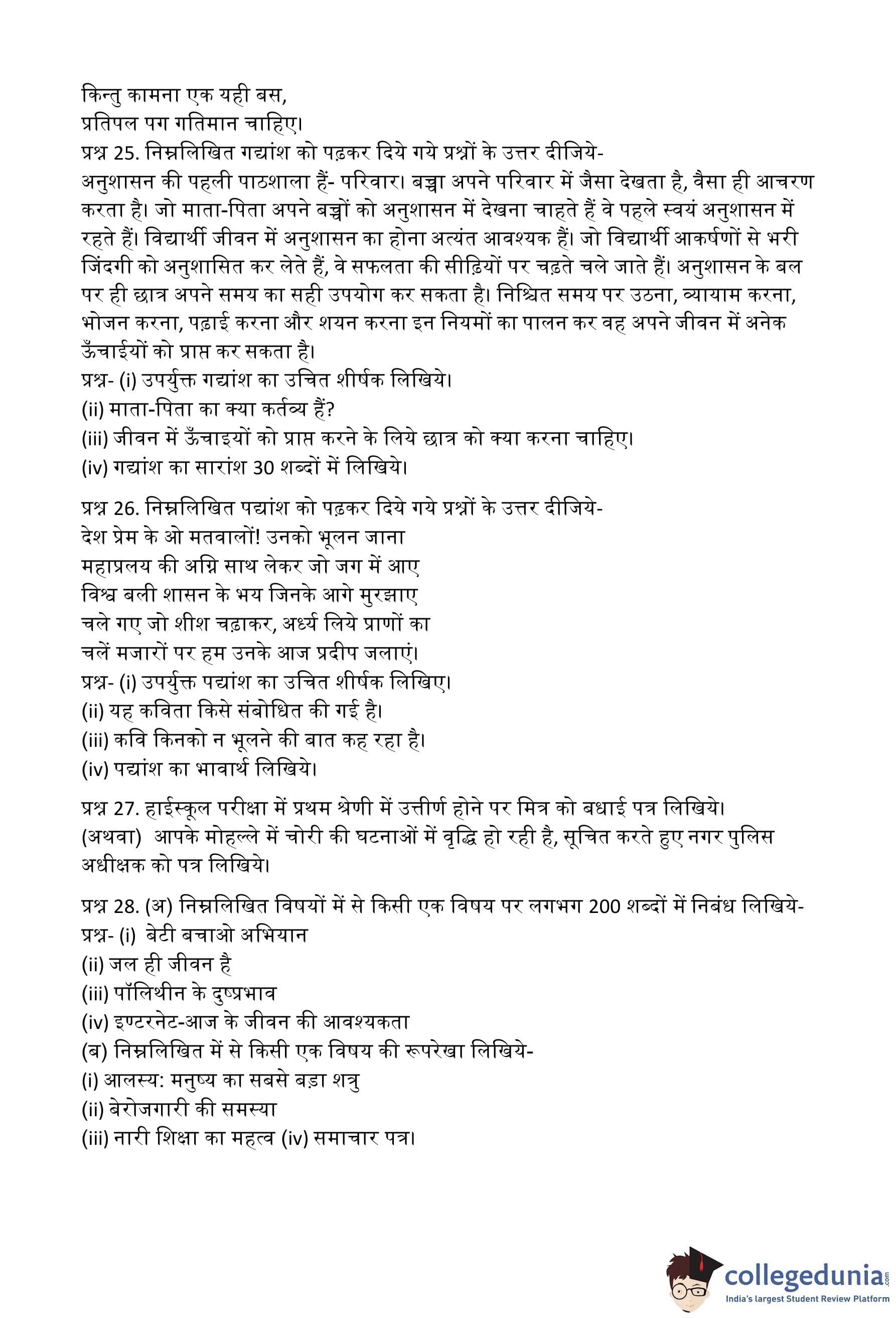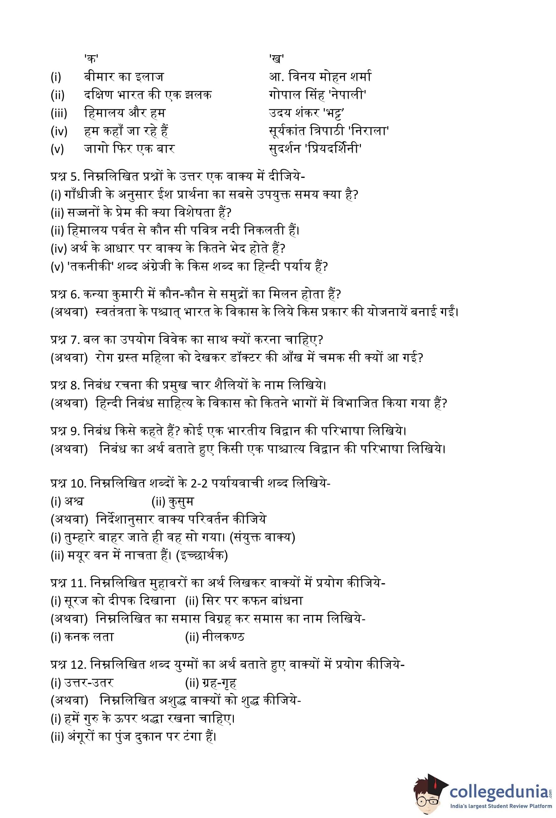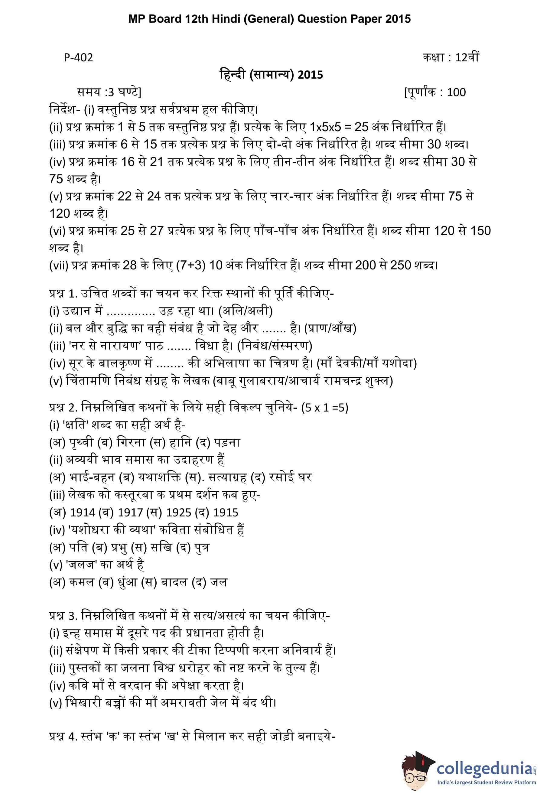 MP Board 12th Hindi (General) Question Paper 2015 with Answer Key