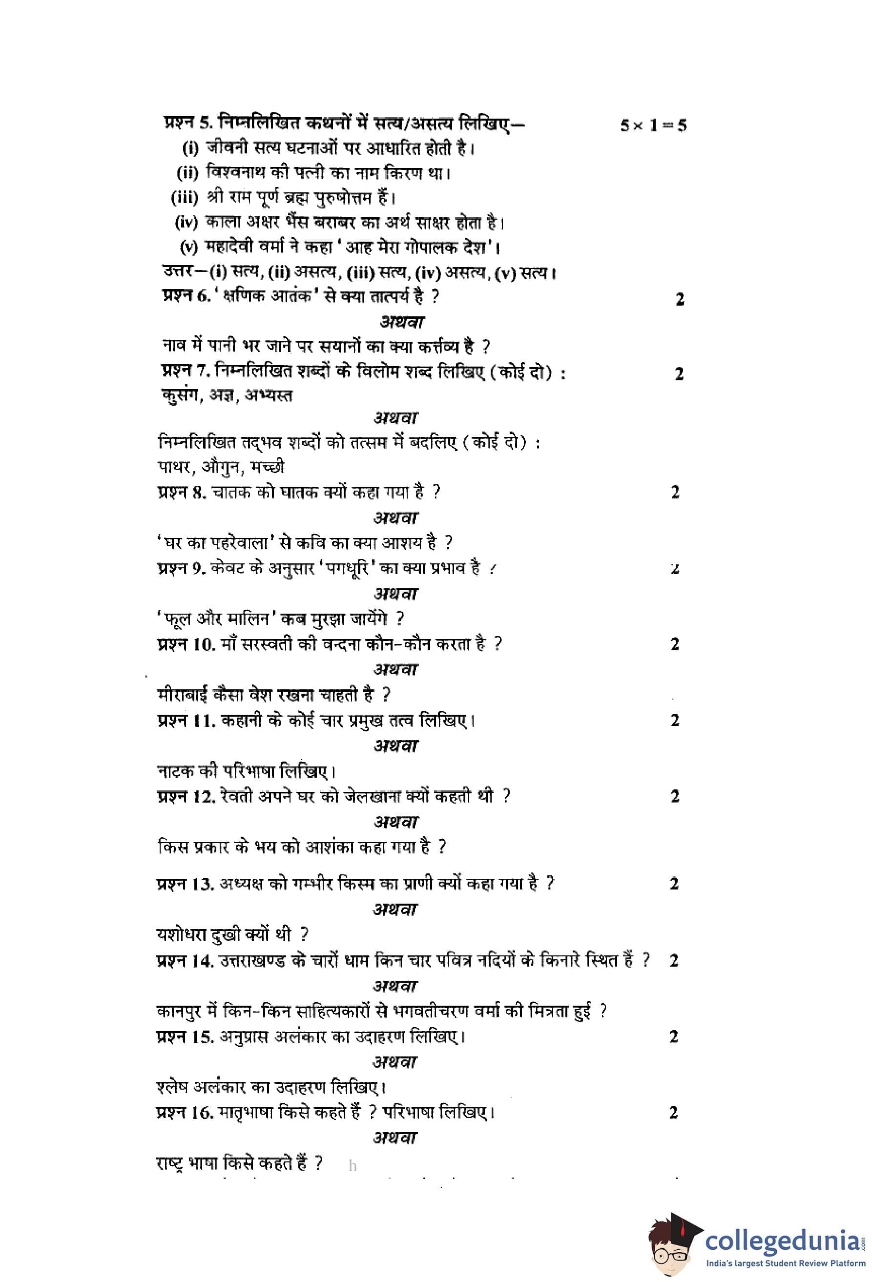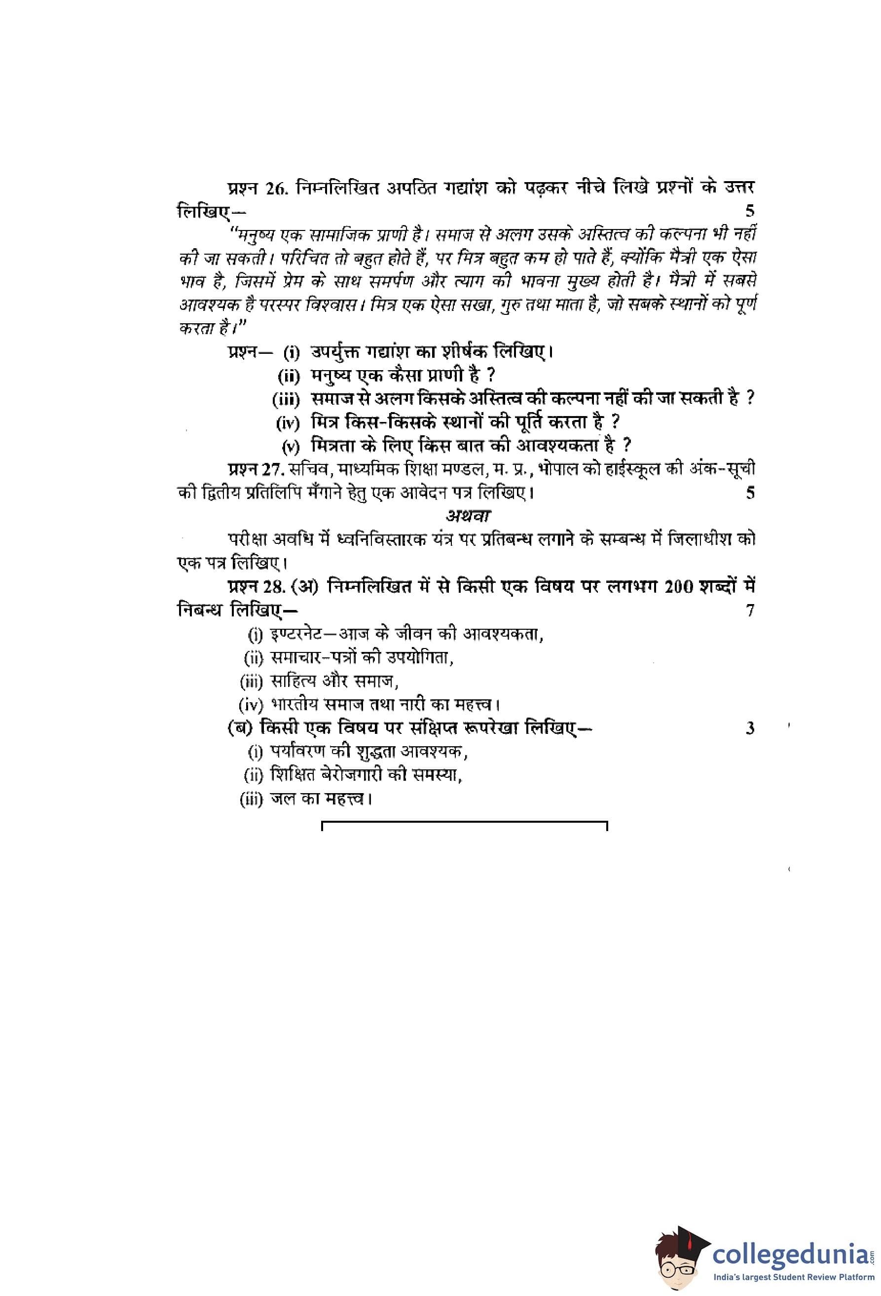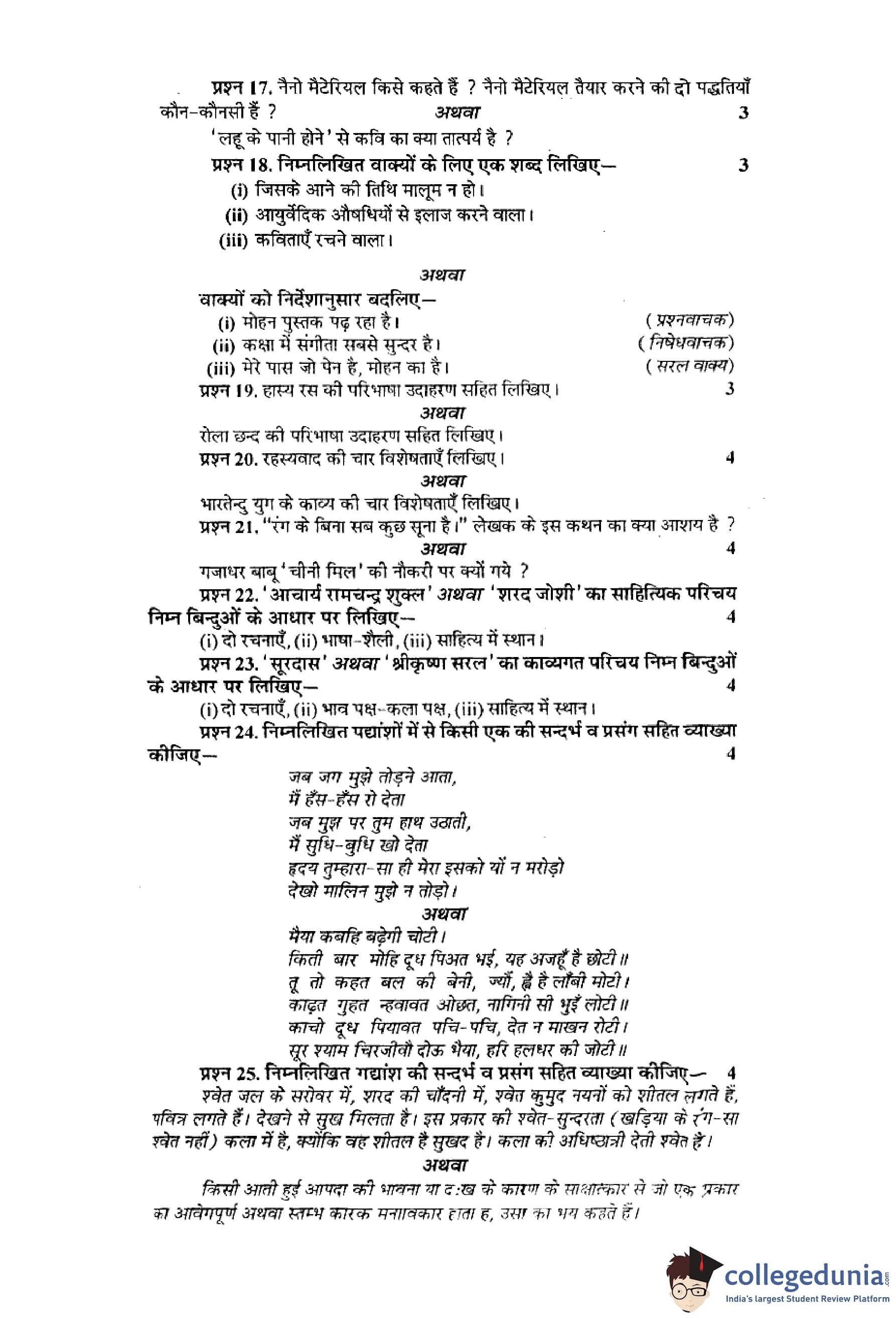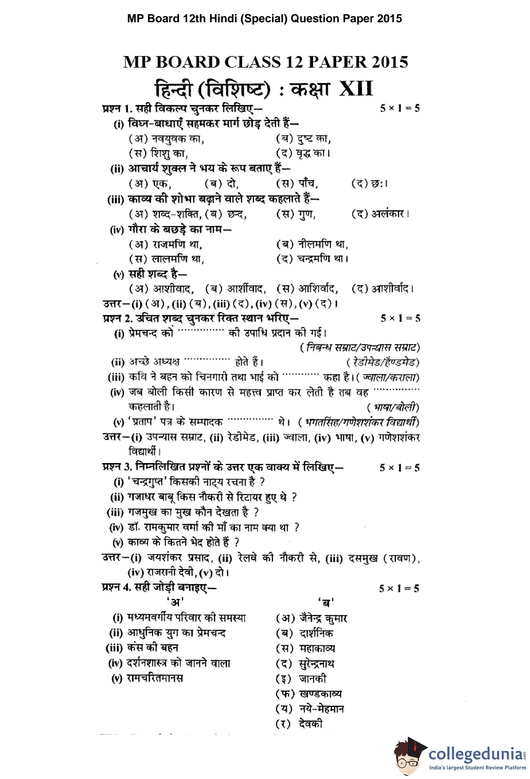 MP Board 12th Hindi (Special) Question Paper 2015 with Answer Key