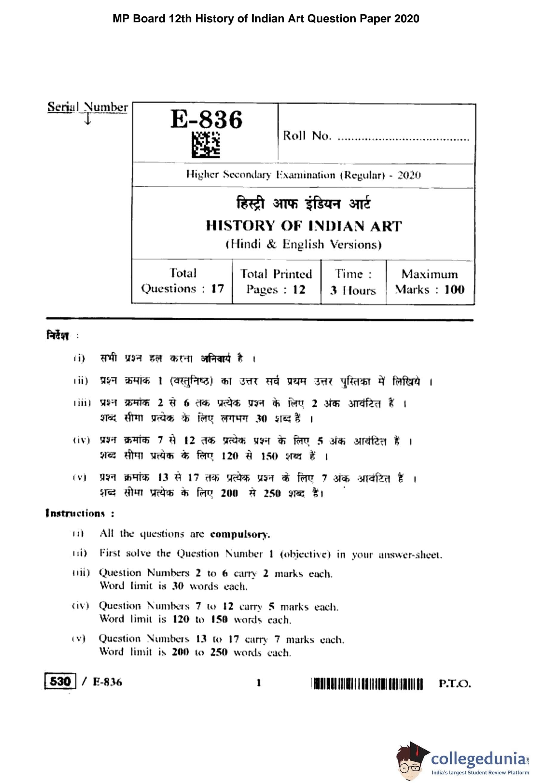 MP Board 12th History of Indian Art Question Paper 2020 with Answer Key pdf is available for download here. The exam was conducted by Madhya Pradesh Board of Secondary Education, MPBSE on April 7, 2020 in the Morning Session 8 AM to 11 AM. The question paper comprised a total of 17 questions.