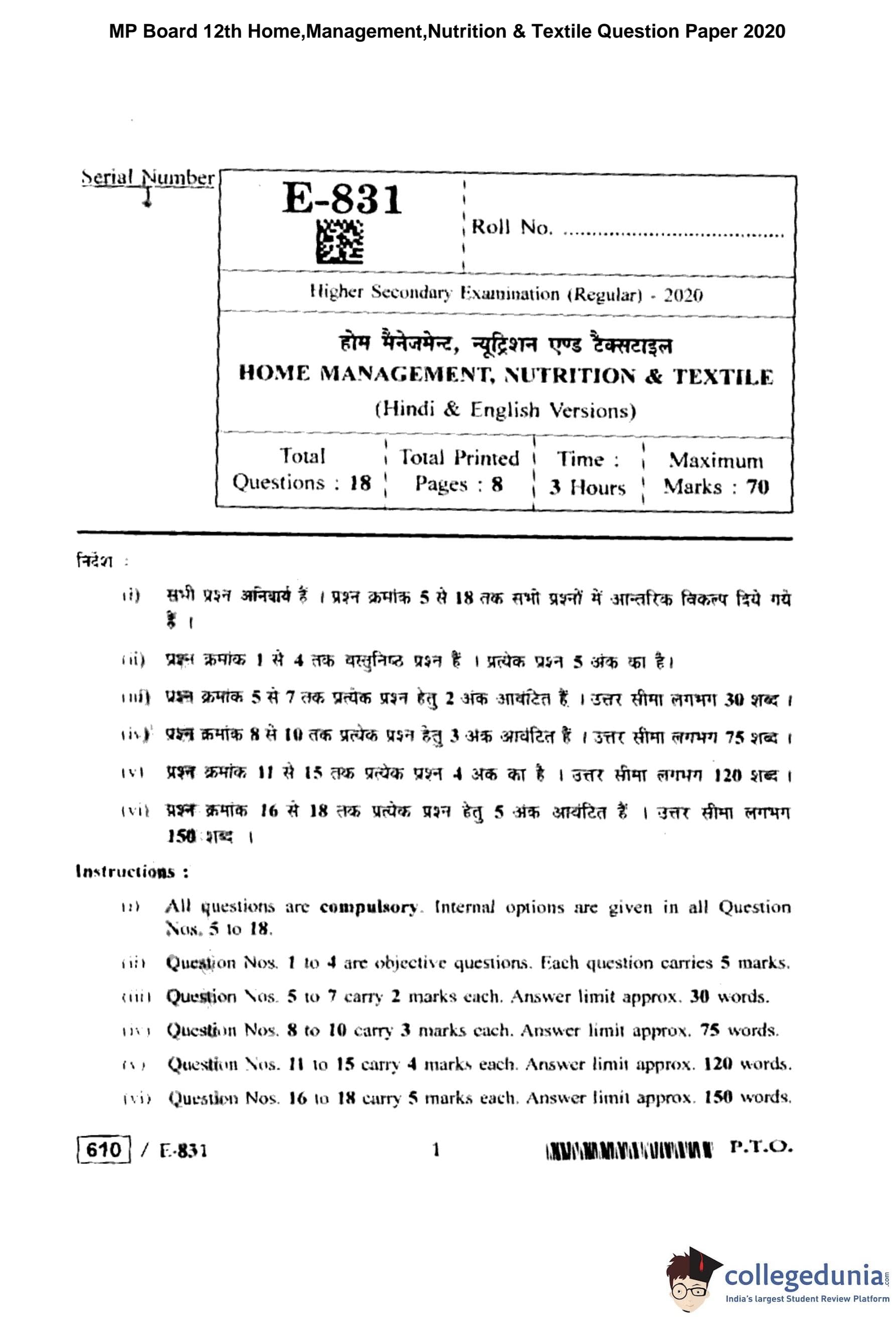 MP Board 12th Home Management, Nutrition & Textile Question Paper 2020 with Answer Key pdf is available for download here. The exam was conducted by Madhya Pradesh Board of Secondary Education, MPBSE on March 16, 2020 in the Morning Session 8 AM to 11 AM. The question paper comprised a total of 18 questions.