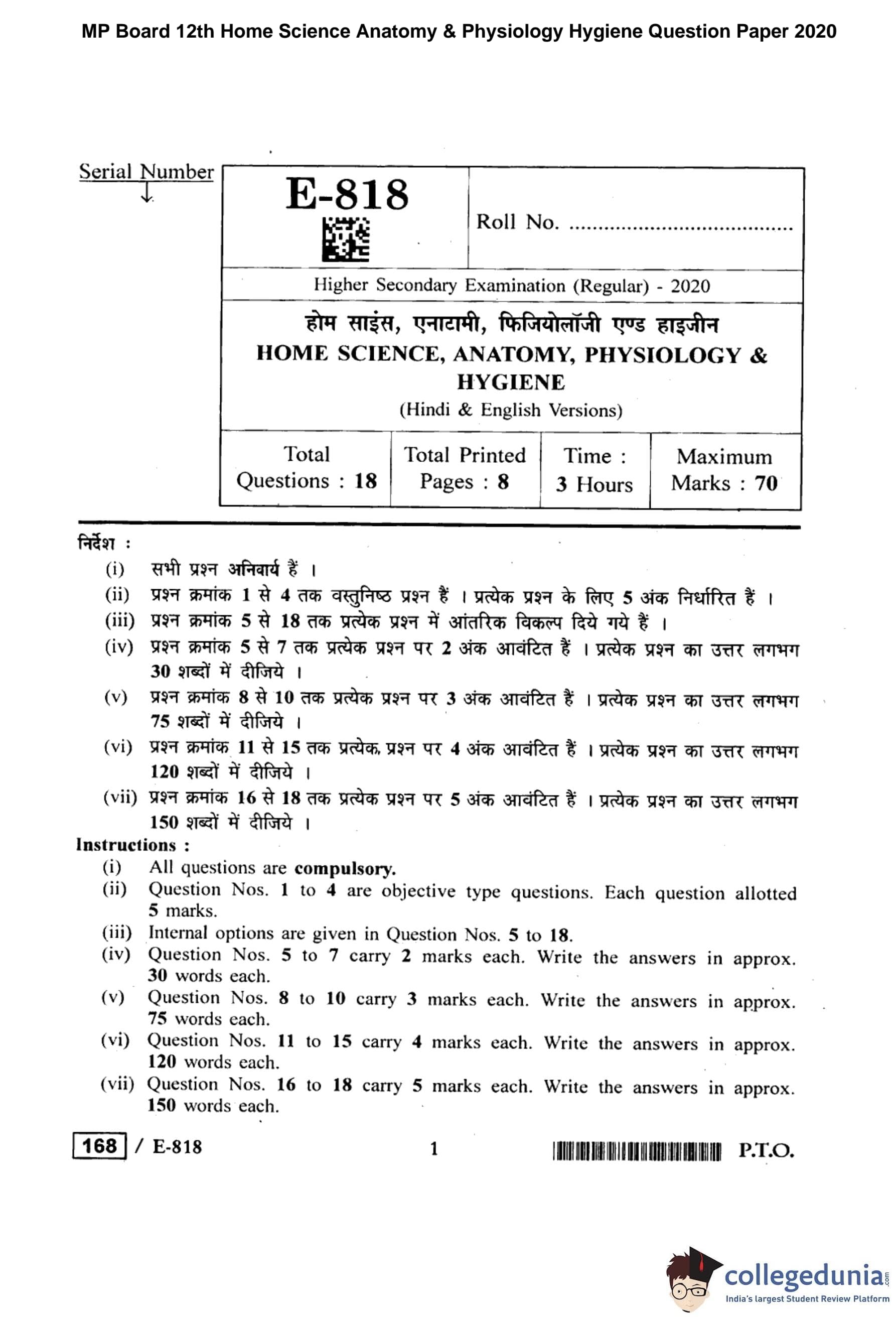 MP Board 12th Home Science, Anatomy, Physiology & Hygiene Question Paper 2020 with Answer Key pdf is available for download here. The exam was conducted by Madhya Pradesh Board of Secondary Education, MPBSE on in the . The question paper comprised a total of 18 questions.