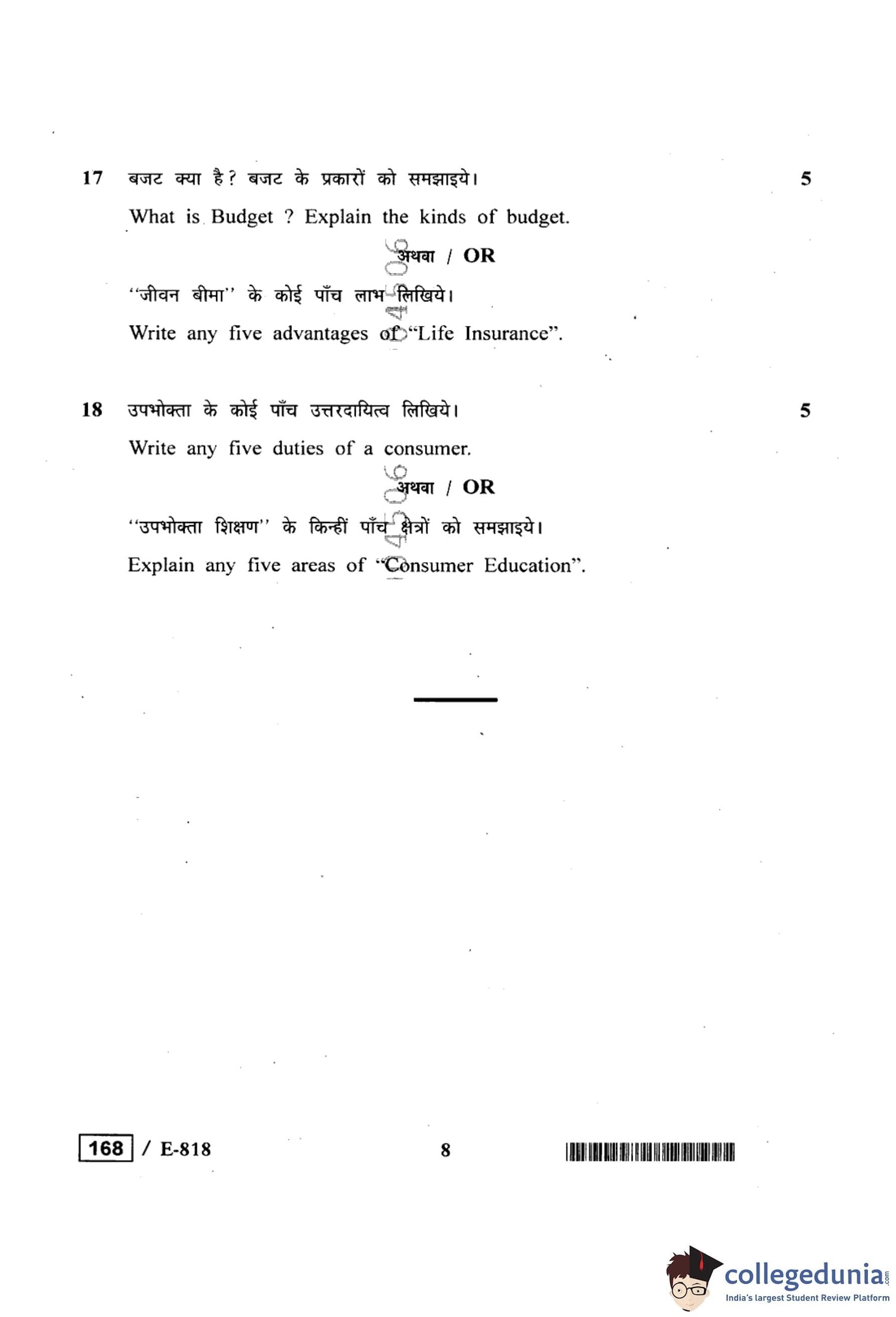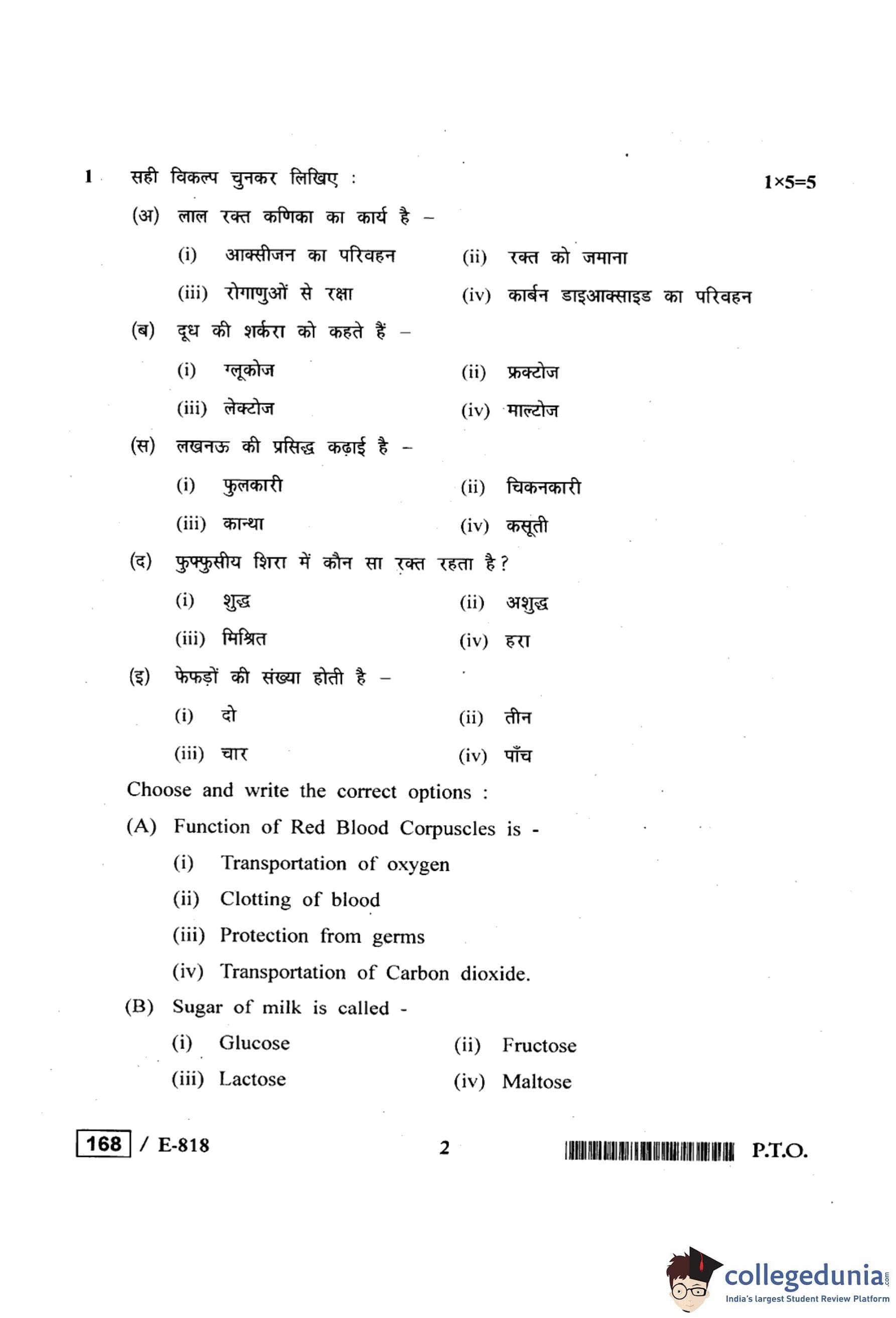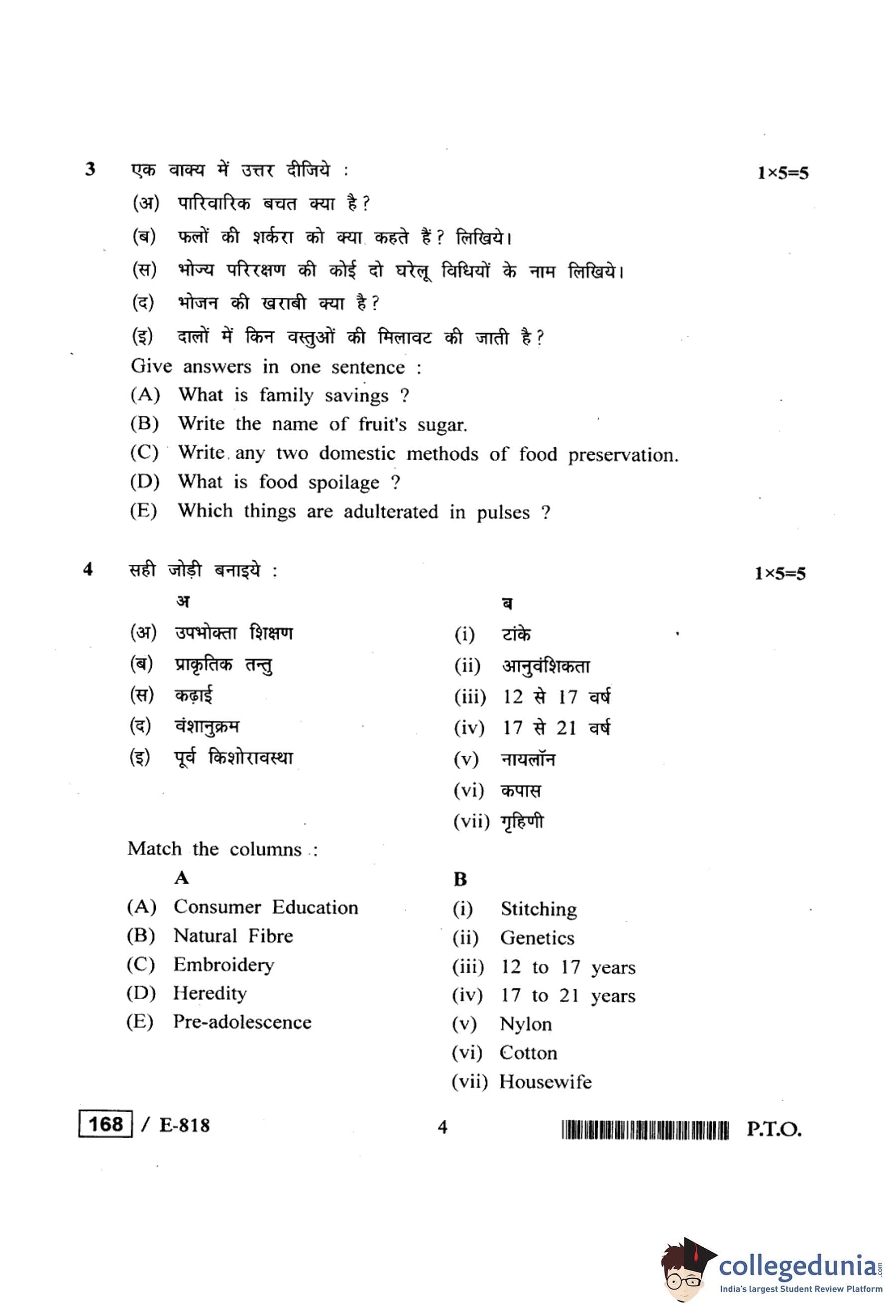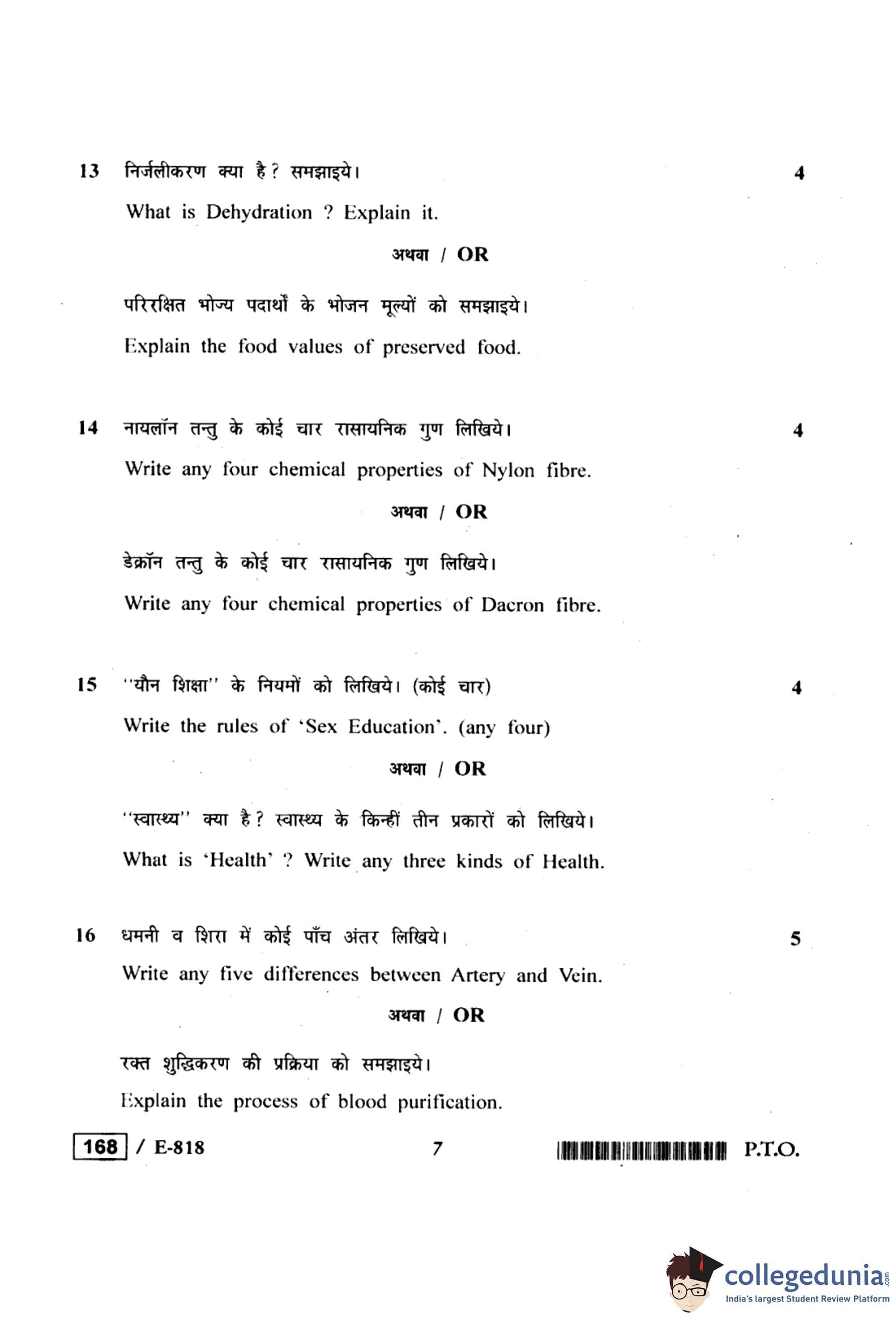 MP Board 12th Home Science, Anatomy, Physiology & Hygiene Question Paper 2020 with Answer Key