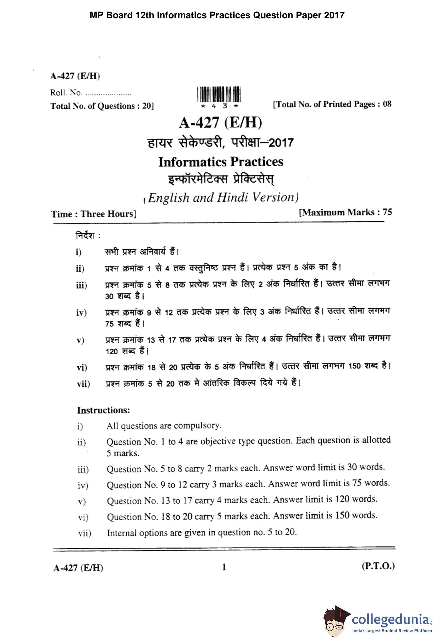 | MP Board 12th Informatics Practices Question Paper 2017 PDF | MP Board 12th Informatics Practices Answer Key 2017 PDF |
