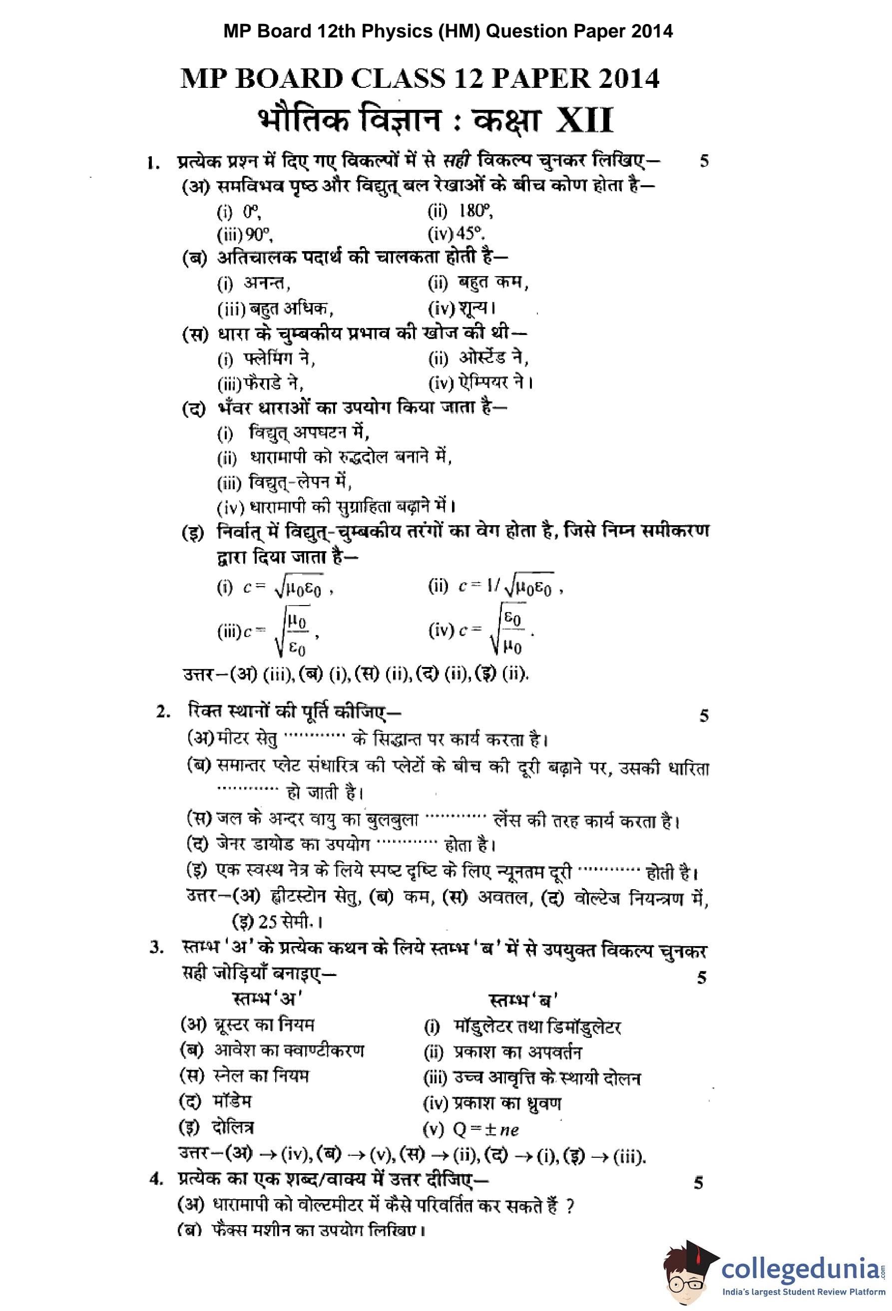 MP Board 12th Physics Hindi Question Paper 2014 with Answer Key
