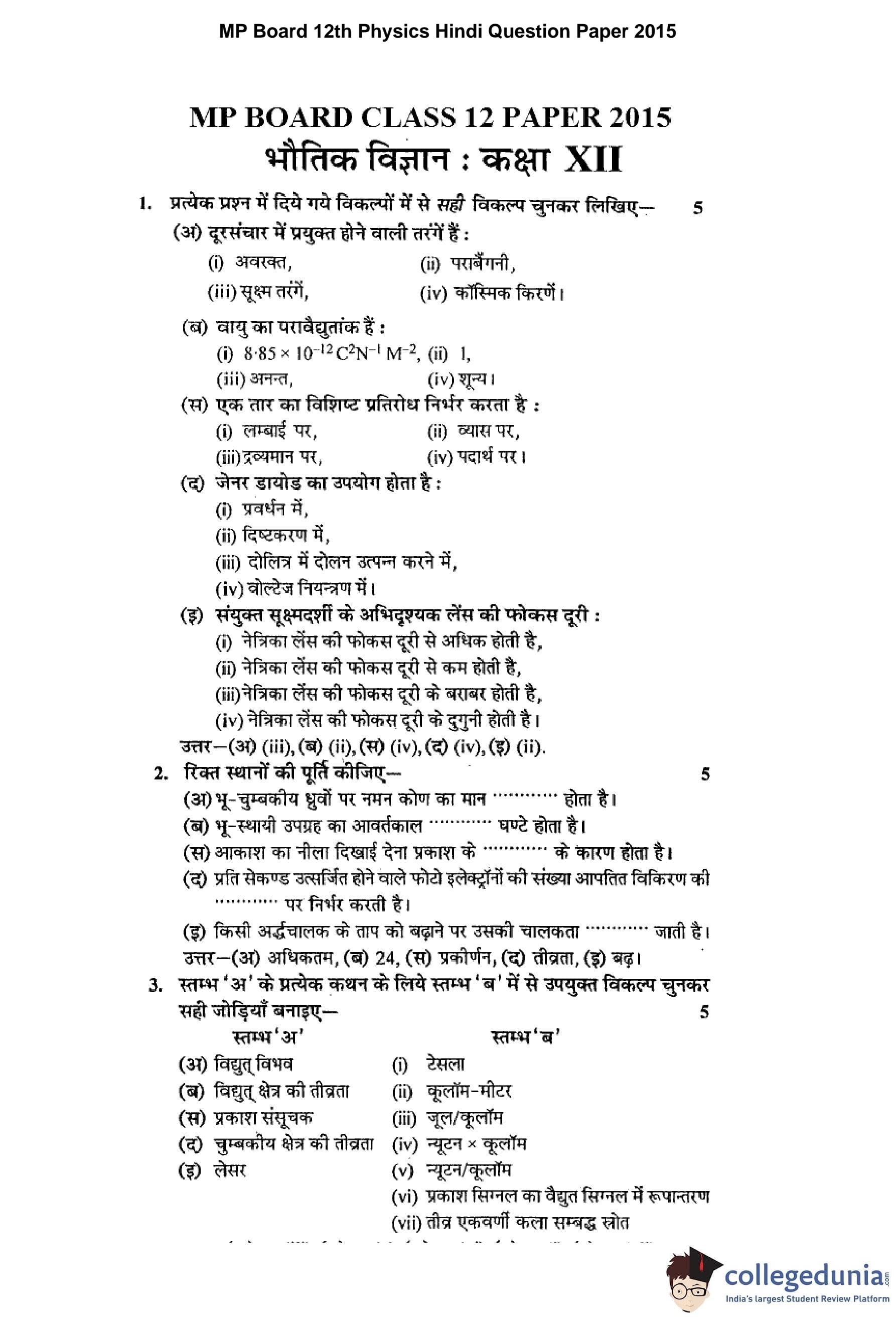 MP Board 12th Physics Hindi Question Paper 2015 with Answer Key