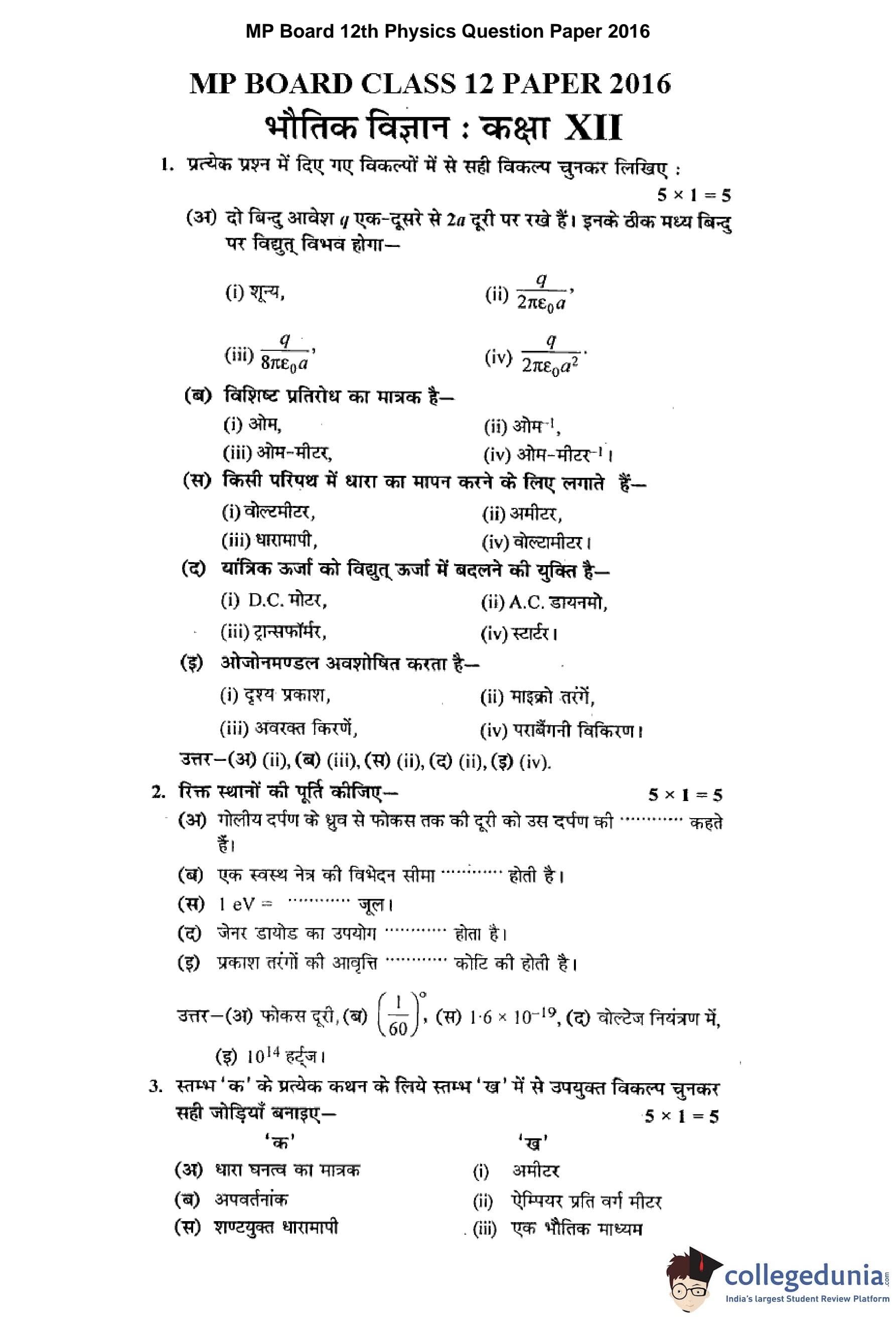 | MP Board 12th Physics Question Paper 2016 PDF | MP Board 12th Physics Answer Key 2016 PDF |