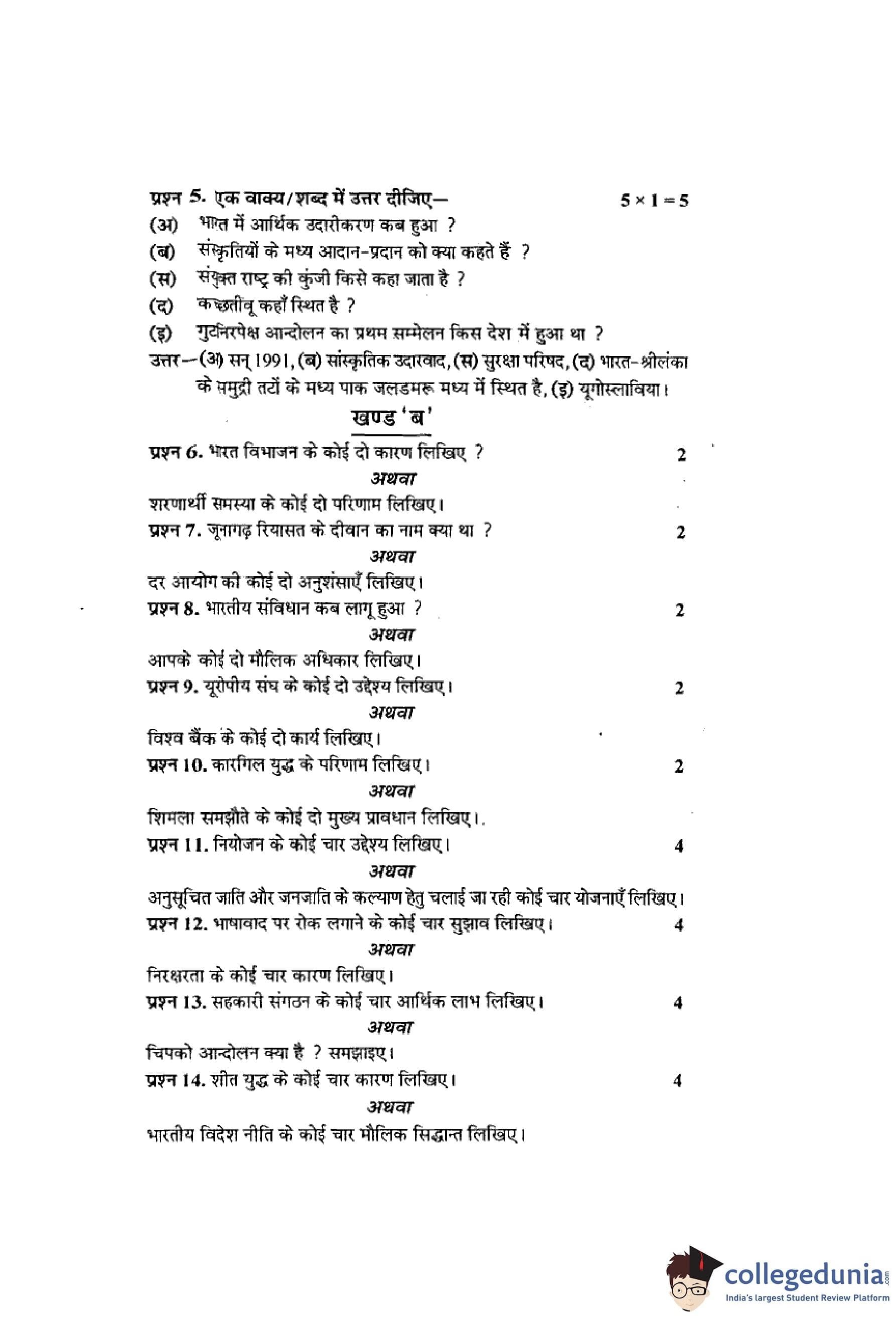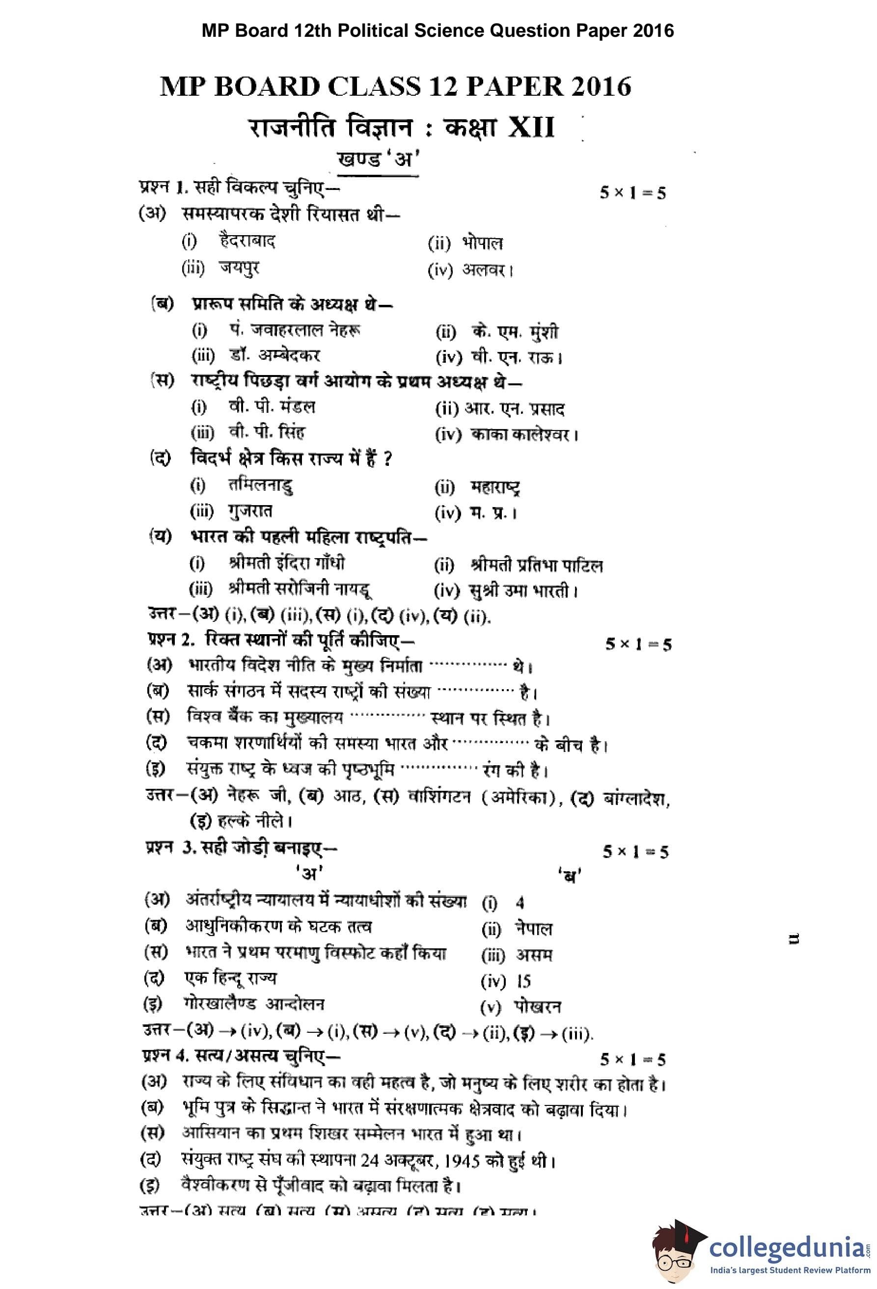 MP Board 12th Political Science Question Paper 2016 with Answer Key