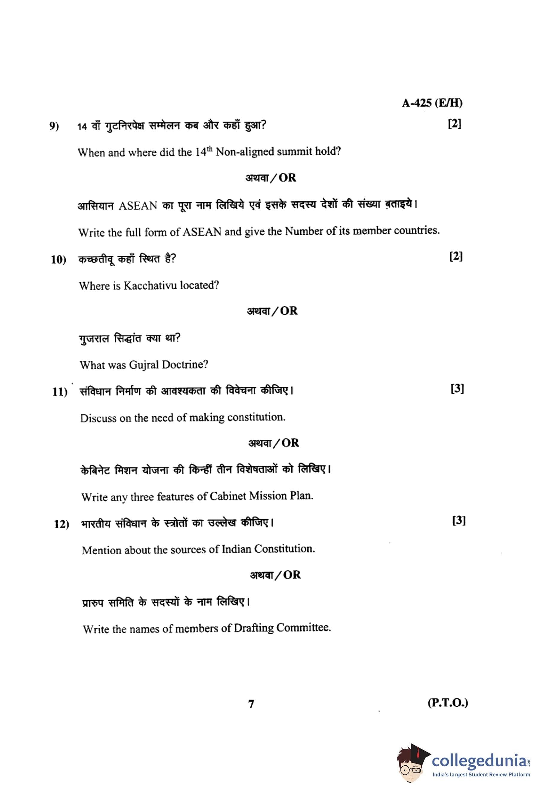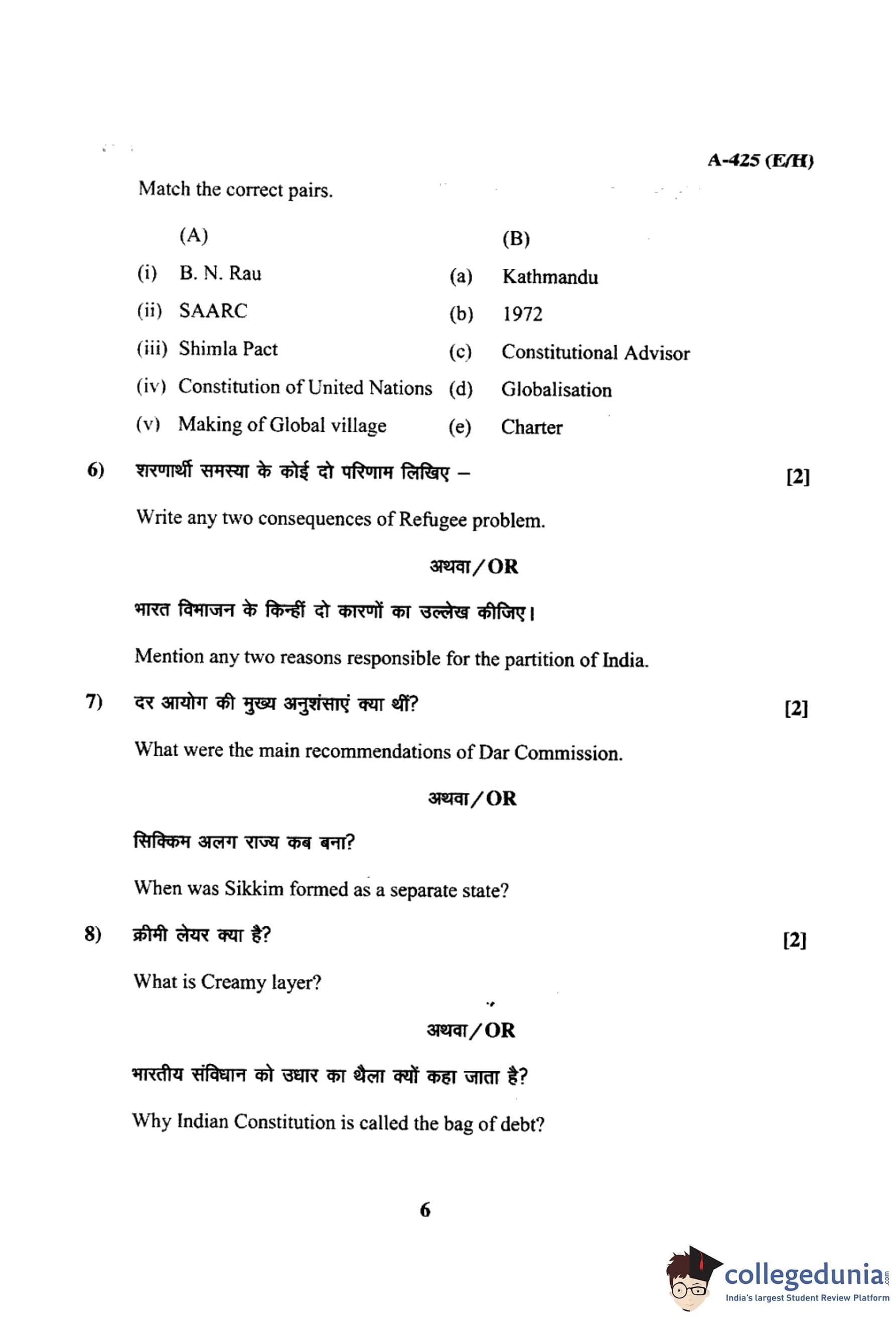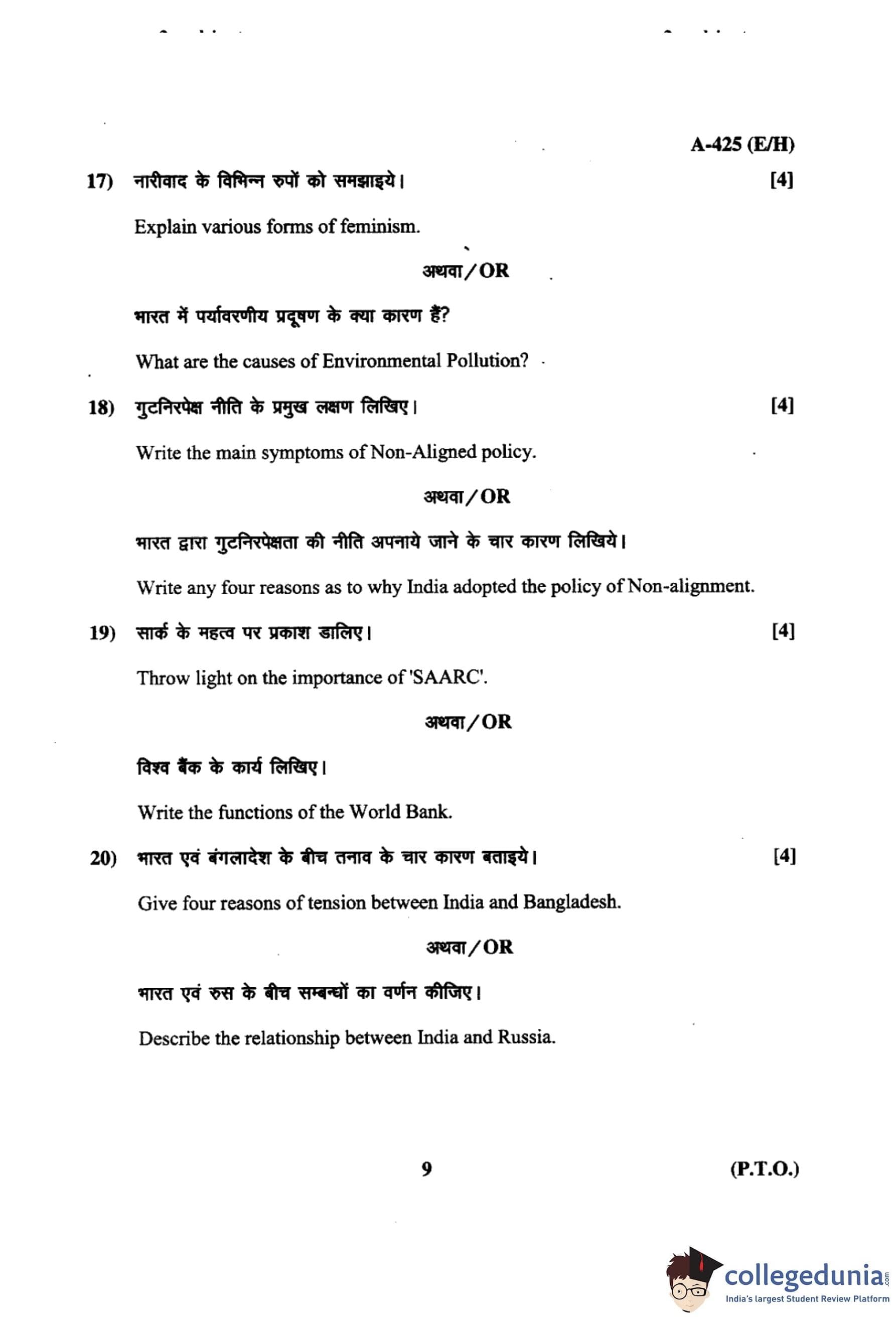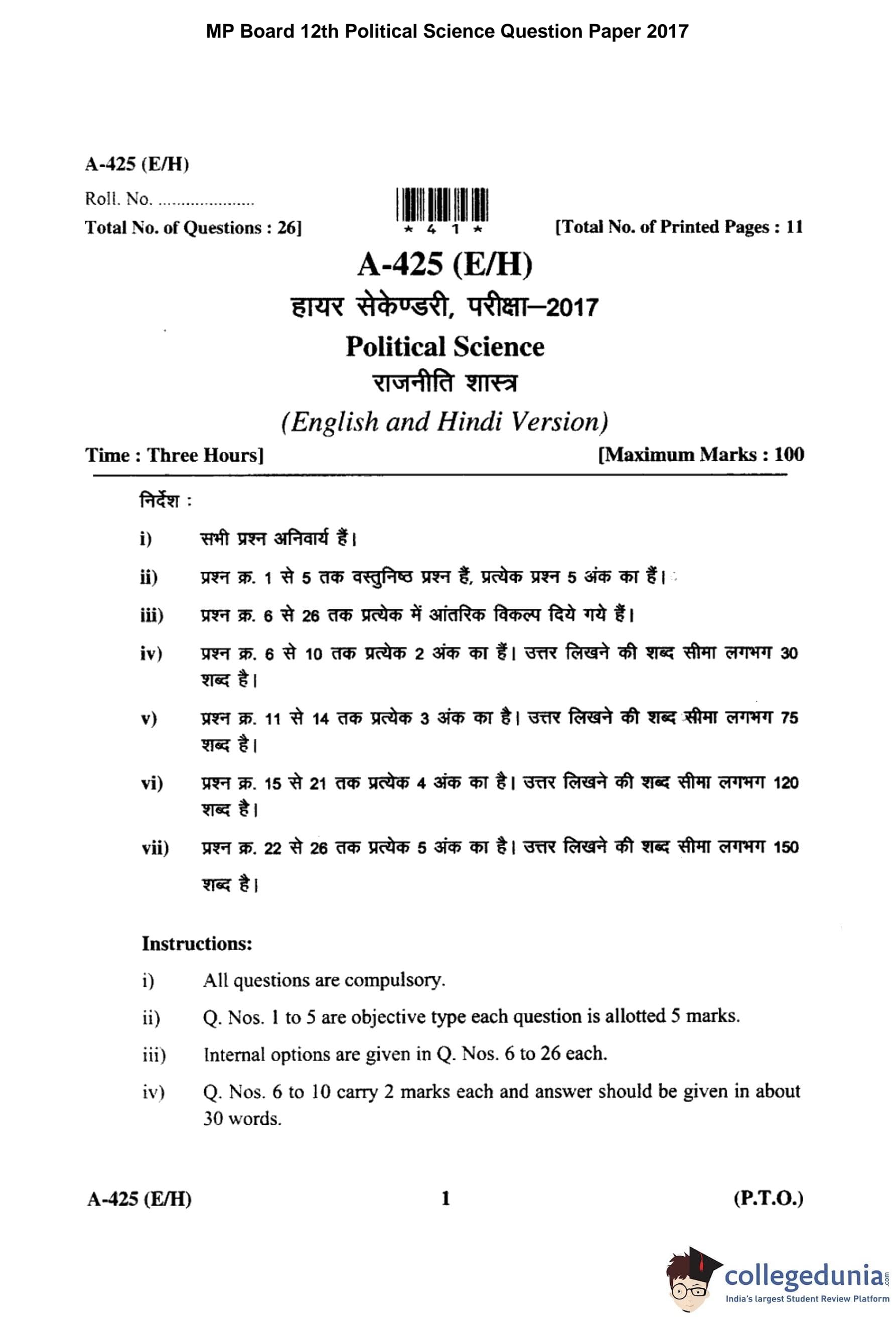 MP Board 12th Political Science Question Paper 2017 with Answer Key