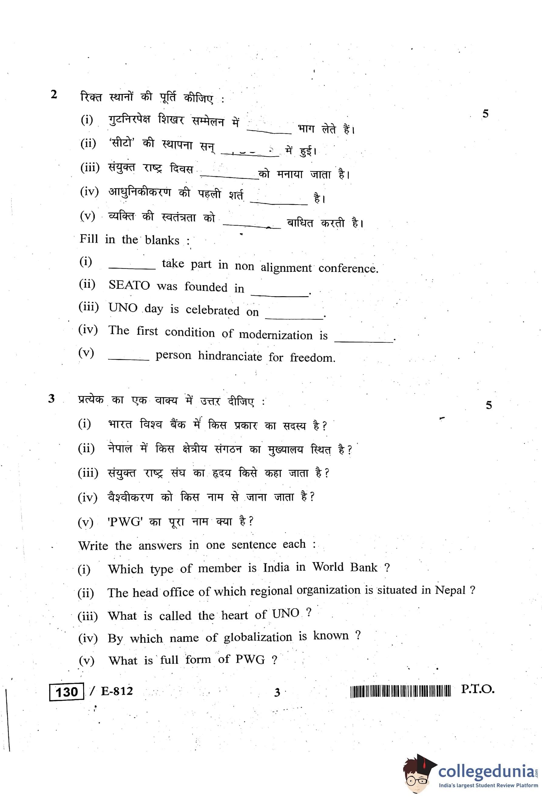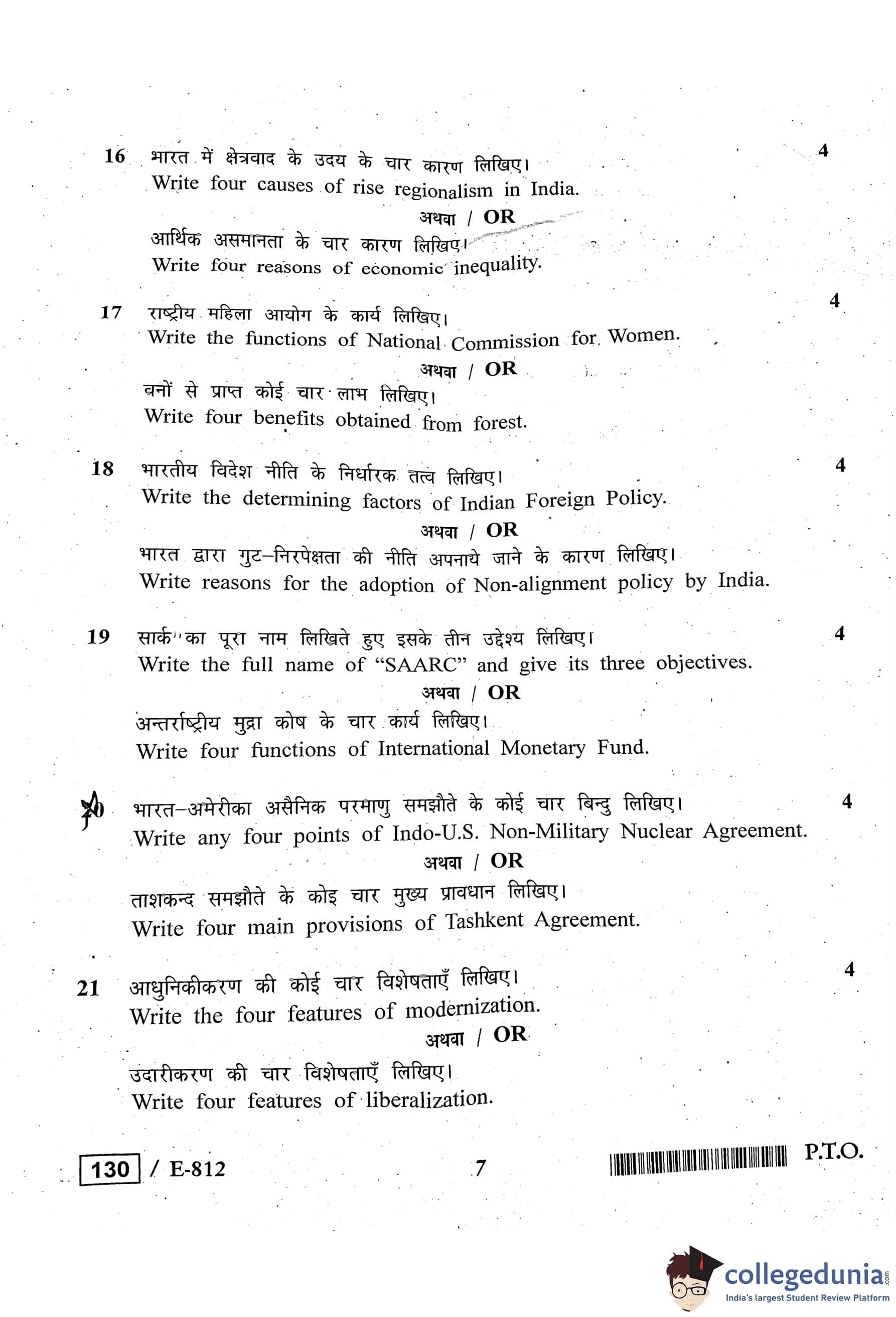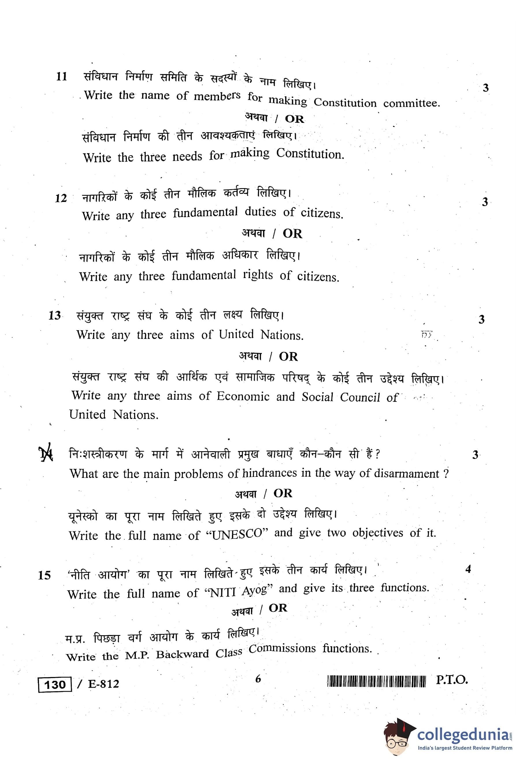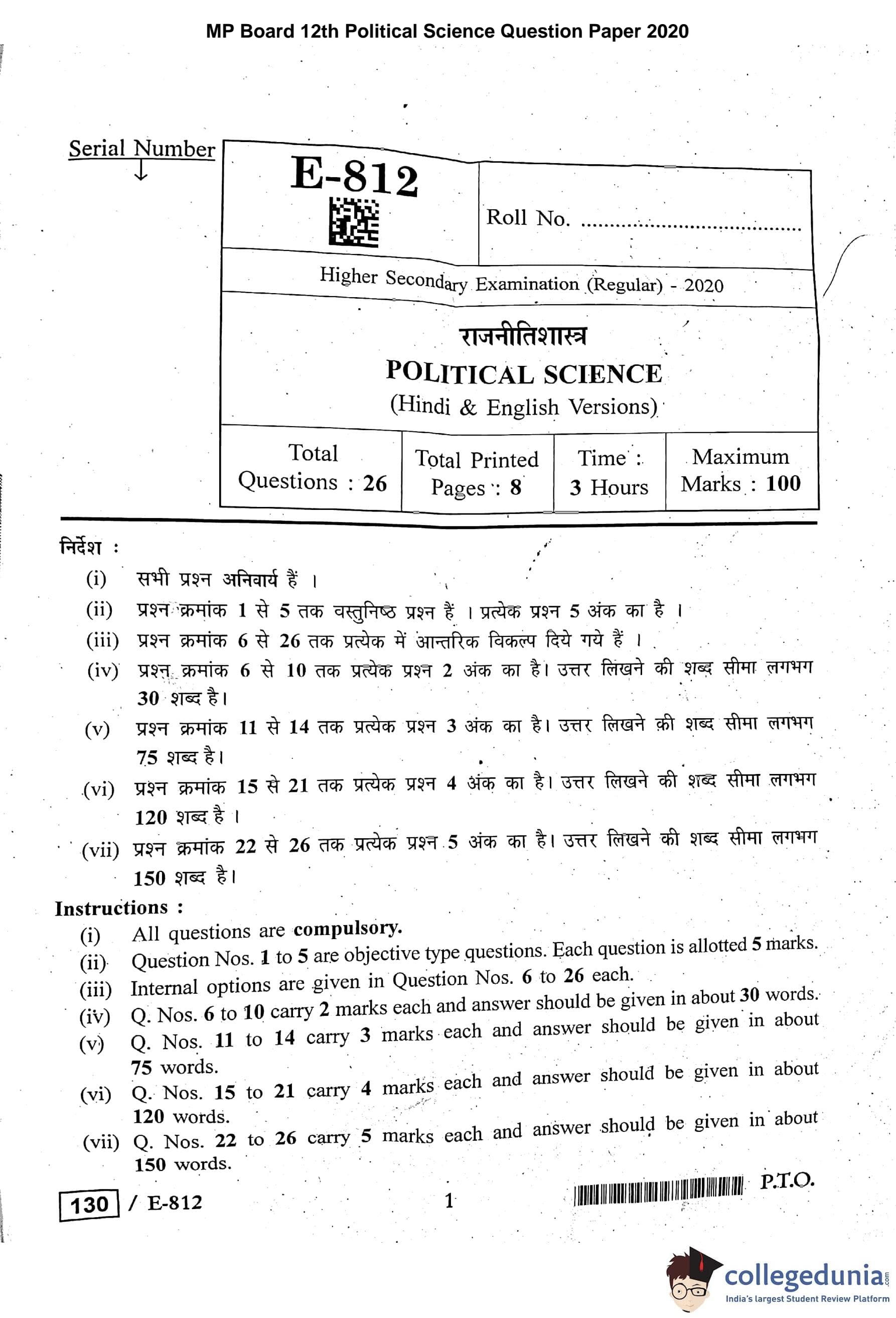 MP Board 12th Political Science Question Paper 2020 with Answer Key
