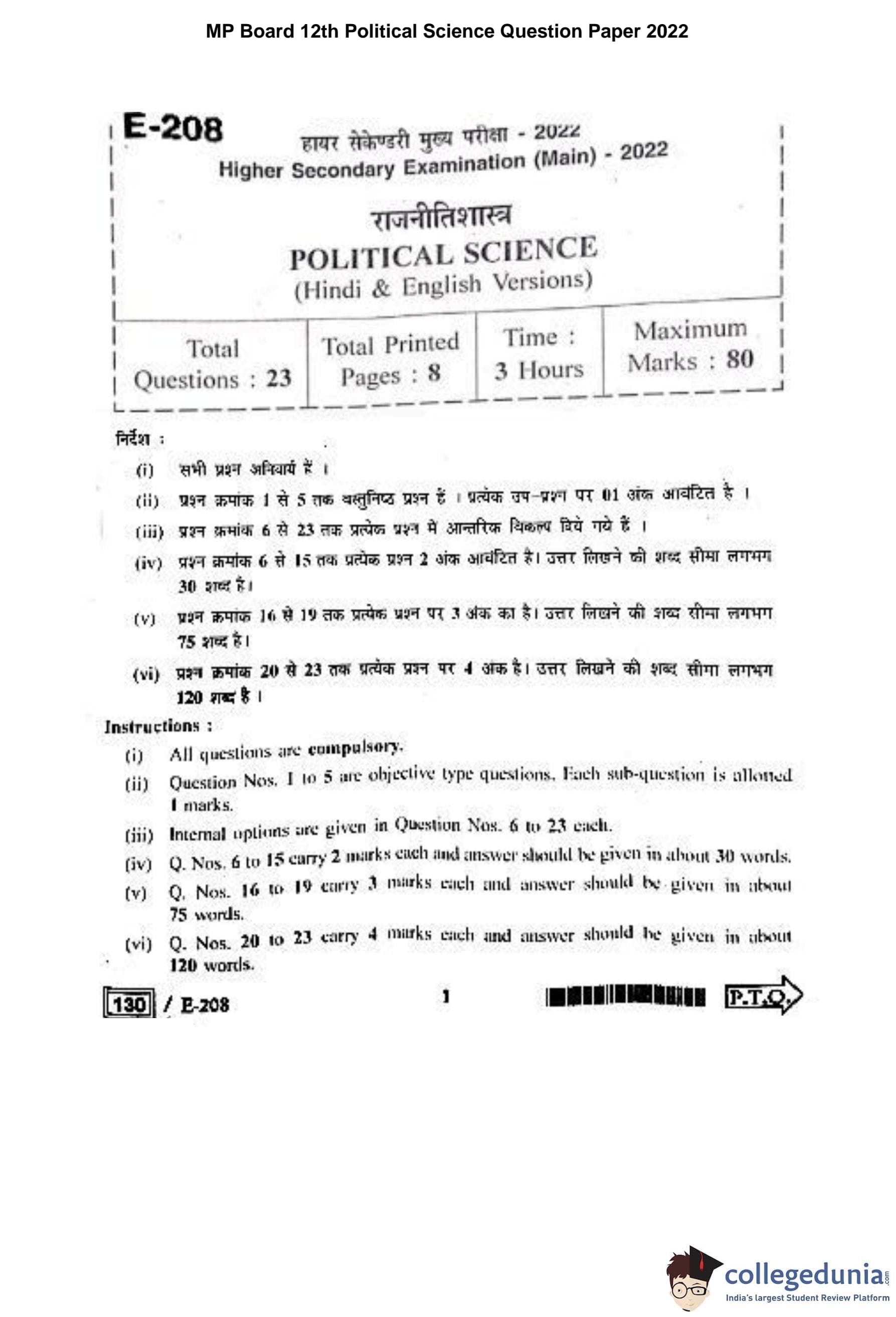 | MP Board 12th Political Science Question Paper 2022 PDF | MP Board 12th Political Science Answer Key 2022 PDF |
