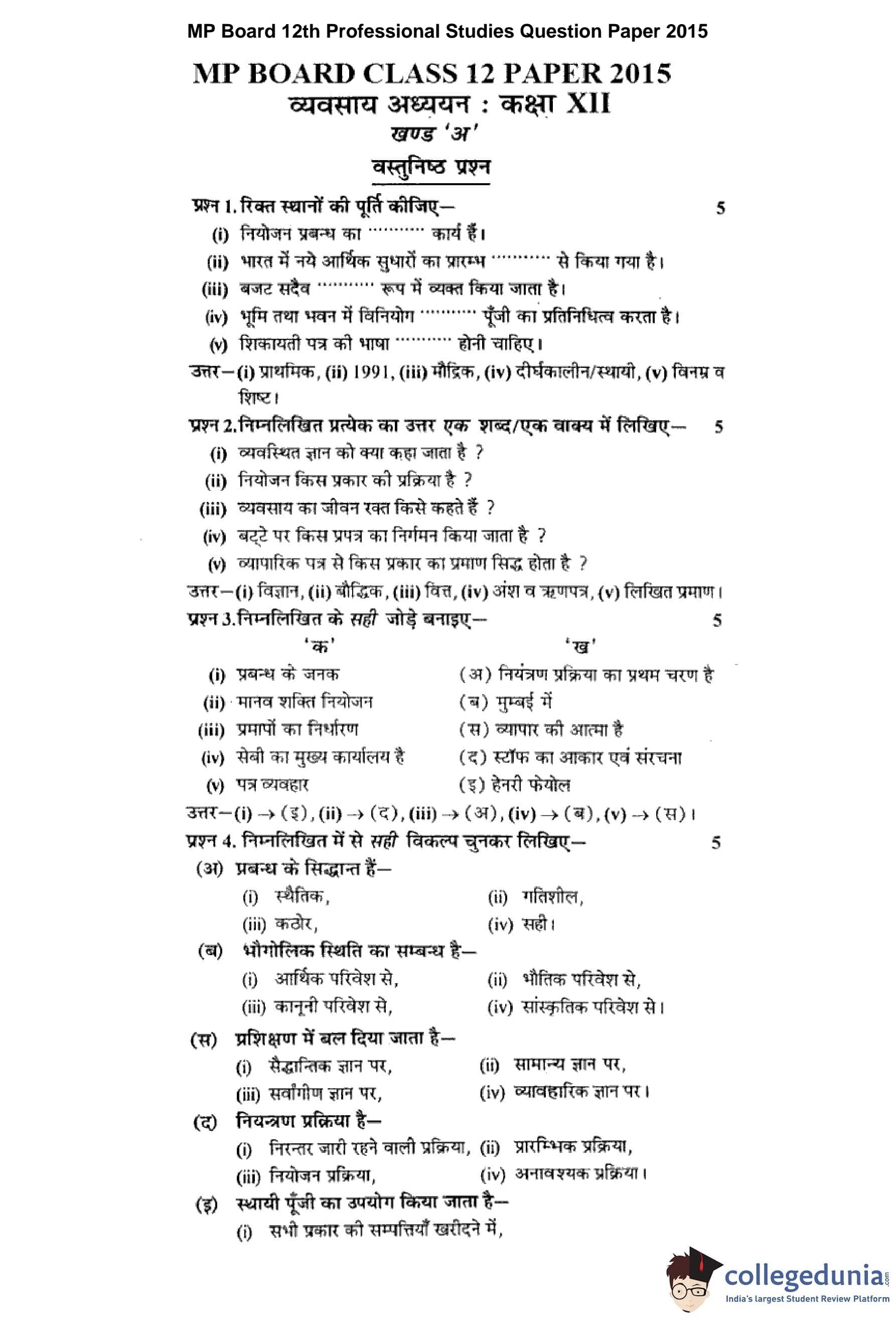 MP Board 12th Professional Studies Question Paper 2015 with Answer Key pdf is available for download here. The exam was conducted by Madhya Pradesh Board of Secondary Education, MPBSE. The question paper comprised a total of 24 questions divided among 2 sections.